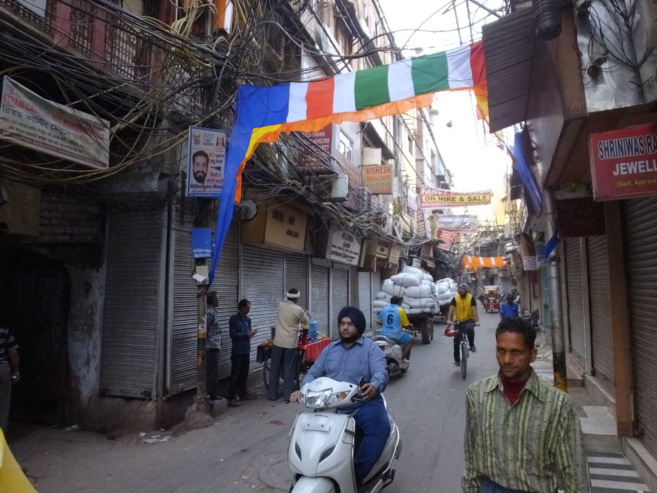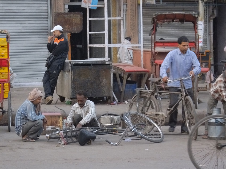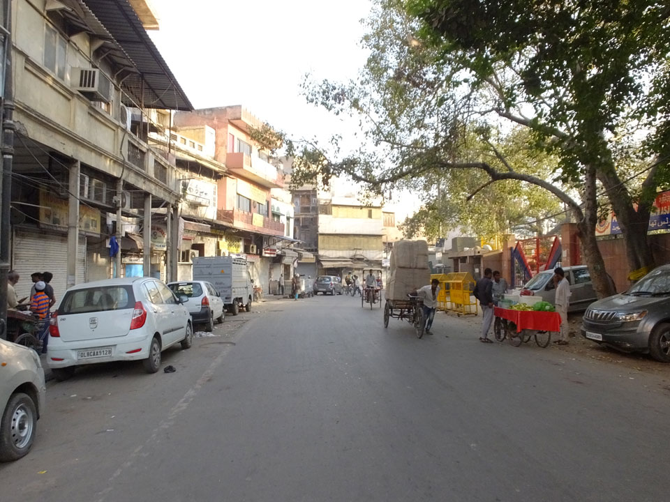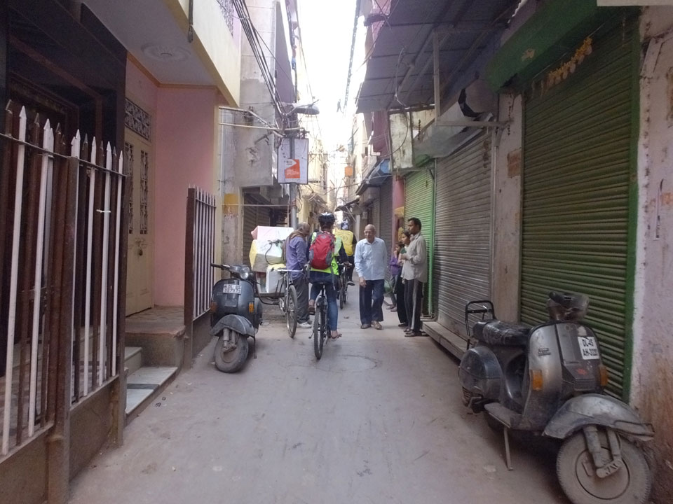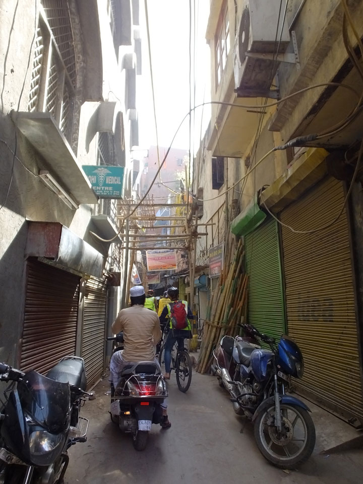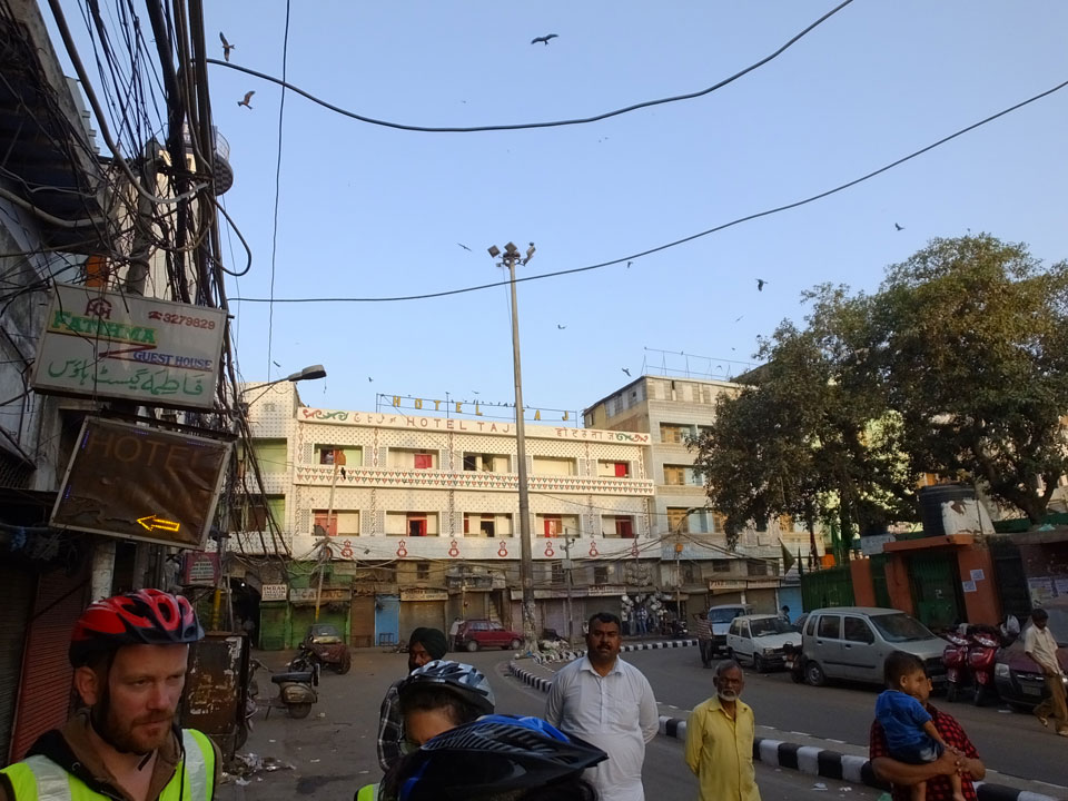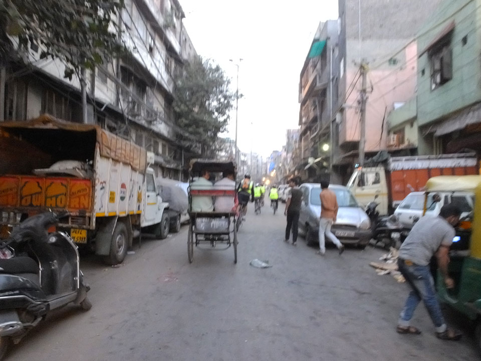 Der Taxifahrer kam nach 5:30 und fuhr uns zum Start der Radeltour in’s alte Delhi. Auf den Fußwegen lagen viele Leute, die noch schliefen. Alles sehr rämlich und eine andere Gegend.