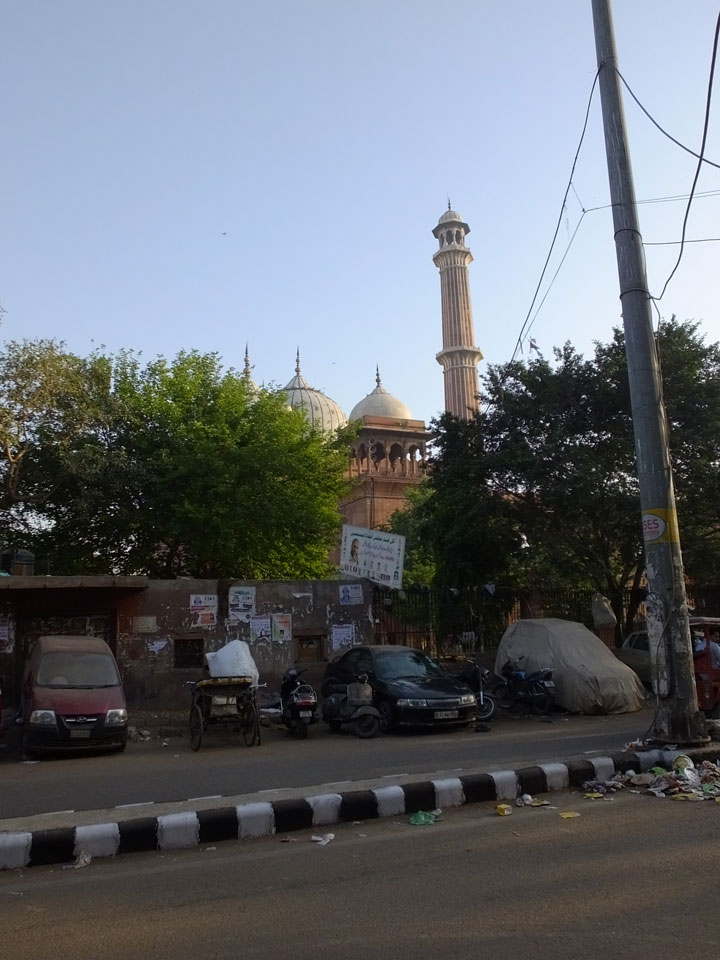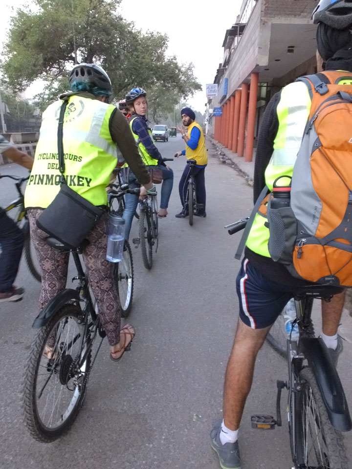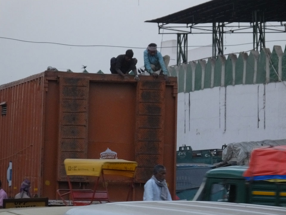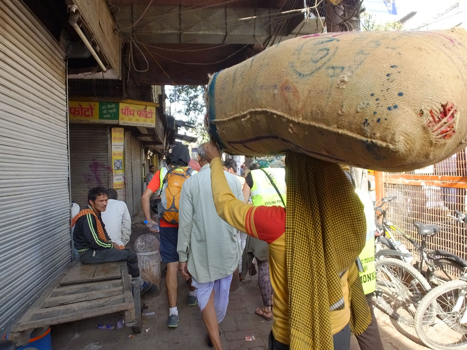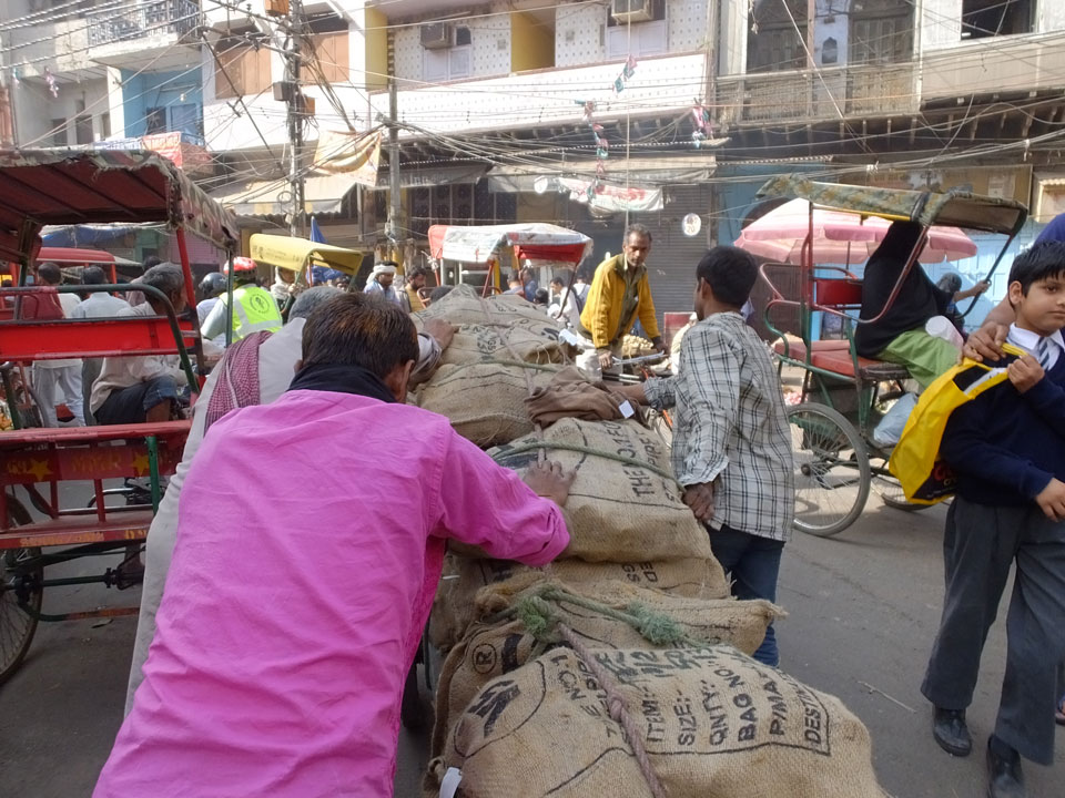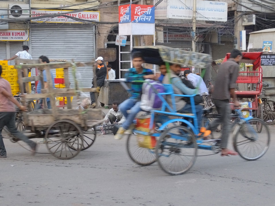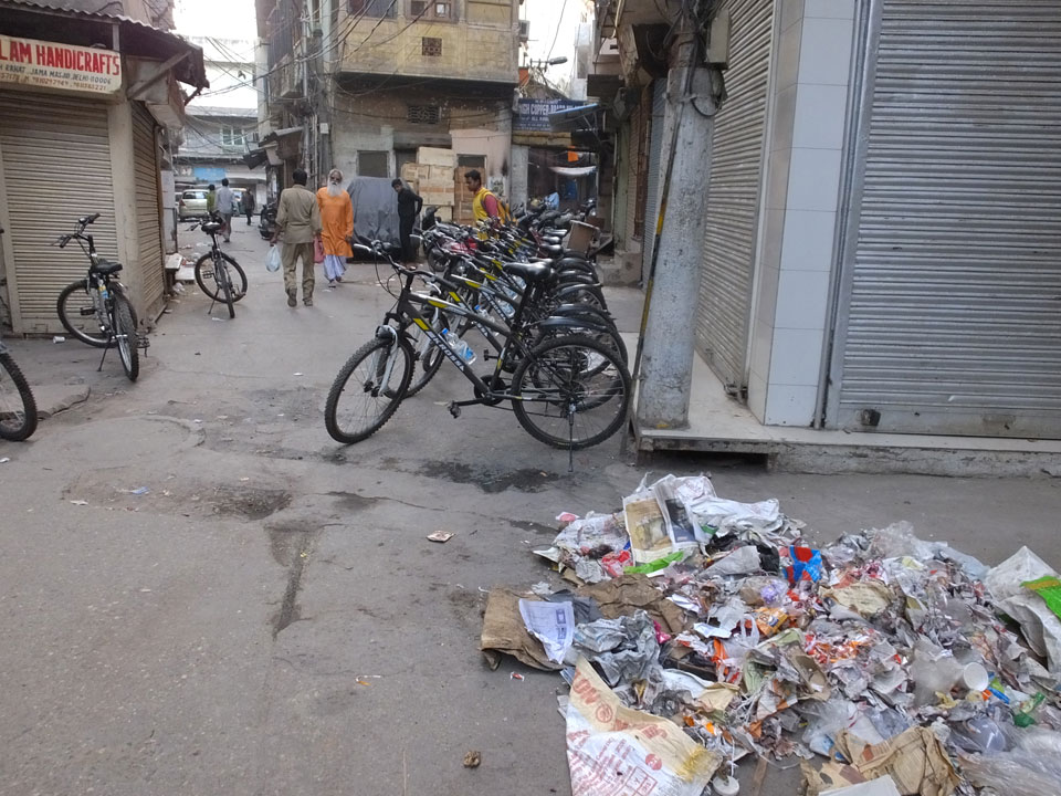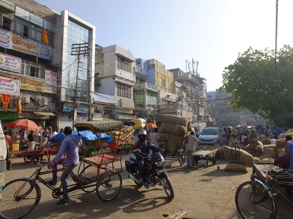 Der Taxifahrer kam nach 5:30 und fuhr uns zum Start der Radeltour in’s alte Delhi. Auf den Fußwegen lagen viele Leute, die noch schliefen. Alles sehr rämlich und eine andere Gegend.