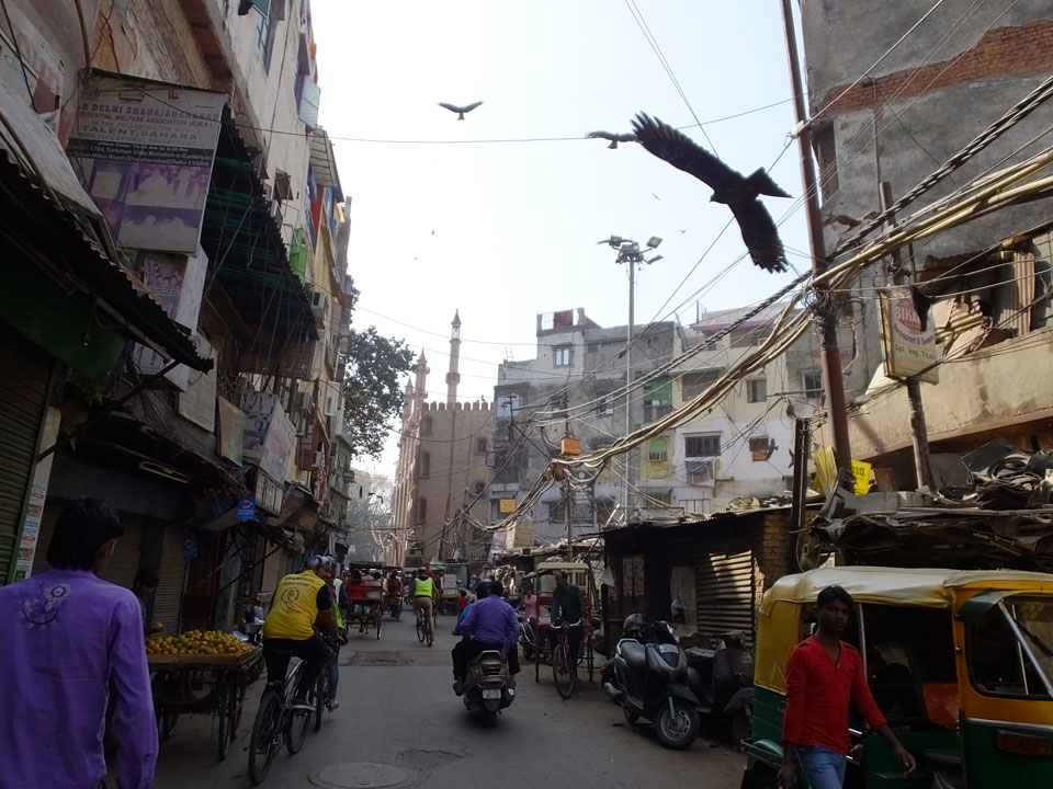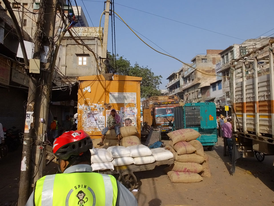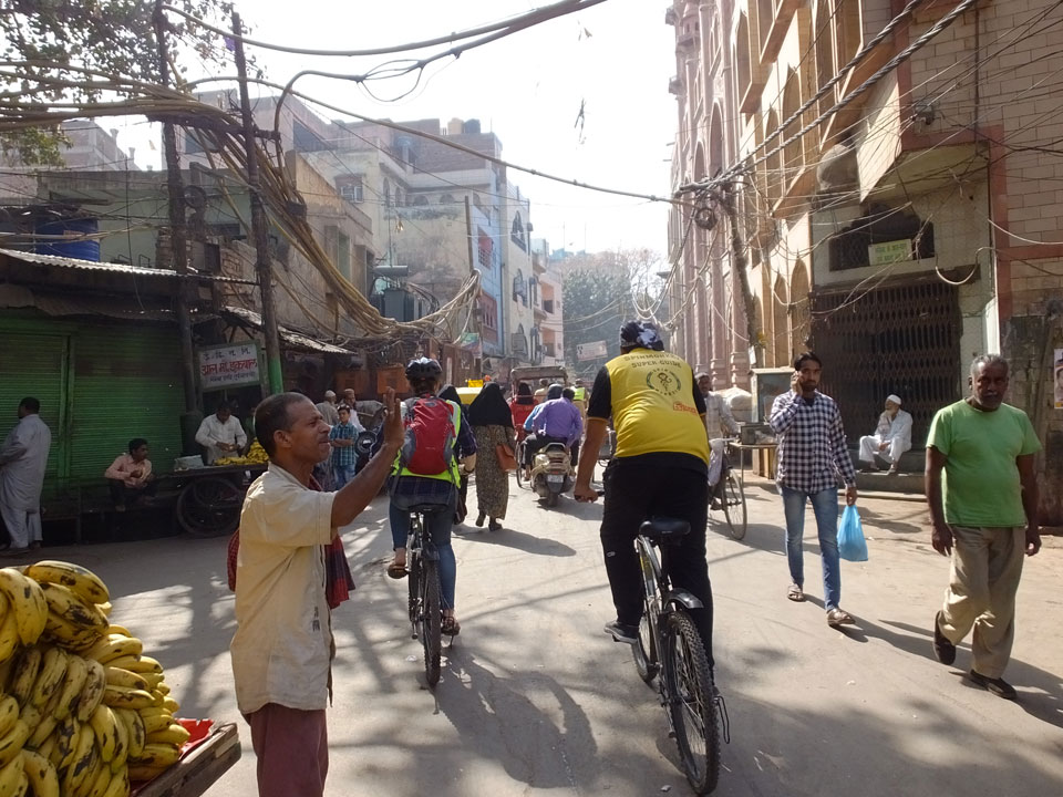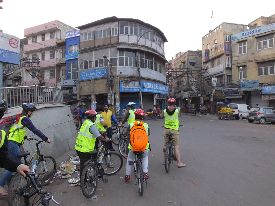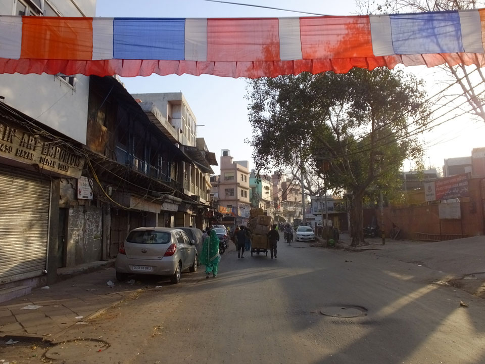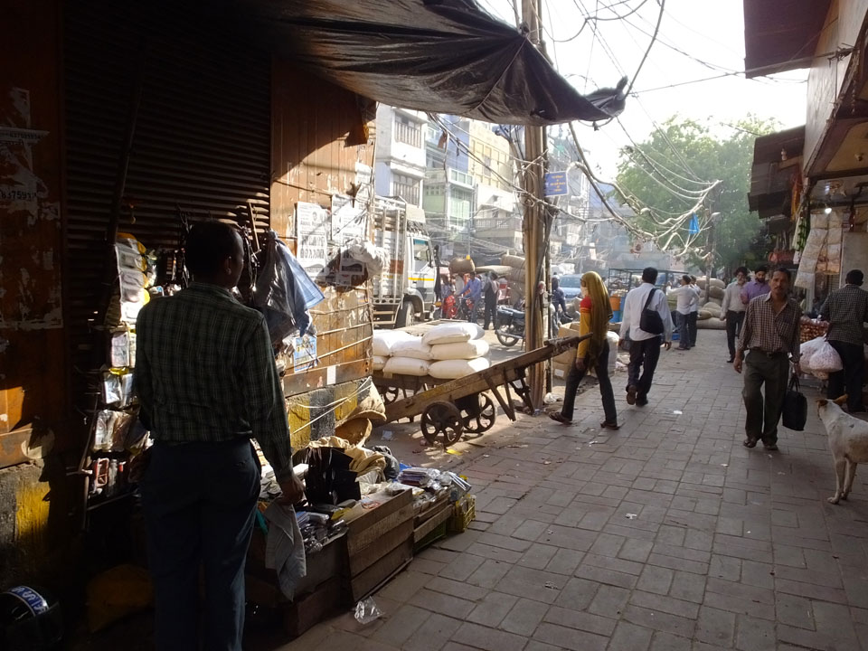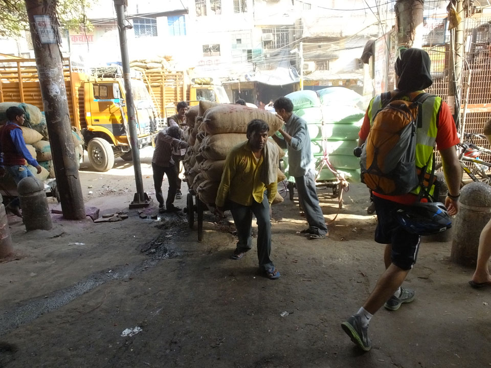 Der Taxifahrer kam nach 5:30 und fuhr uns zum Start der Radeltour in’s alte Delhi. Auf den Fußwegen lagen viele Leute, die noch schliefen. Alles sehr rämlich und eine andere Gegend.