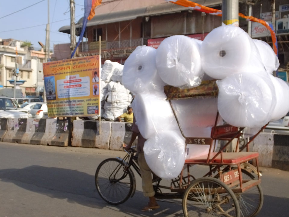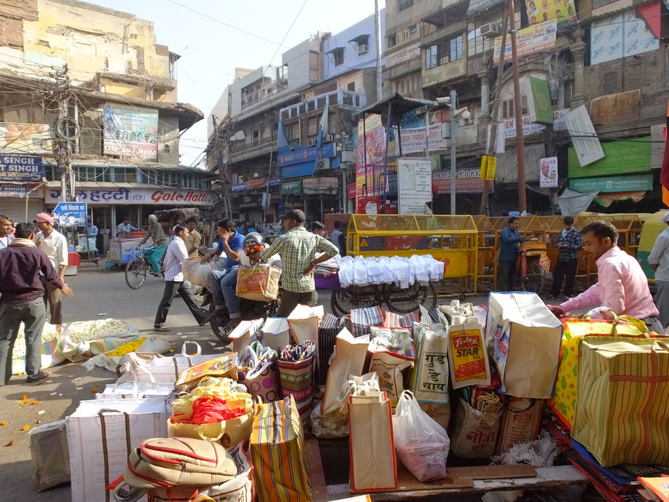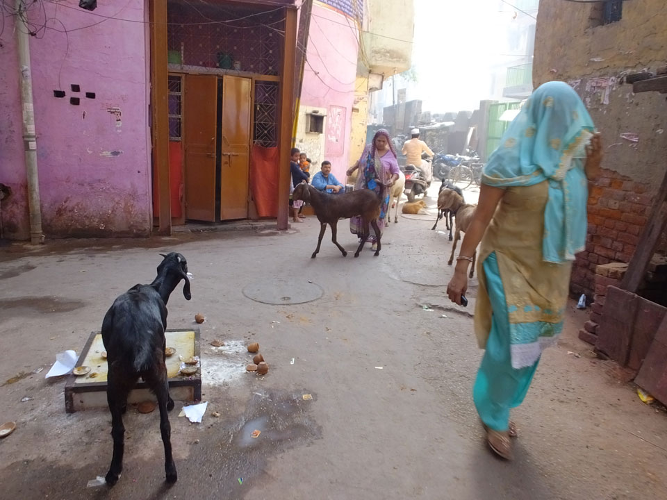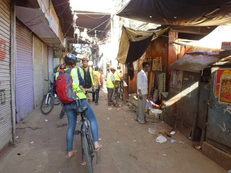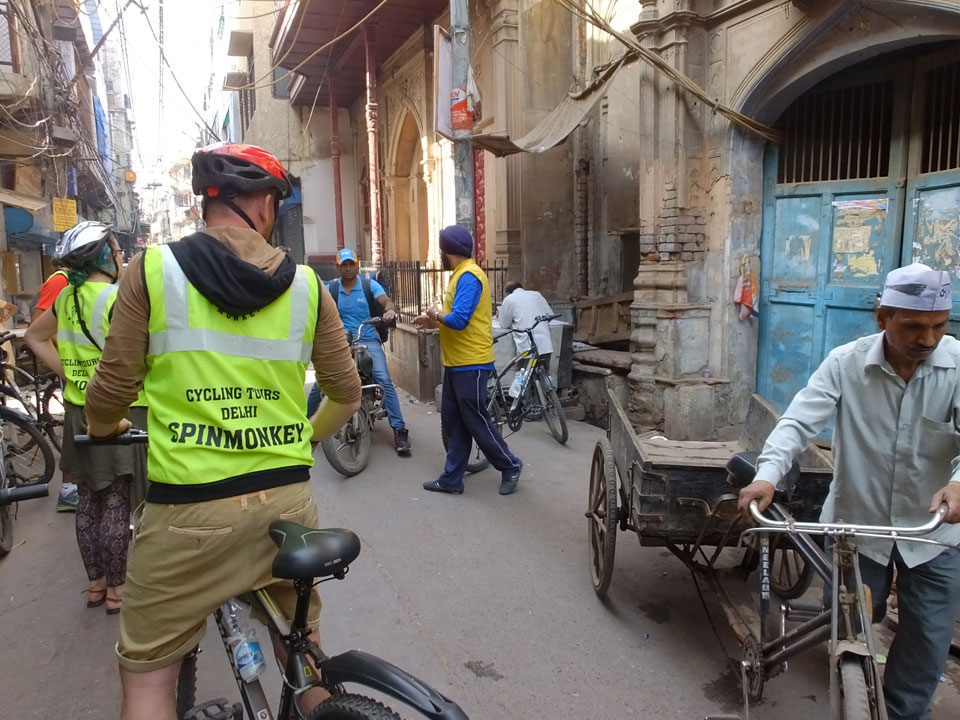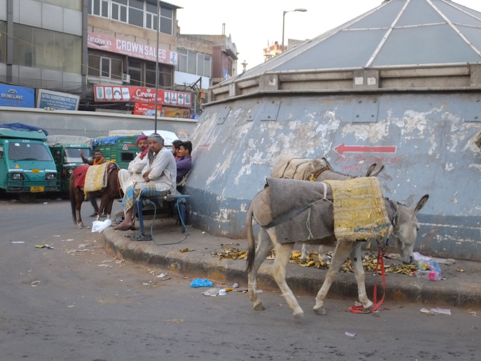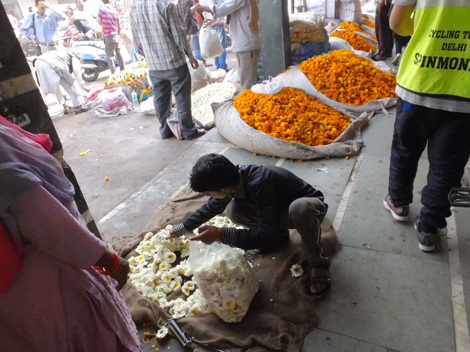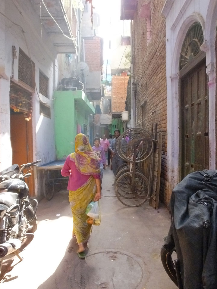 Der Taxifahrer kam nach 5:30 und fuhr uns zum Start der Radeltour in’s alte Delhi. Auf den Fußwegen lagen viele Leute, die noch schliefen. Alles sehr rämlich und eine andere Gegend.