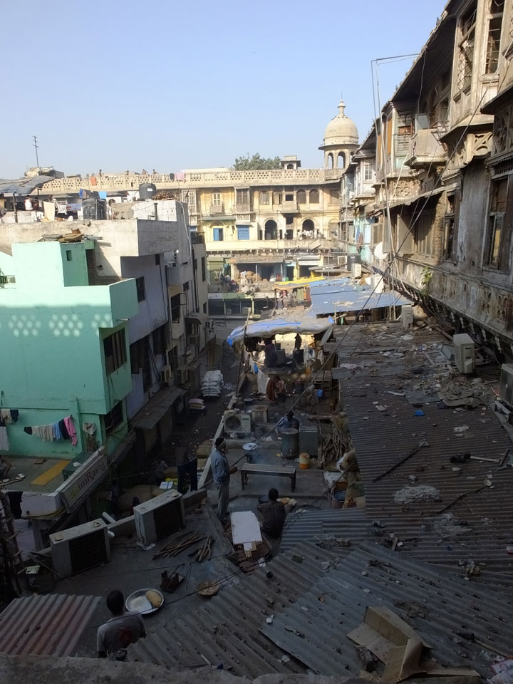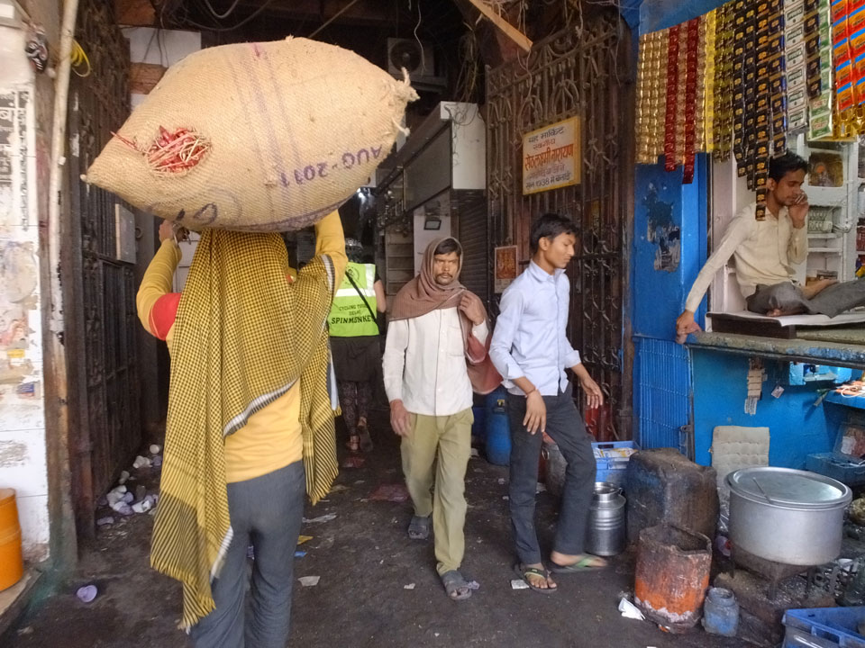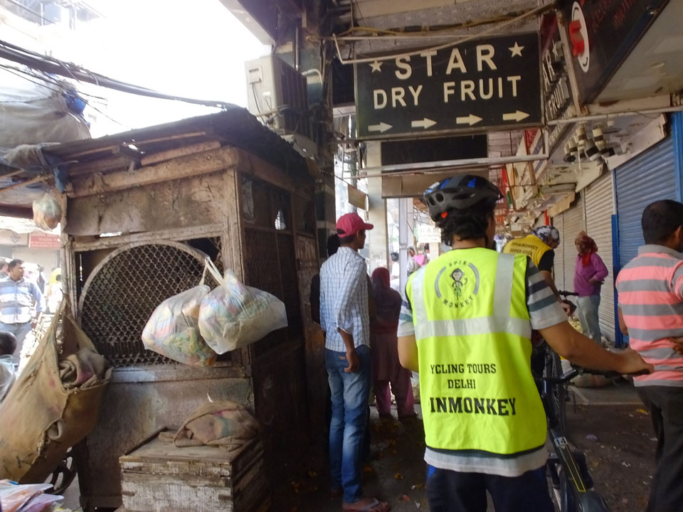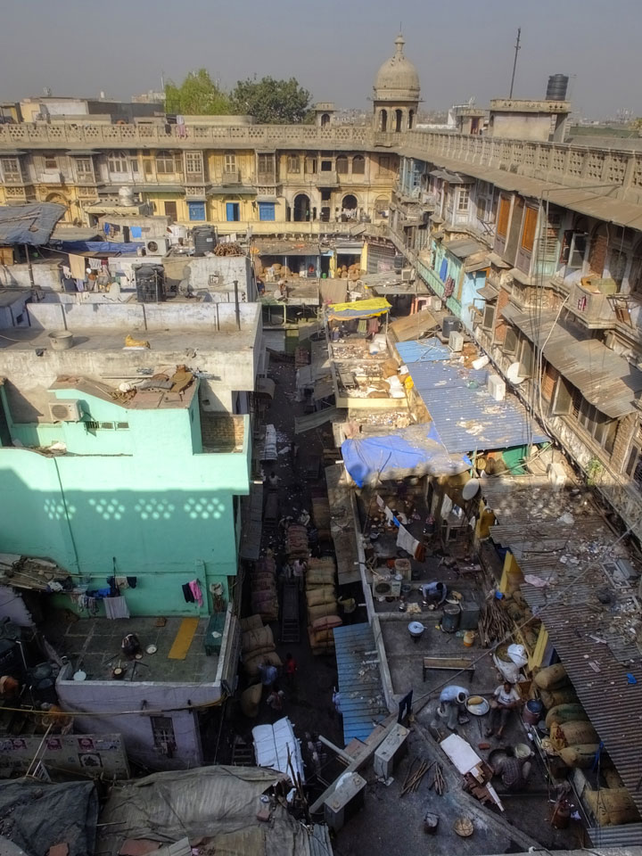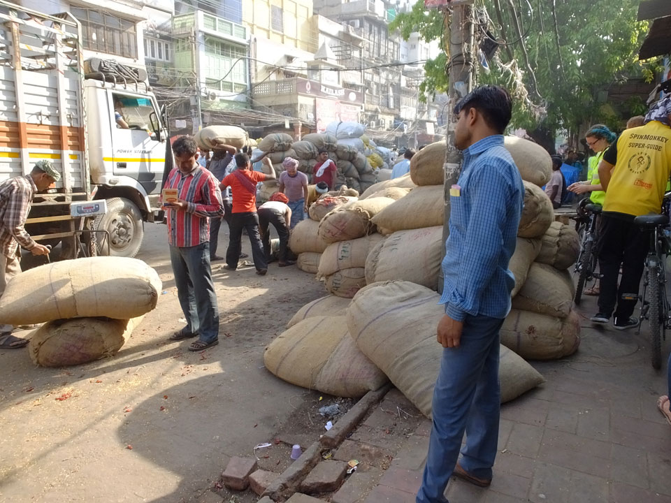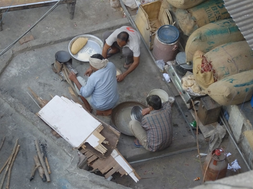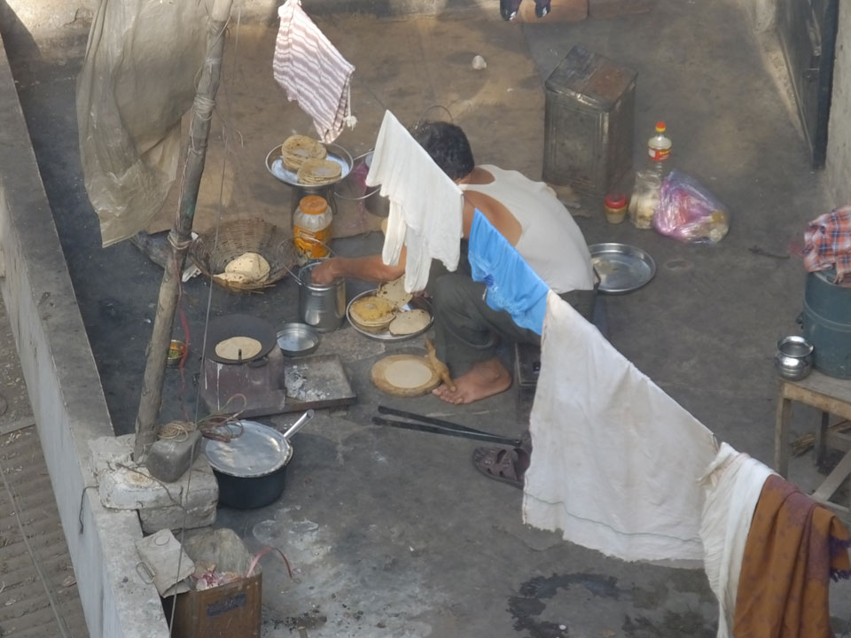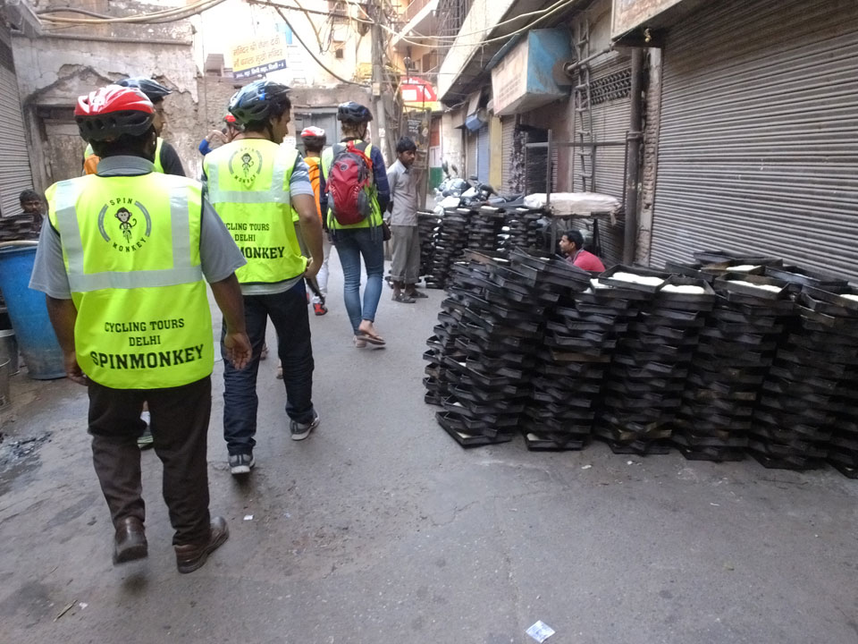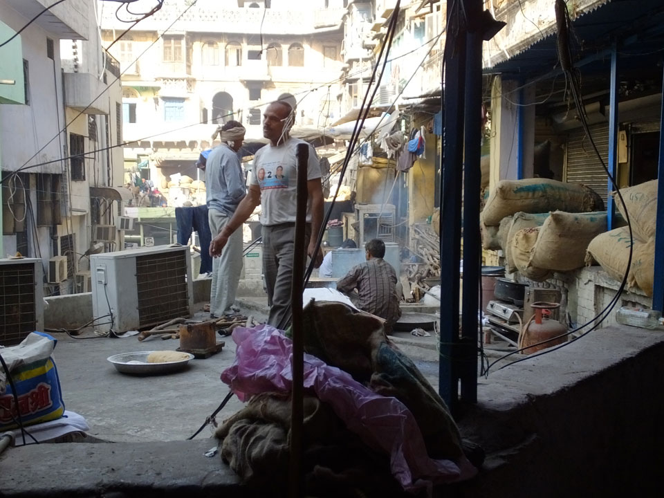 Die Tour ging langsam zu Ende. Cool war auch ein versteckter Weg in ein altes Haus auf das Dach. Von dort sah man in den Innenhof des größten Gewürzmarktes. Die Luft war voller Chillipulver. Niesen, wie bei Heuschnupfen und ein Kratzen im Hals. Der Markt ist sein mehreren hundert Jahren in Betrieb, ohne Pause. Von da oben sah man die Leute ihr Frühstück bereiten. Teilkugeln wurden ausgerollt, auf Feueröfen gebacken.