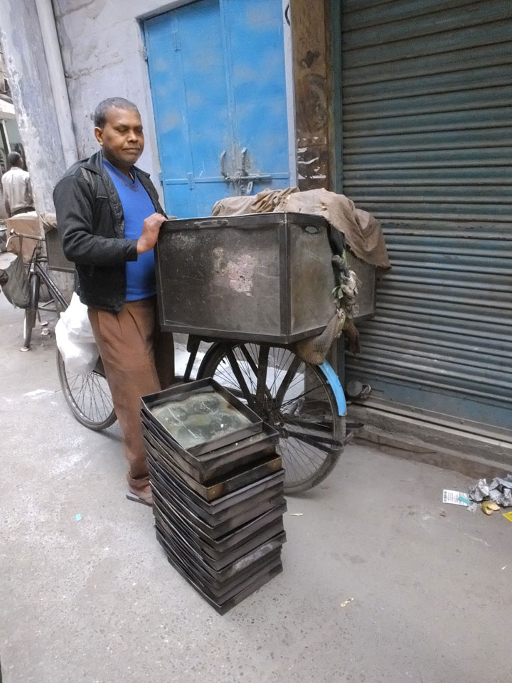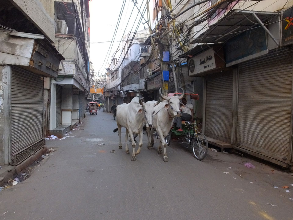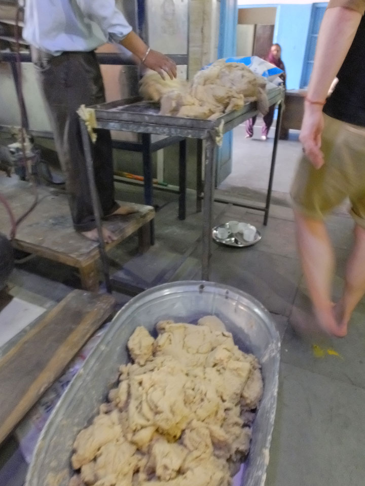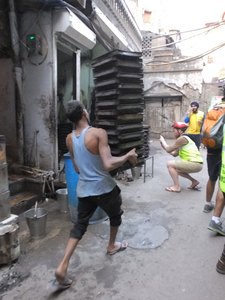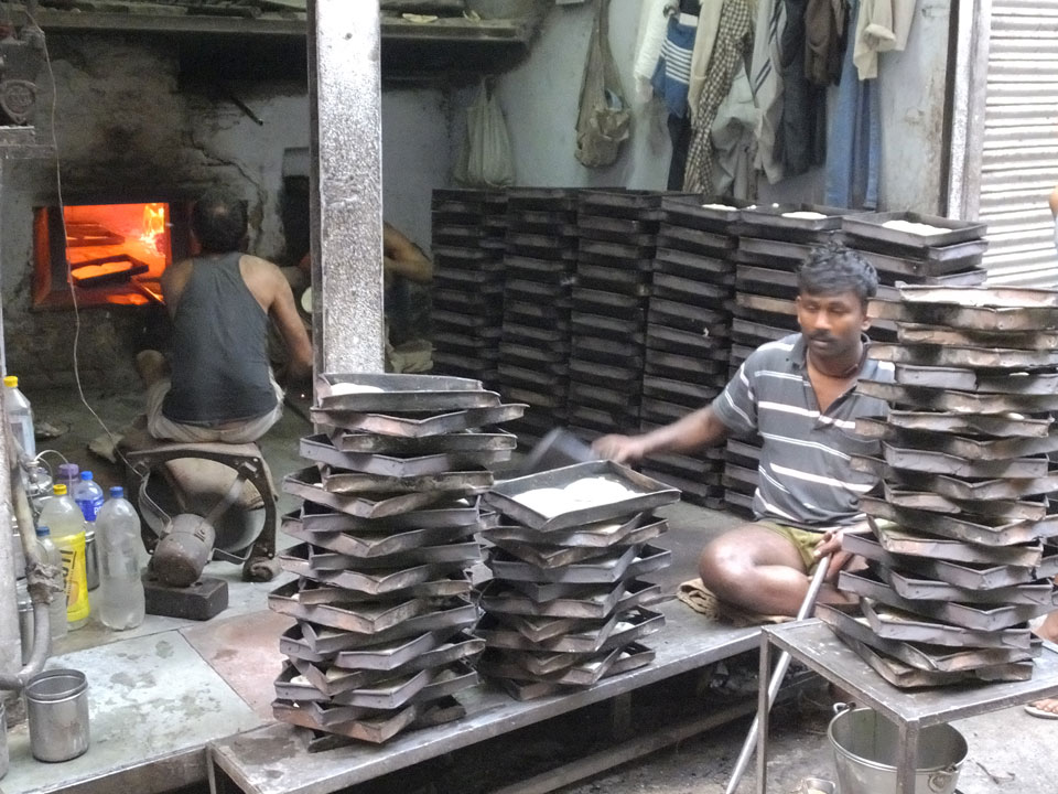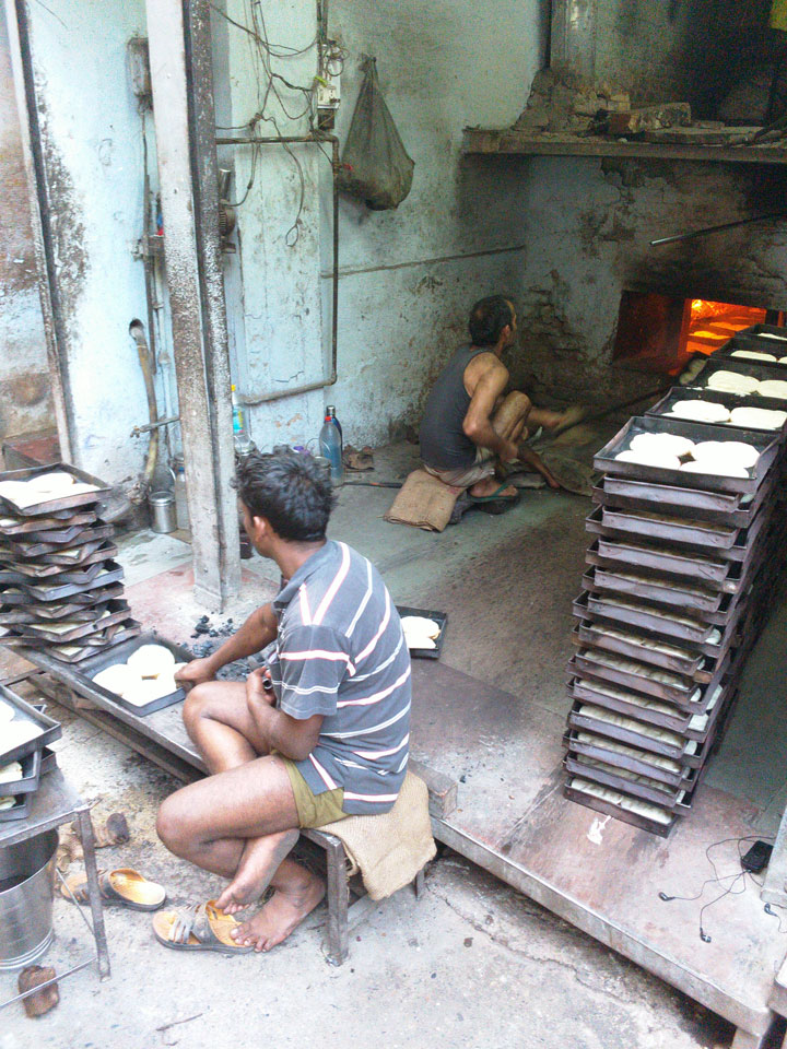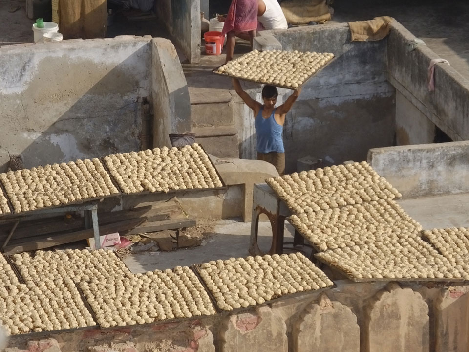In den noch leeren Straßen Alt Delhis war die Atmosphäre vor Sonnenaufgang fantastisch. So, wie in alten indischen Filmen auf den Straßen mit vielen Rikshas und Karren. Einige wurden von Wasserbüffeln gezogen, wie schon vor hunderten Jahren. Wir schauten in einer der zwei größten Borfabriken vorbei, wo tausende Fladen gebacken wurden. Das ging in einem fixen Tempo. Den leicht säuerliche Geschmack des frischen Bots kannte ich.