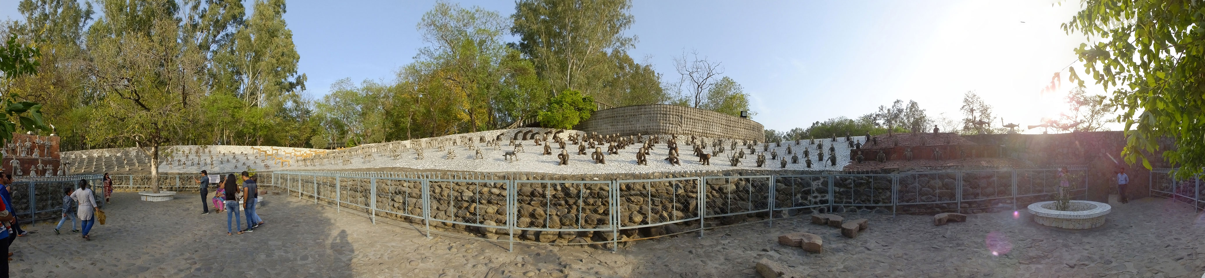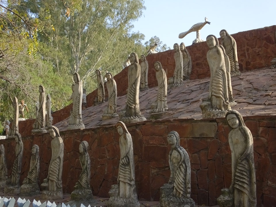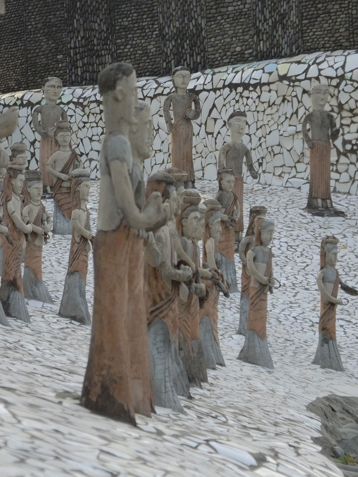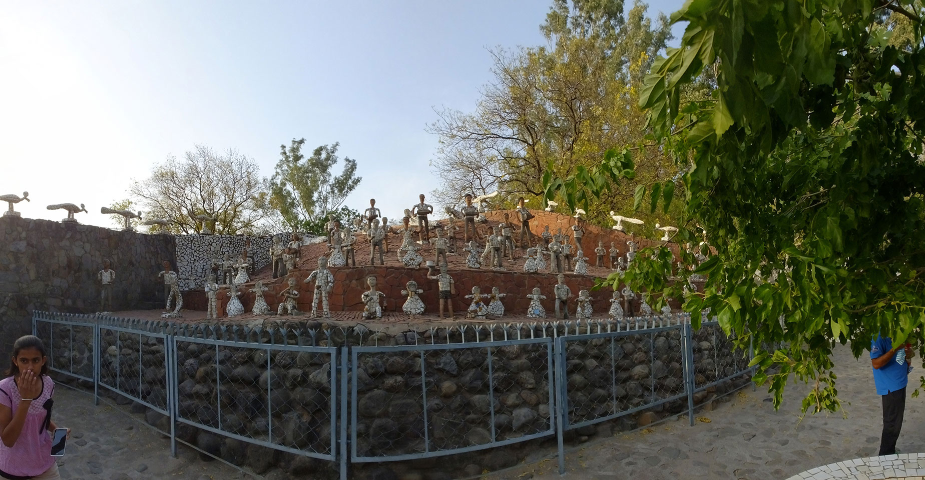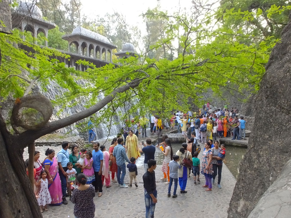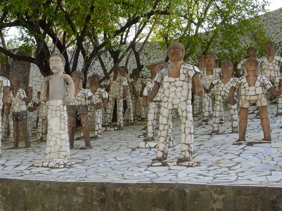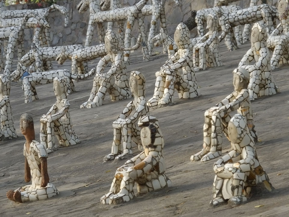 Auf einem großen Areal startete der Weg durch den Park an künstlichen Steinwänden und Wasserfällen. Ein Dorado für Selfie-Liebende Inder und auch für mich. Ich knipste herum in dieser geschaffenen Landschaft, fand dann den Weg zu den vielen Plätzen mit Gruppen von Statuen. Der Künstler gestaltet selten ein einzelnes Exemplar sondern machte oft viele Kopien.