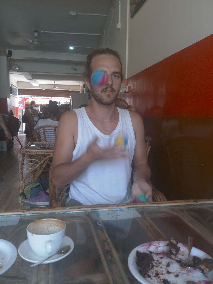 Im Babylon traf ich zuerst eine Zimmergenossin, dann noch einen Ex-Zimmergenossen, der sich jetzt doch ein Privatzimmer geholt hat. Super Jonglier-Skills, mit denen ich im Sitzen überhaupt nicht punkten konnte.