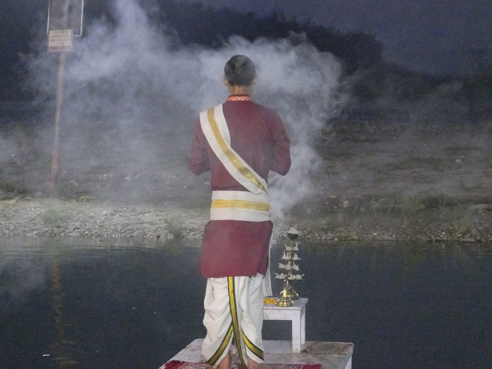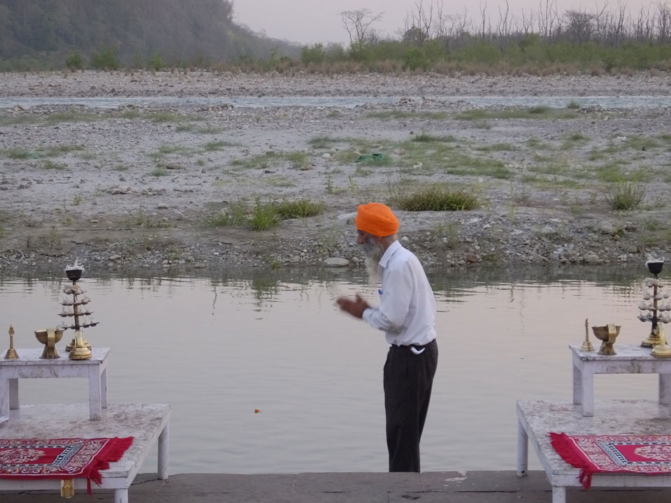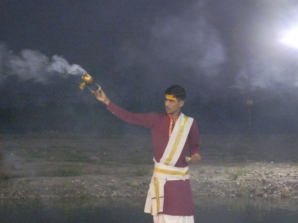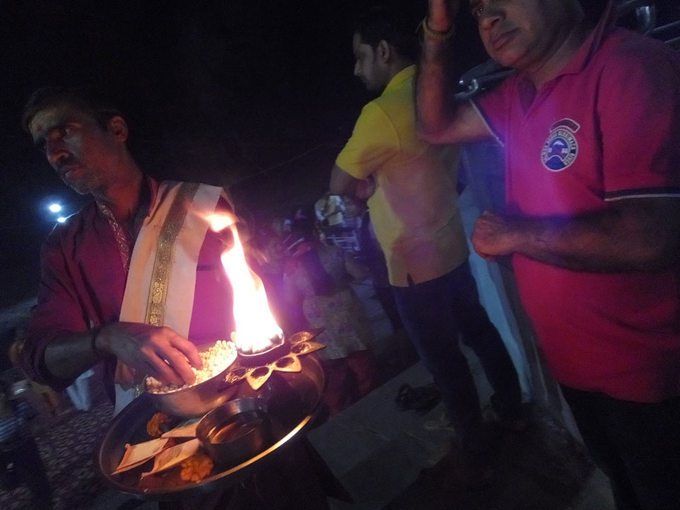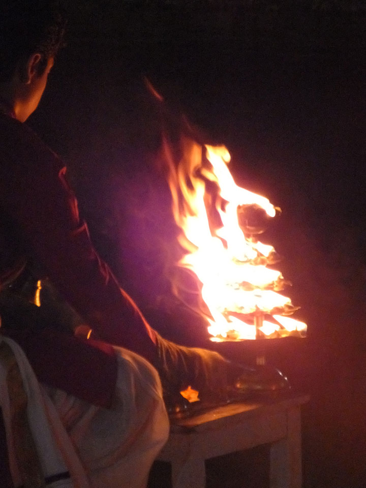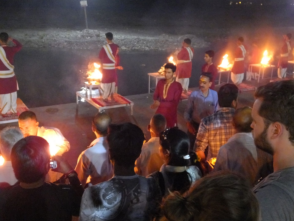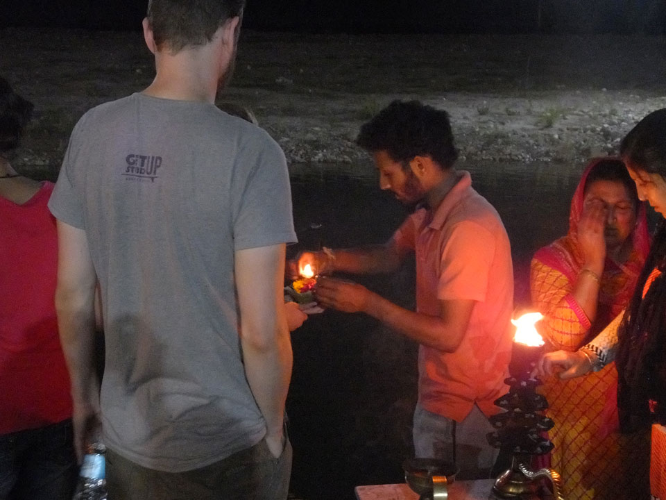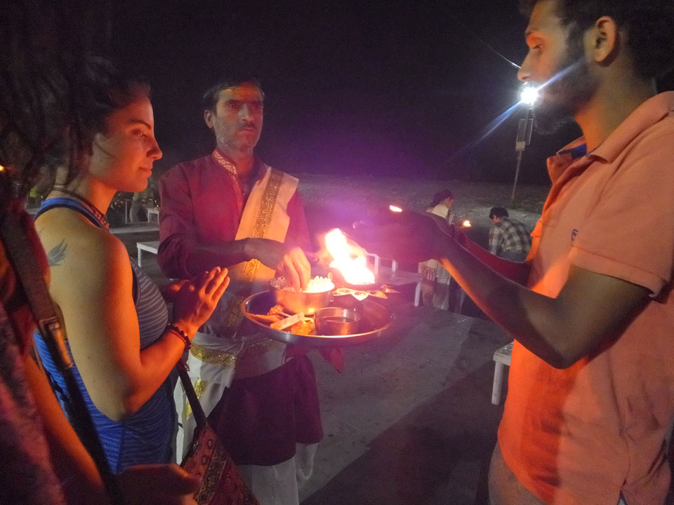 Schon spielte die Musik und dann war die Gebets-Zeremonie auch sehr schön. Nach der Puja, der Feuer-Zeremonie, gingen wir dann. Es gab Zucker und dann schauten wir noch an einem Lassi Shop im Ort vorbei. Ein Tisch zum Abendessen war in einem Restaurant reserviert. Alles echt gut.