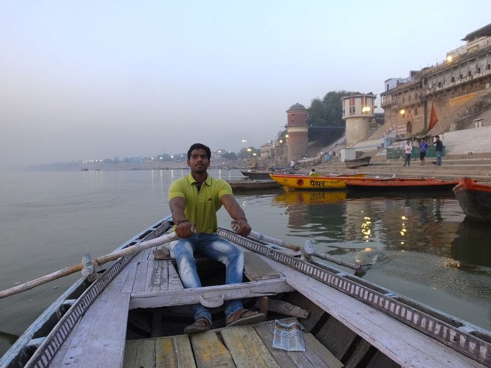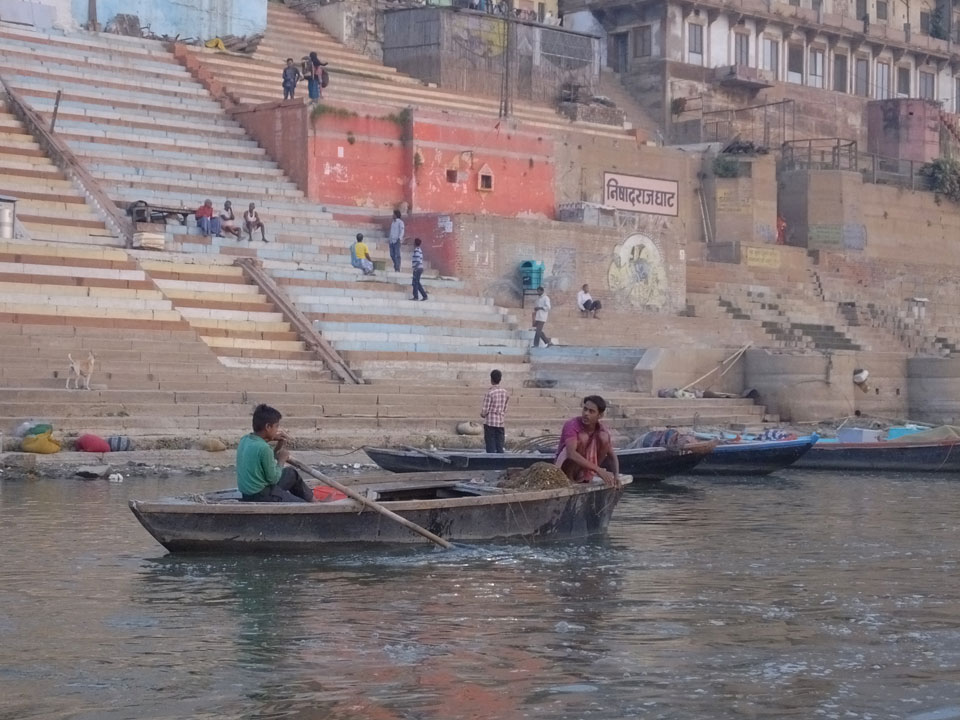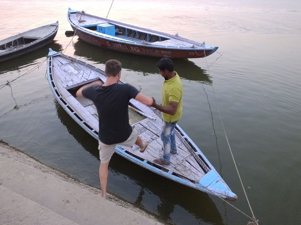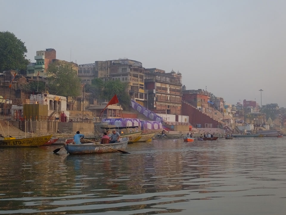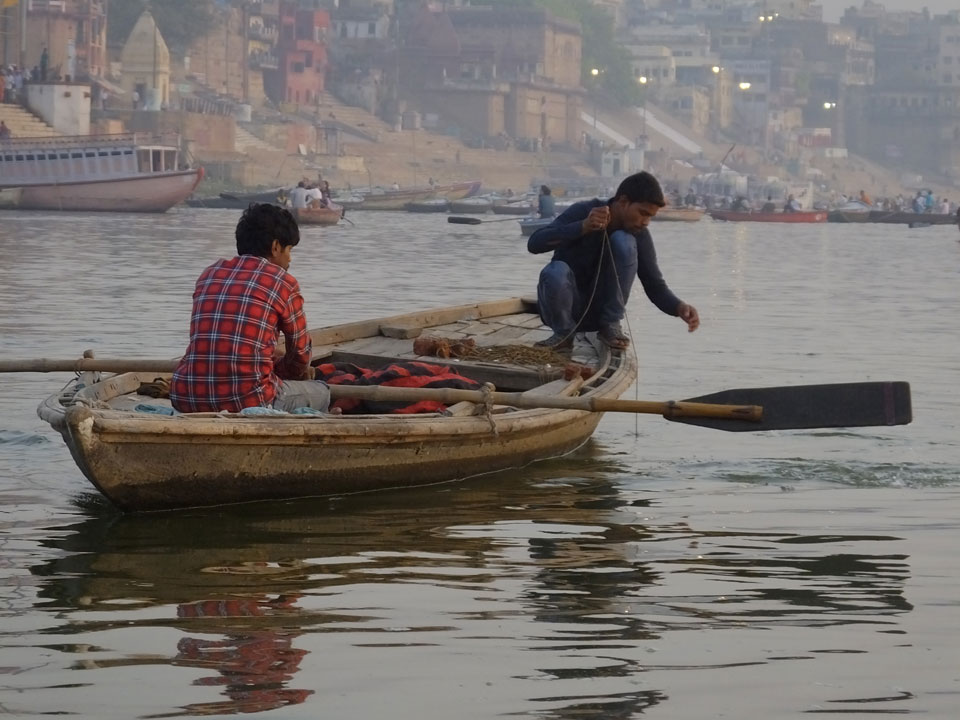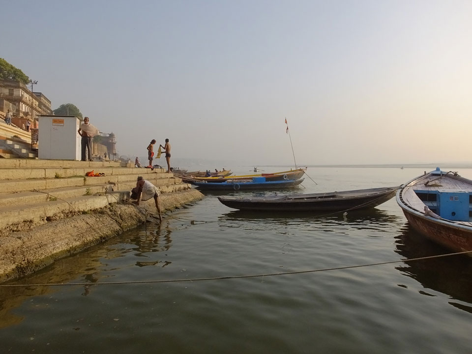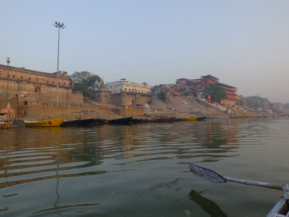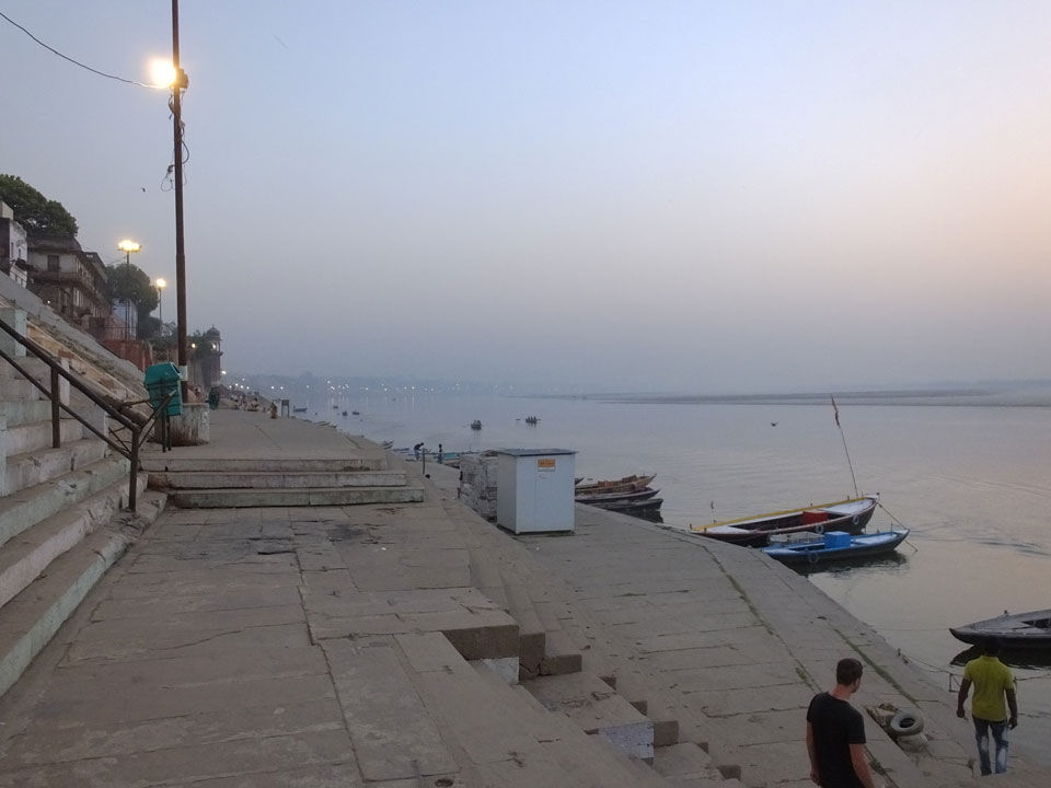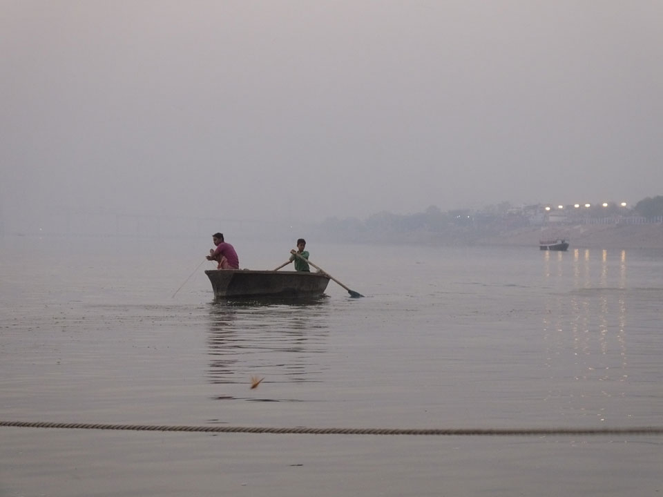 Meinen Wecker hatte ich mit Backups auf 4:35 gestellt. Um 5 war ich tatsächlich unten an der Rezeption, wo auch einige andere Frühaufsteher eintrudelten. Mit einem Zimmergenossen ging es los, unserer Ruderer führte uns zu einem Ghat. Die anderen Leute wurden auf ein anderes Boot gelotst.