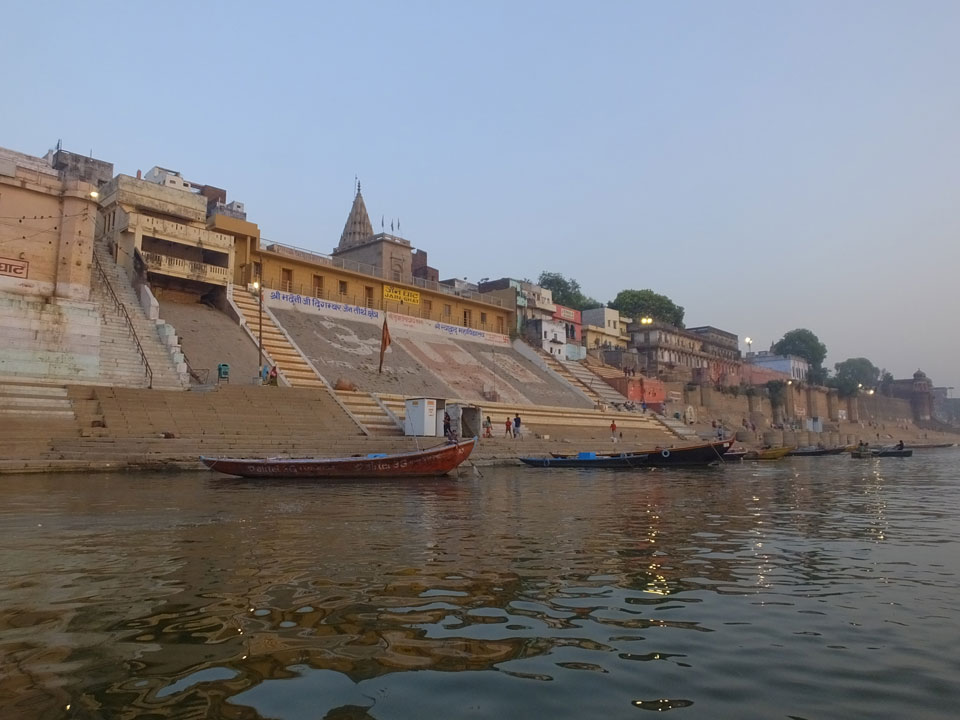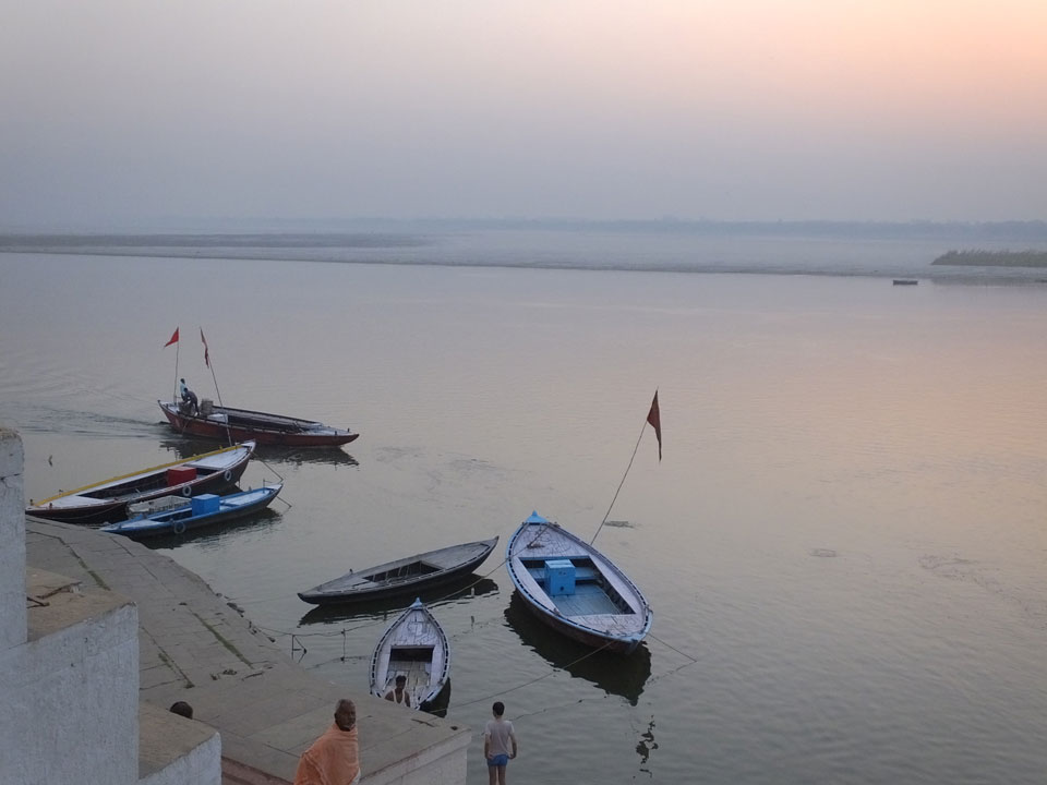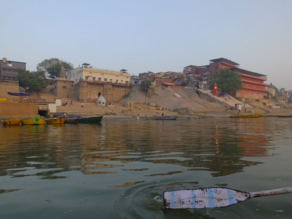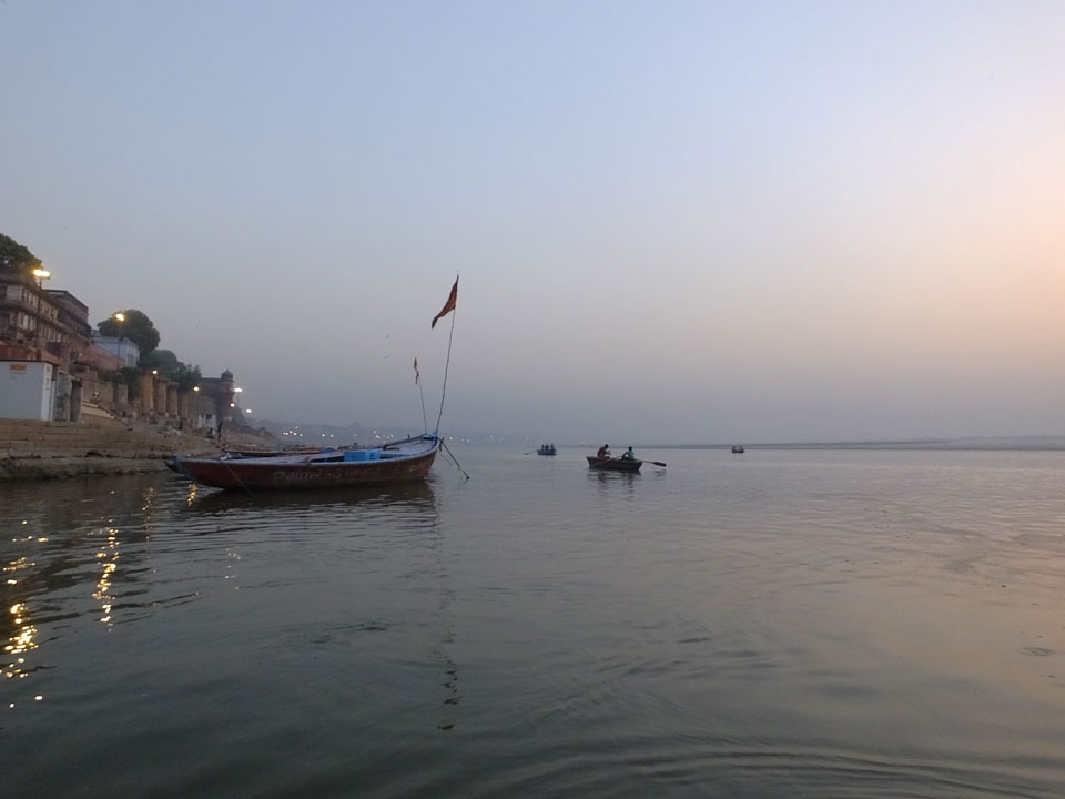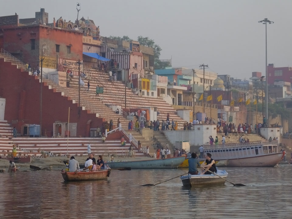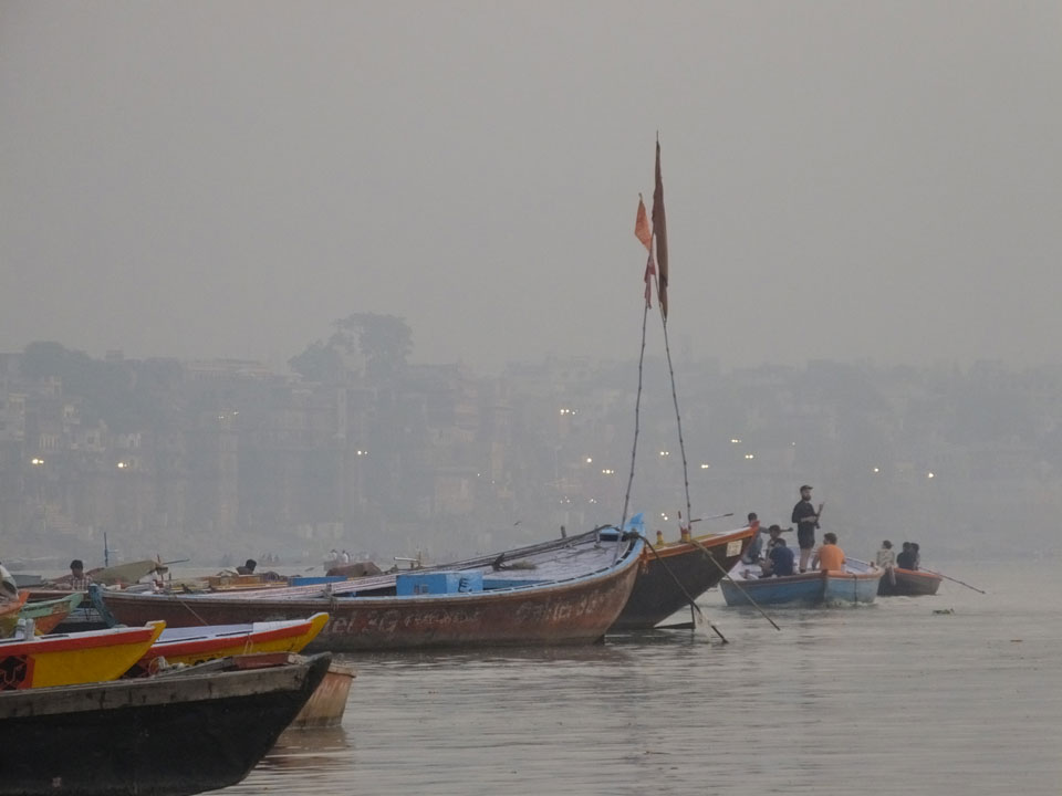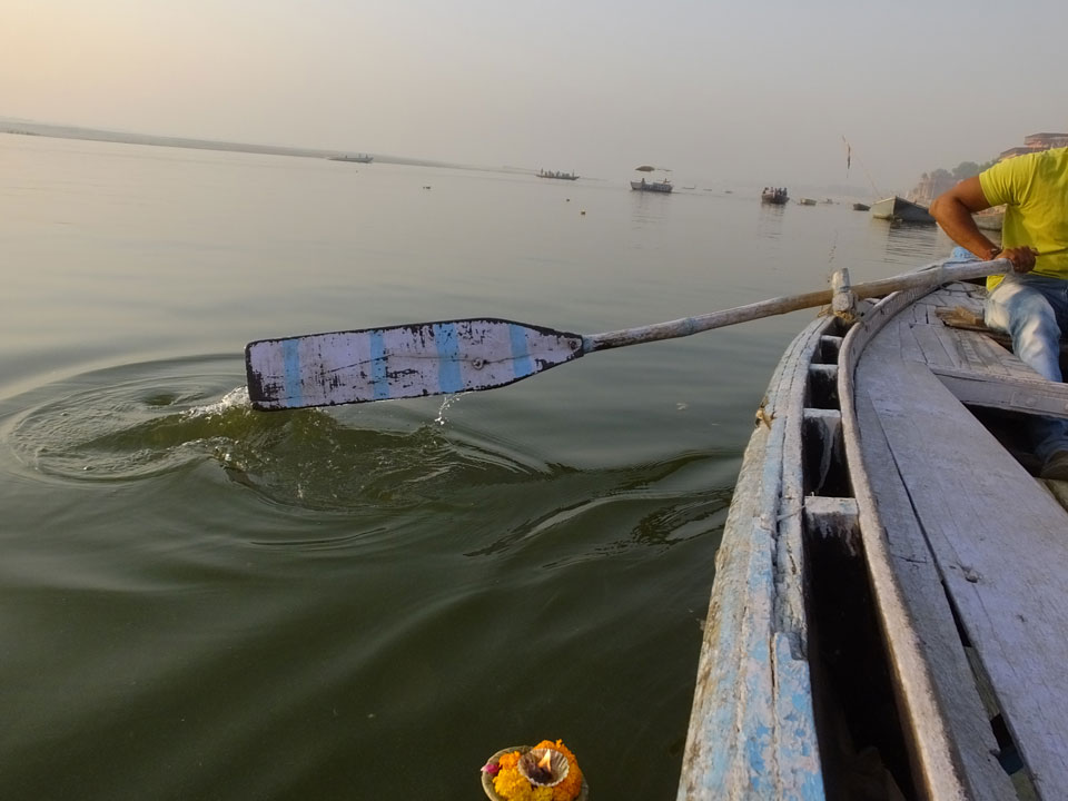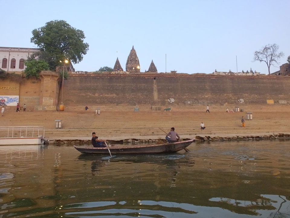 Meinen Wecker hatte ich mit Backups auf 4:35 gestellt. Um 5 war ich tatsächlich unten an der Rezeption, wo auch einige andere Frühaufsteher eintrudelten. Mit einem Zimmergenossen ging es los, unserer Ruderer führte uns zu einem Ghat. Die anderen Leute wurden auf ein anderes Boot gelotst.