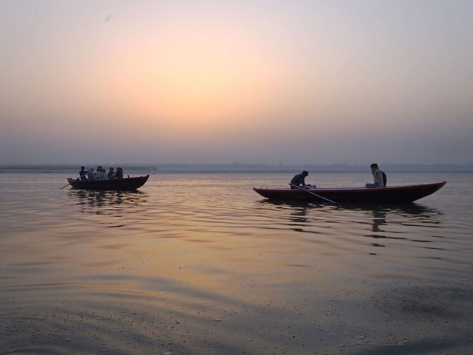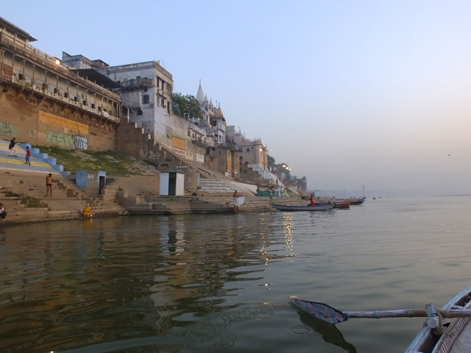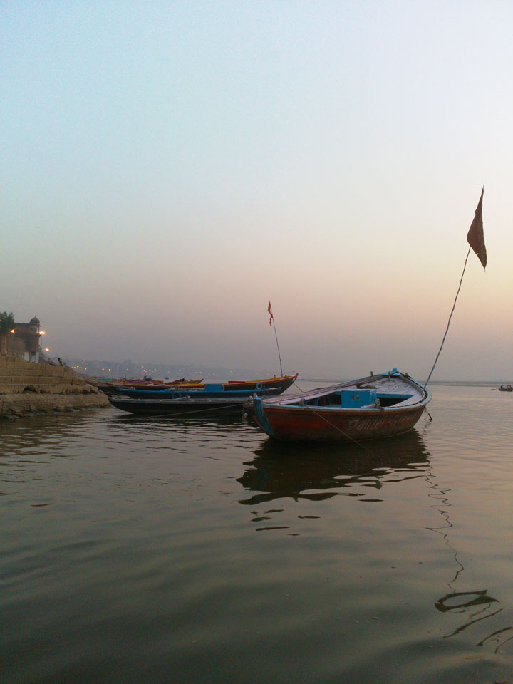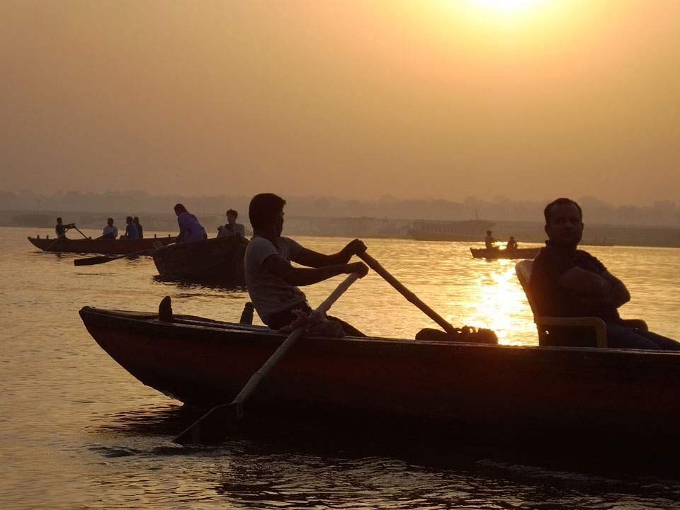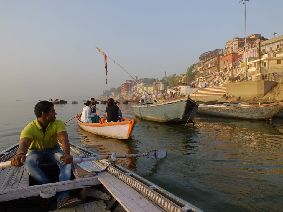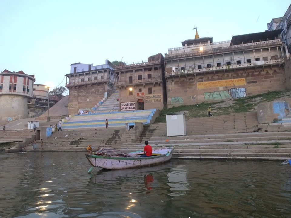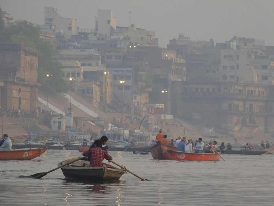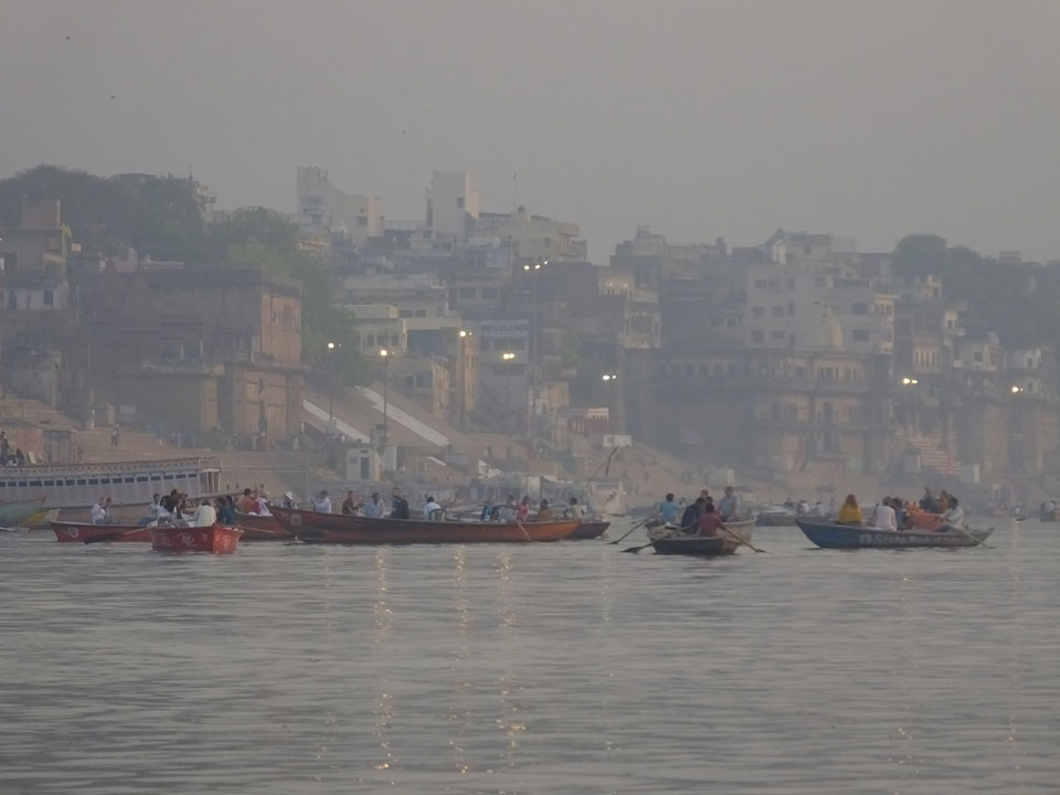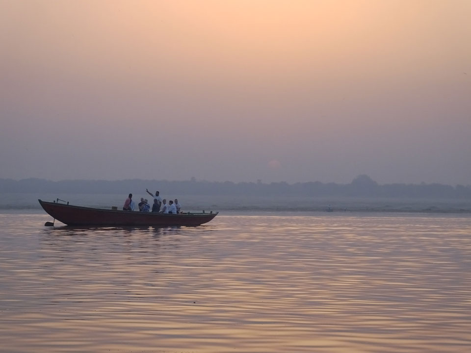 Meinen Wecker hatte ich mit Backups auf 4:35 gestellt. Um 5 war ich tatsächlich unten an der Rezeption, wo auch einige andere Frühaufsteher eintrudelten. Mit einem Zimmergenossen ging es los, unserer Ruderer führte uns zu einem Ghat. Die anderen Leute wurden auf ein anderes Boot gelotst.