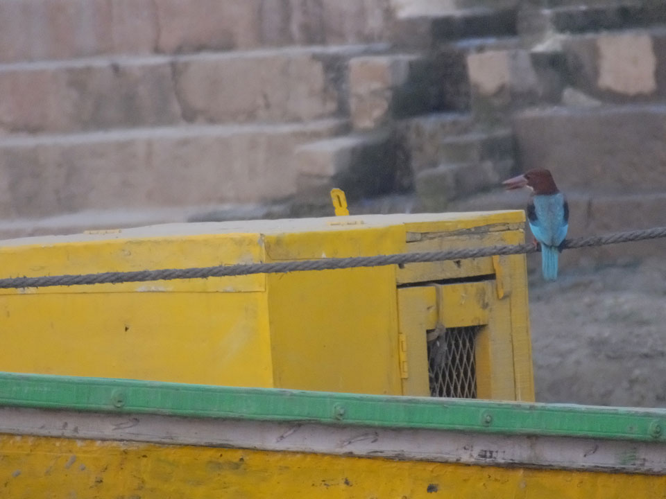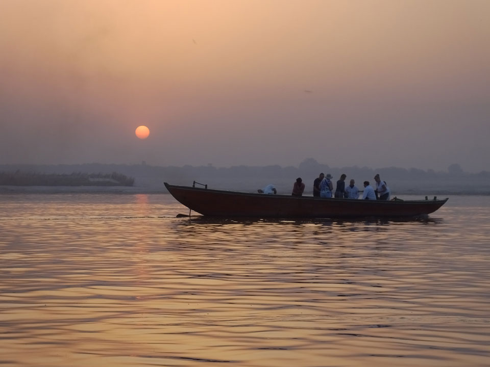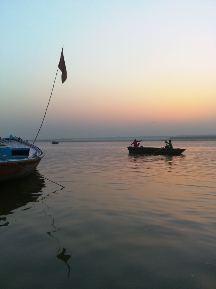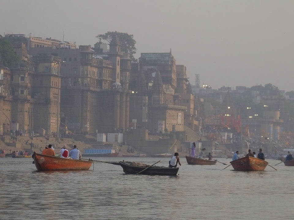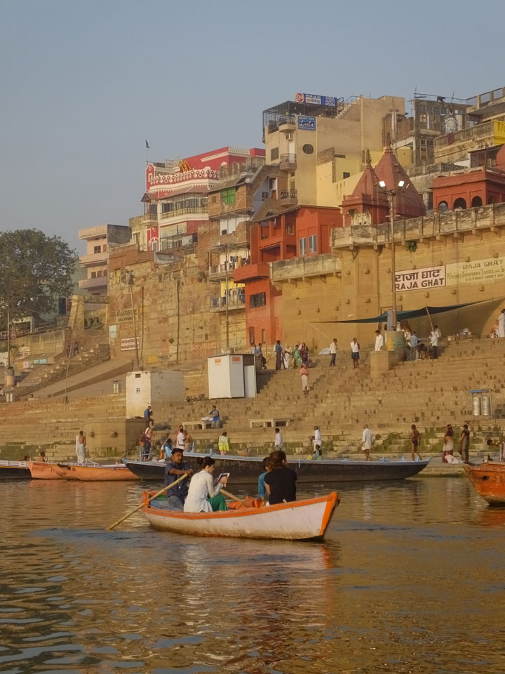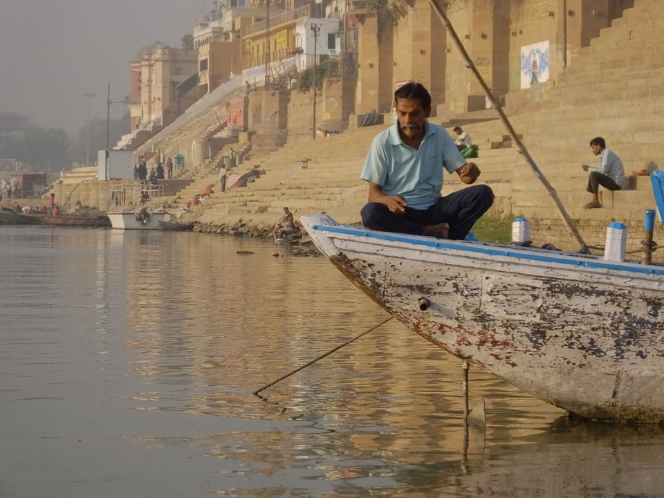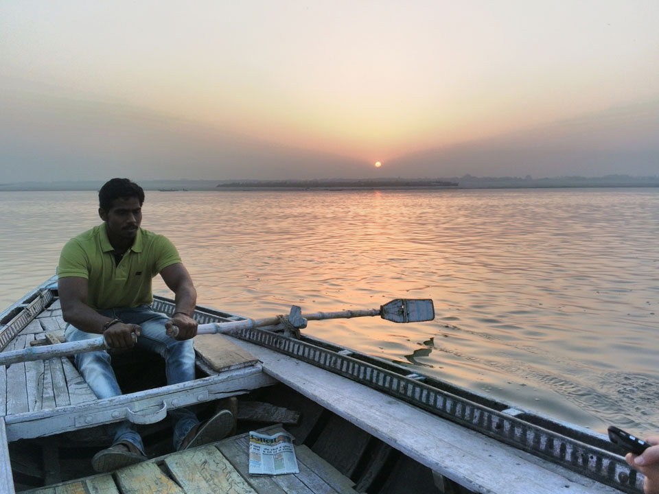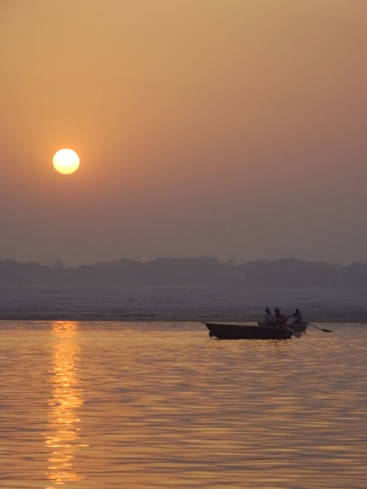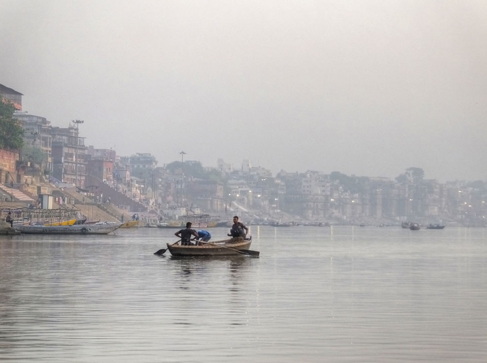 Meinen Wecker hatte ich mit Backups auf 4:35 gestellt. Um 5 war ich tatsächlich unten an der Rezeption, wo auch einige andere Frühaufsteher eintrudelten. Mit einem Zimmergenossen ging es los, unserer Ruderer führte uns zu einem Ghat. Die anderen Leute wurden auf ein anderes Boot gelotst.