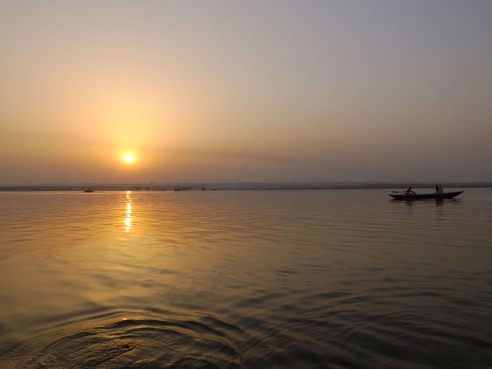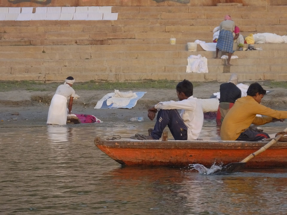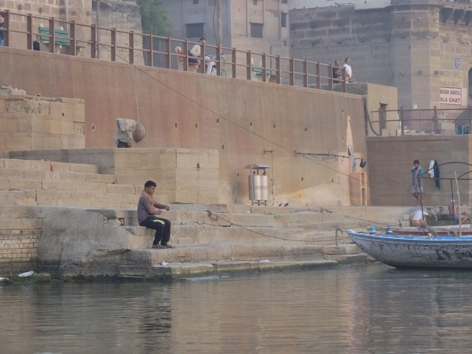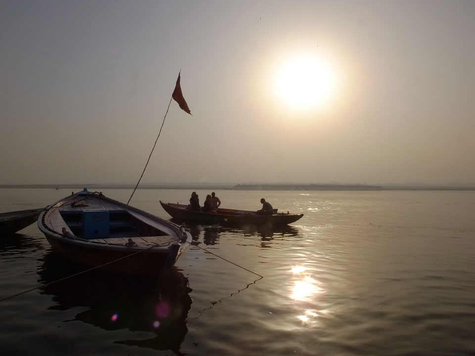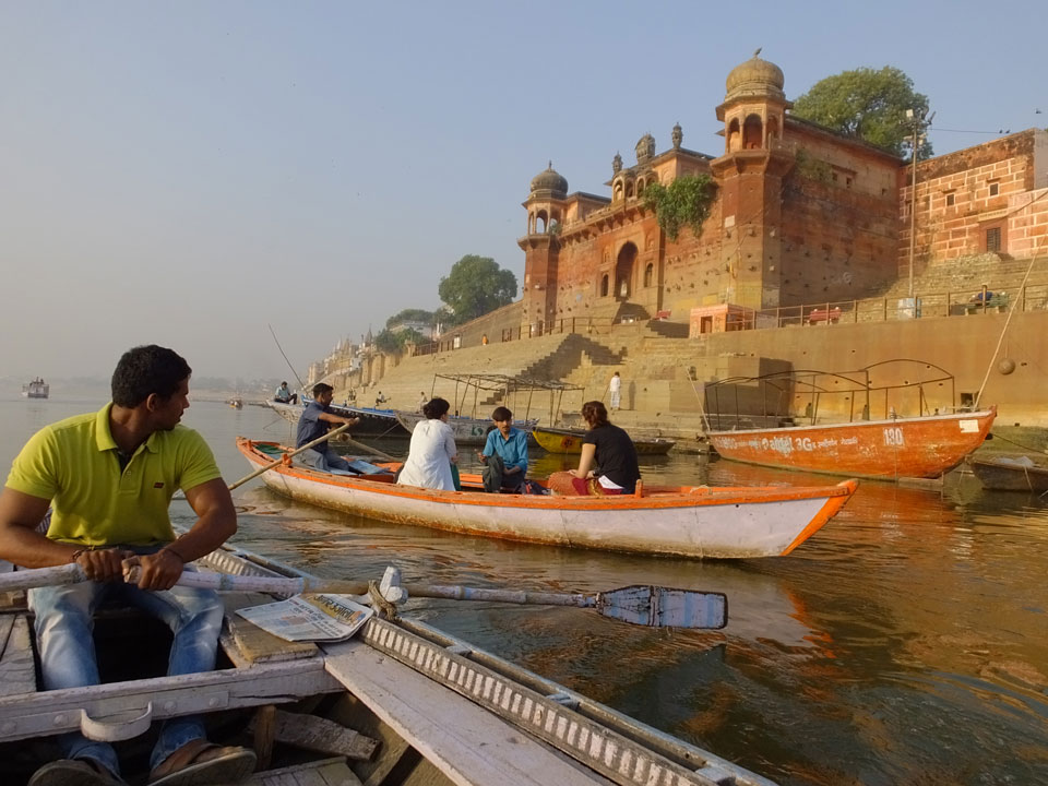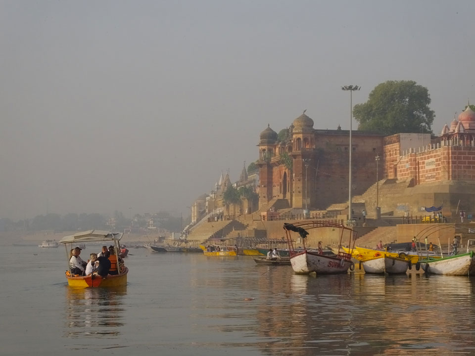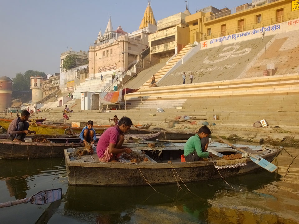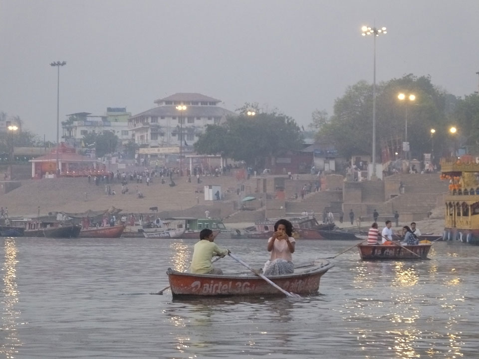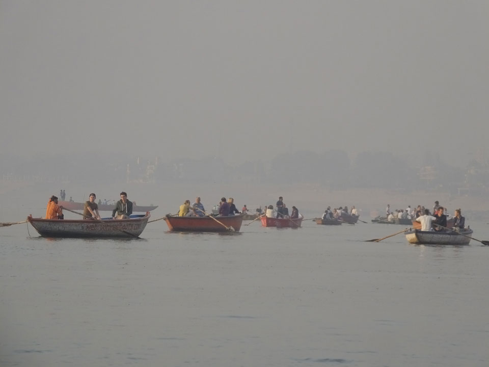Meinen Wecker hatte ich mit Backups auf 4:35 gestellt. Um 5 war ich tatsächlich unten an der Rezeption, wo auch einige andere Frühaufsteher eintrudelten. Mit einem Zimmergenossen ging es los, unserer Ruderer führte uns zu einem Ghat. Die anderen Leute wurden auf ein anderes Boot gelotst.