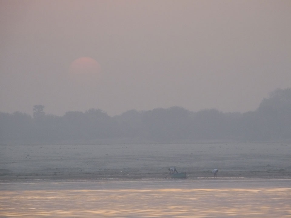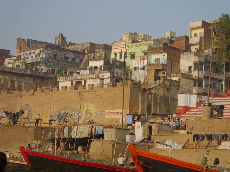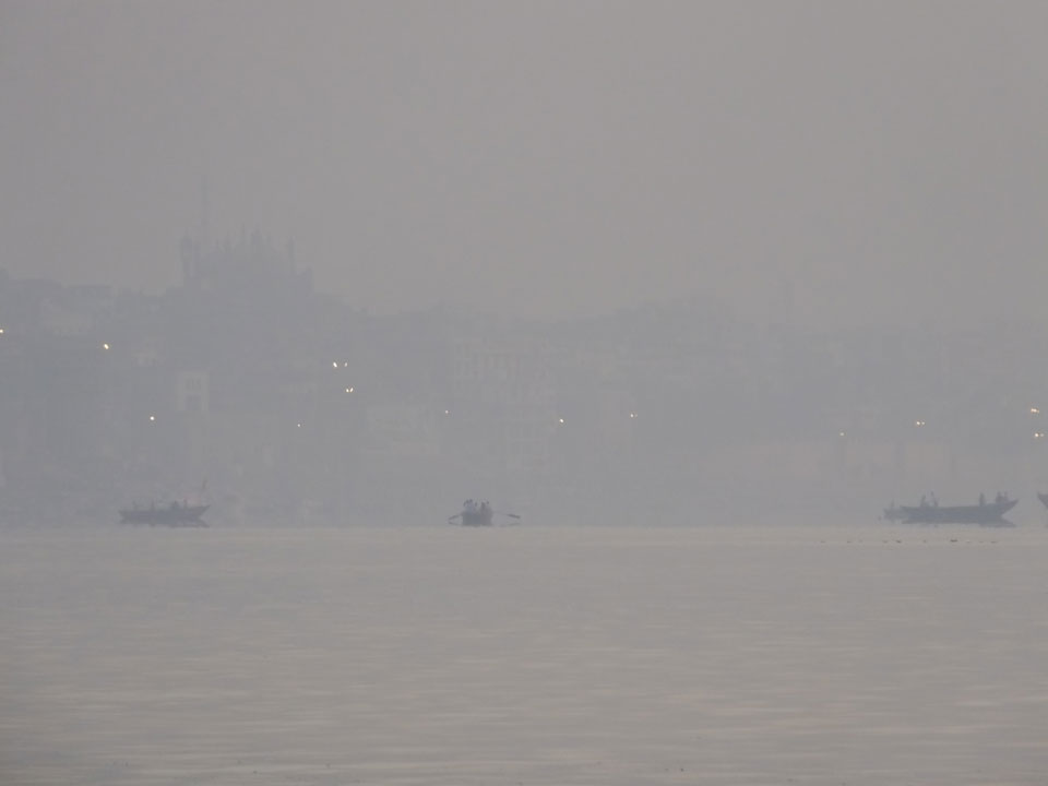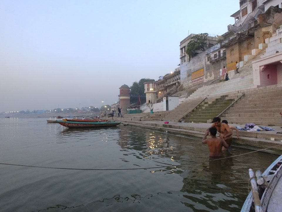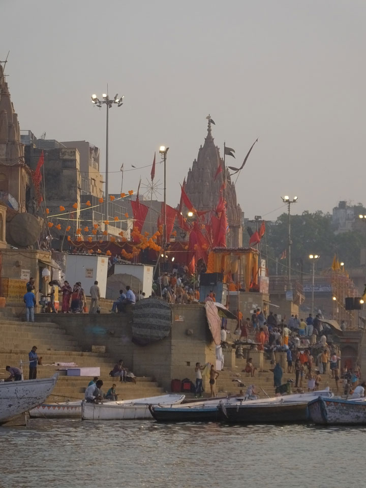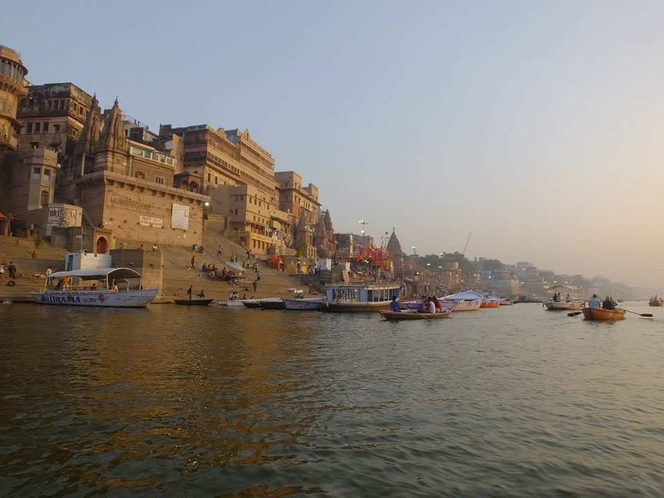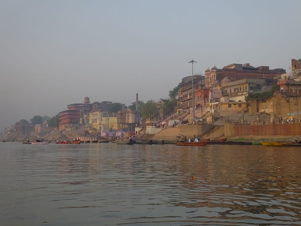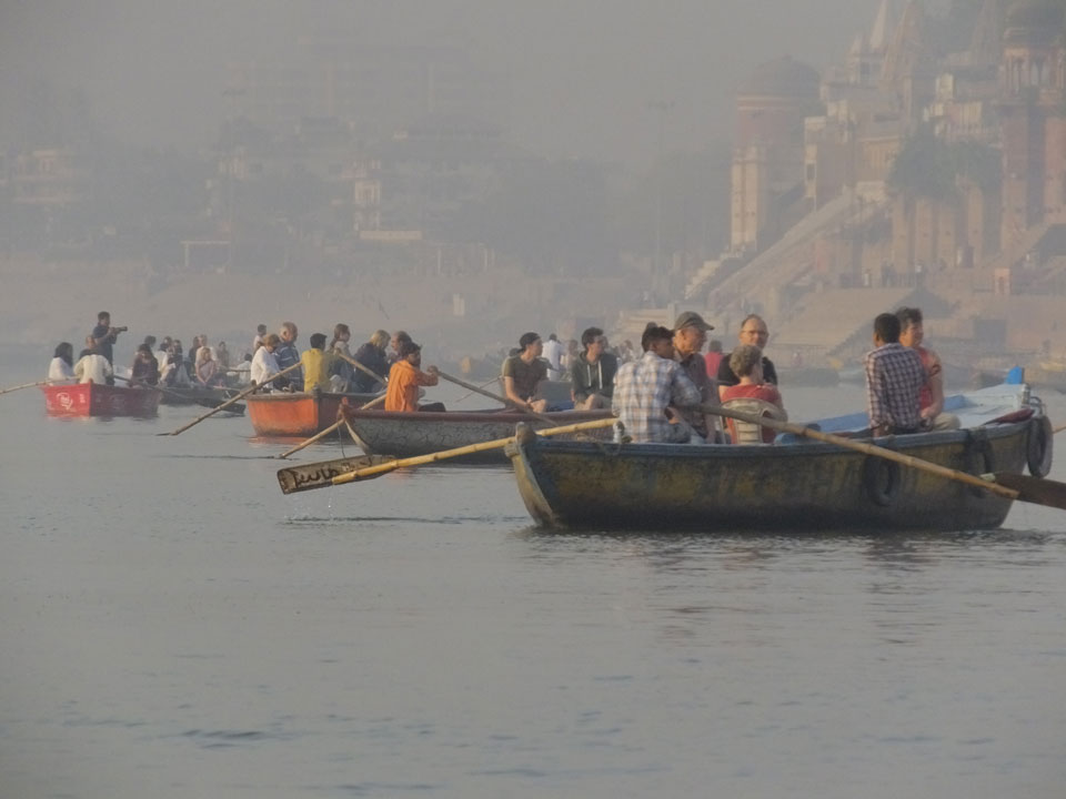Meinen Wecker hatte ich mit Backups auf 4:35 gestellt. Um 5 war ich tatsächlich unten an der Rezeption, wo auch einige andere Frühaufsteher eintrudelten. Mit einem Zimmergenossen ging es los, unserer Ruderer führte uns zu einem Ghat. Die anderen Leute wurden auf ein anderes Boot gelotst.