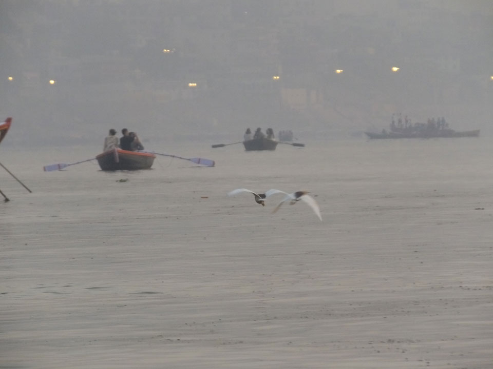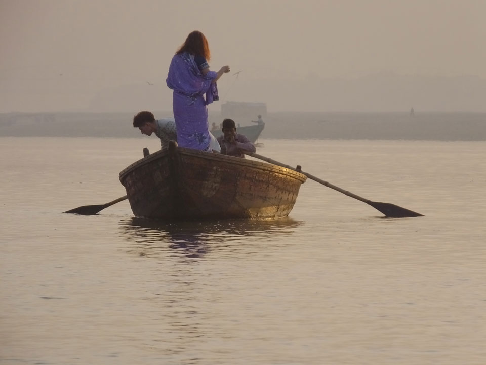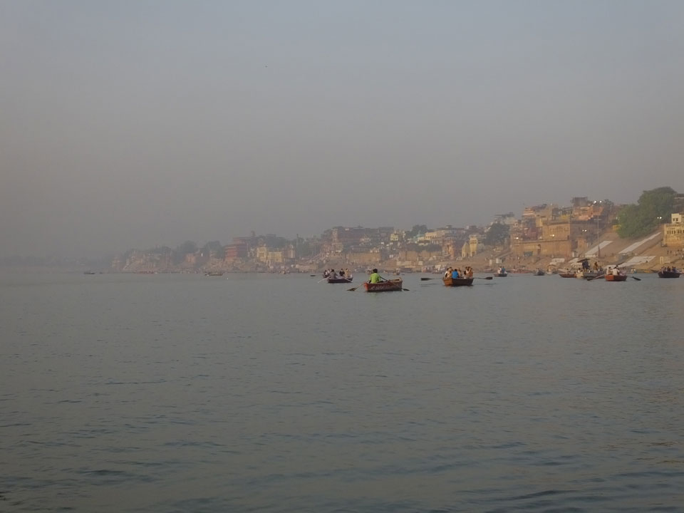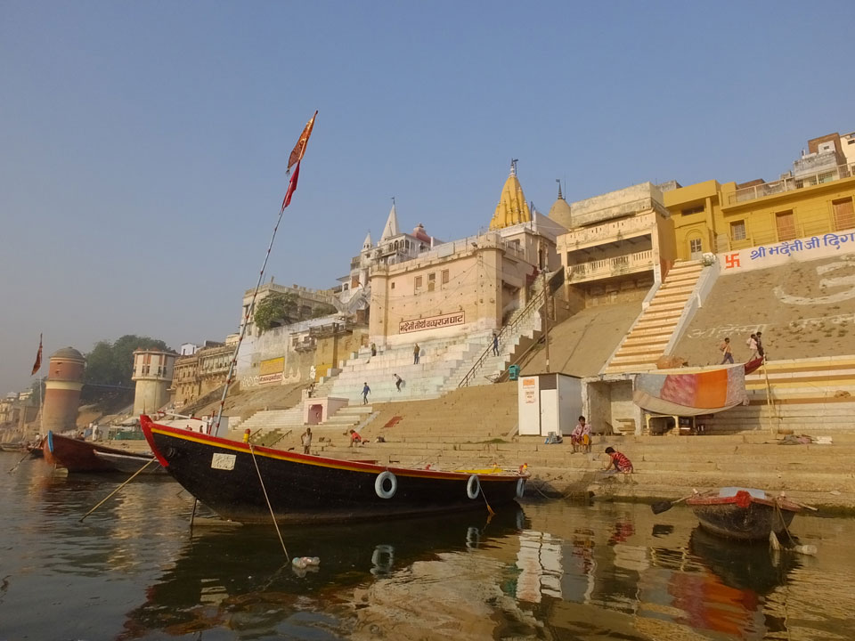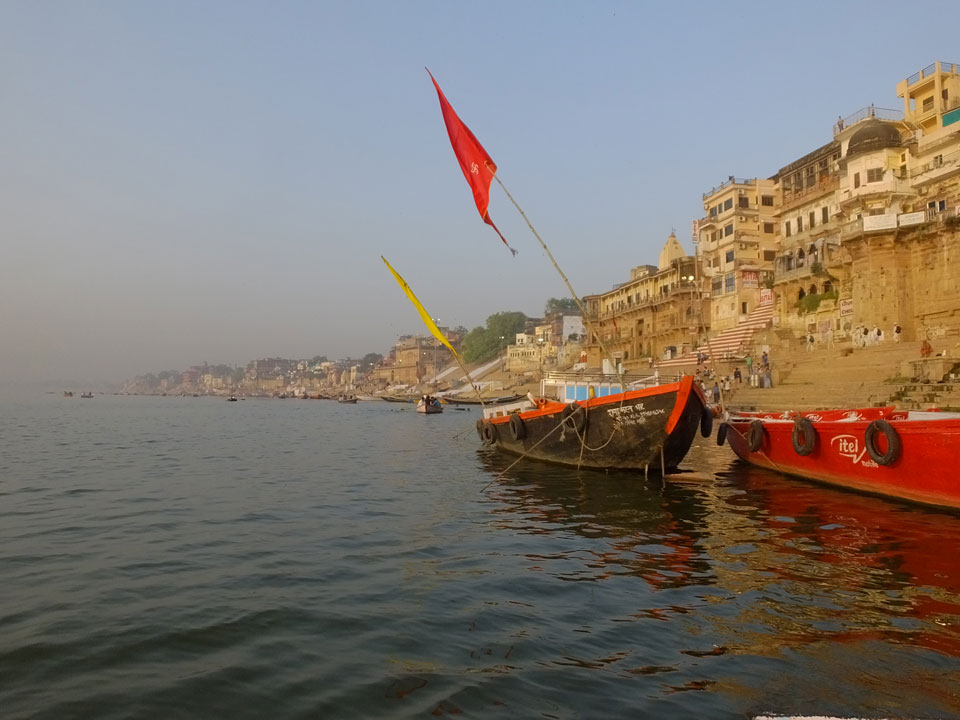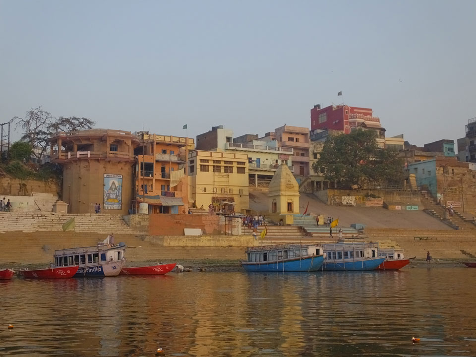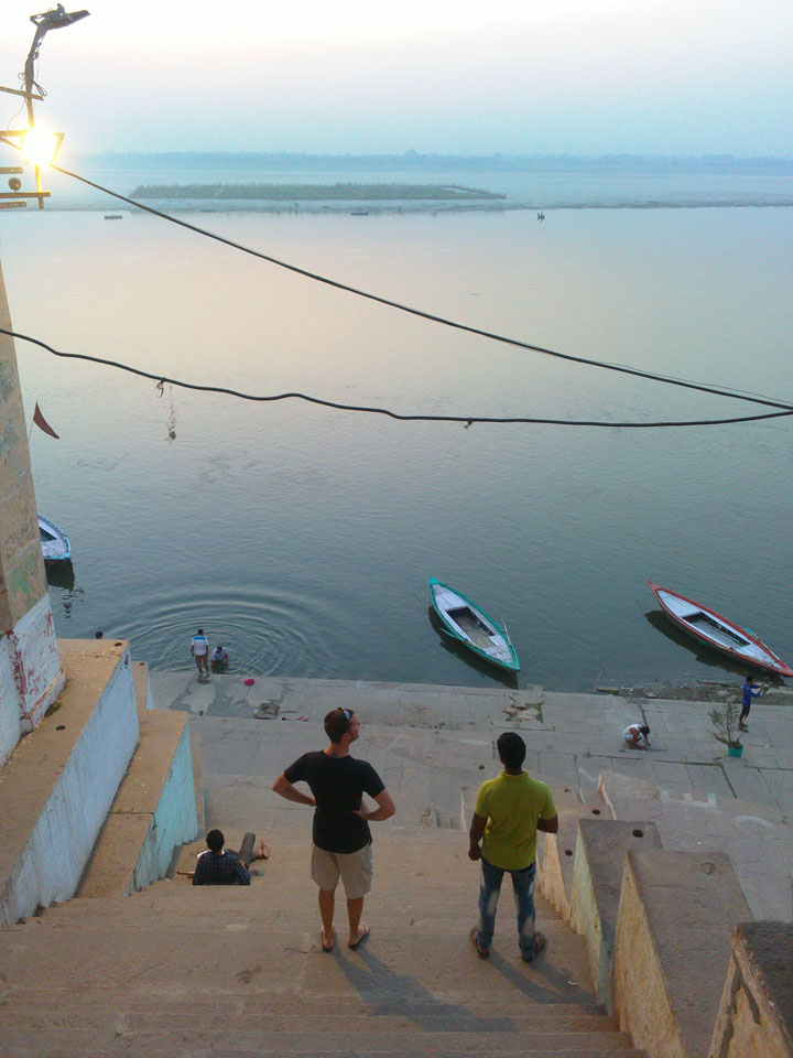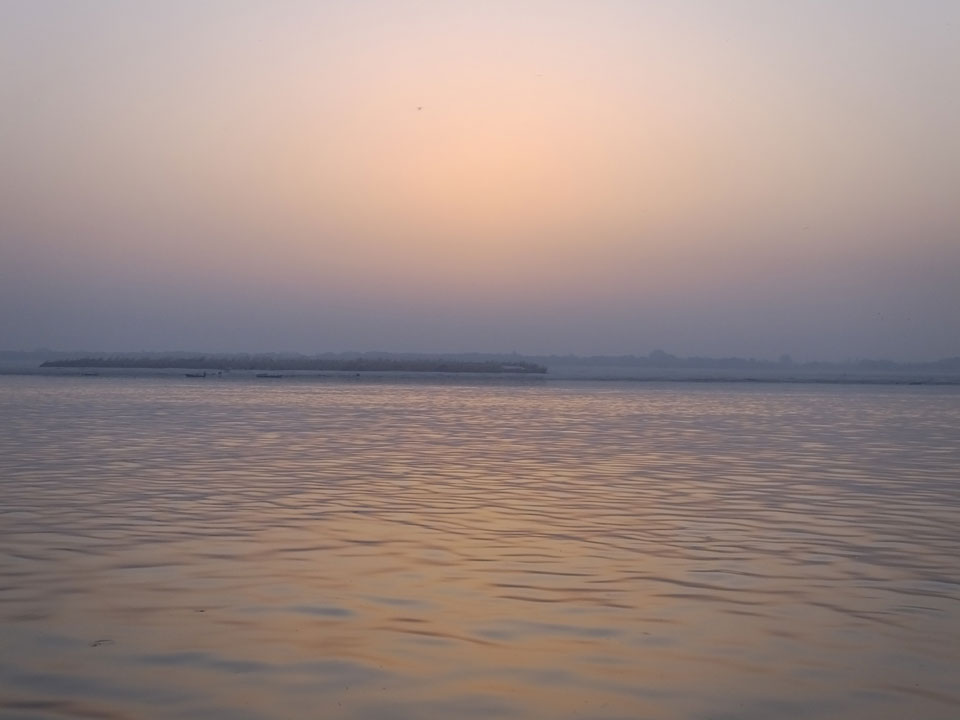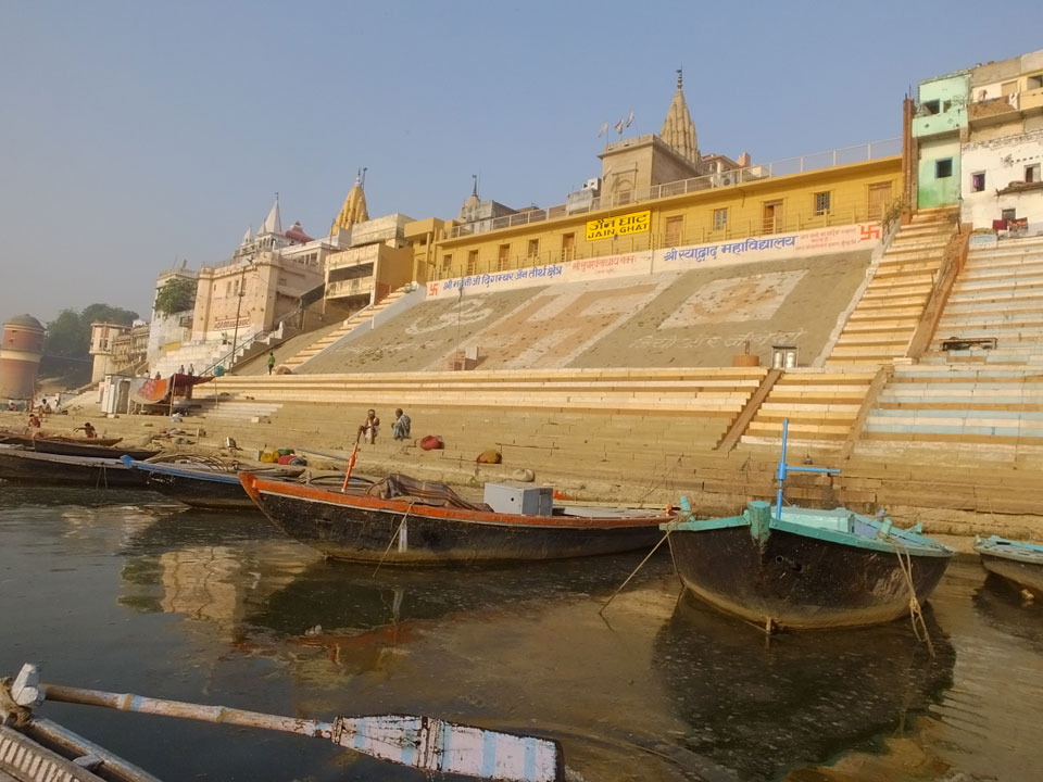 Meinen Wecker hatte ich mit Backups auf 4:35 gestellt. Um 5 war ich tatsächlich unten an der Rezeption, wo auch einige andere Frühaufsteher eintrudelten. Mit einem Zimmergenossen ging es los, unserer Ruderer führte uns zu einem Ghat. Die anderen Leute wurden auf ein anderes Boot gelotst.