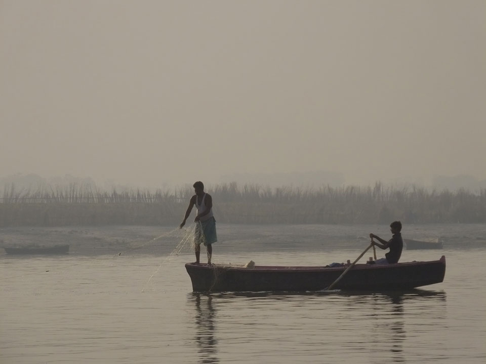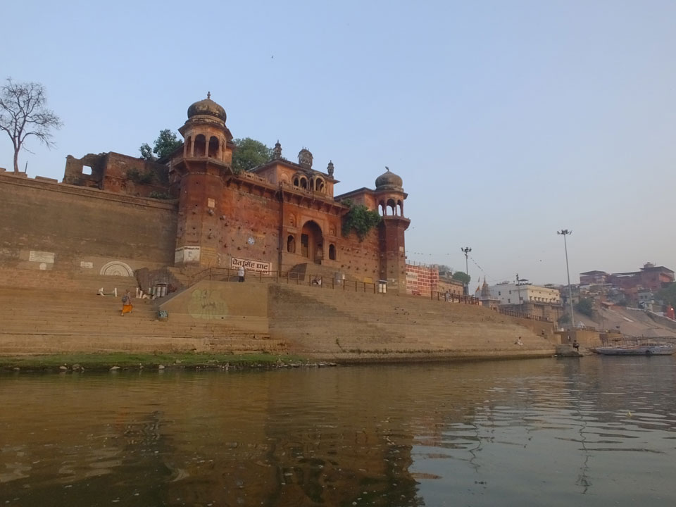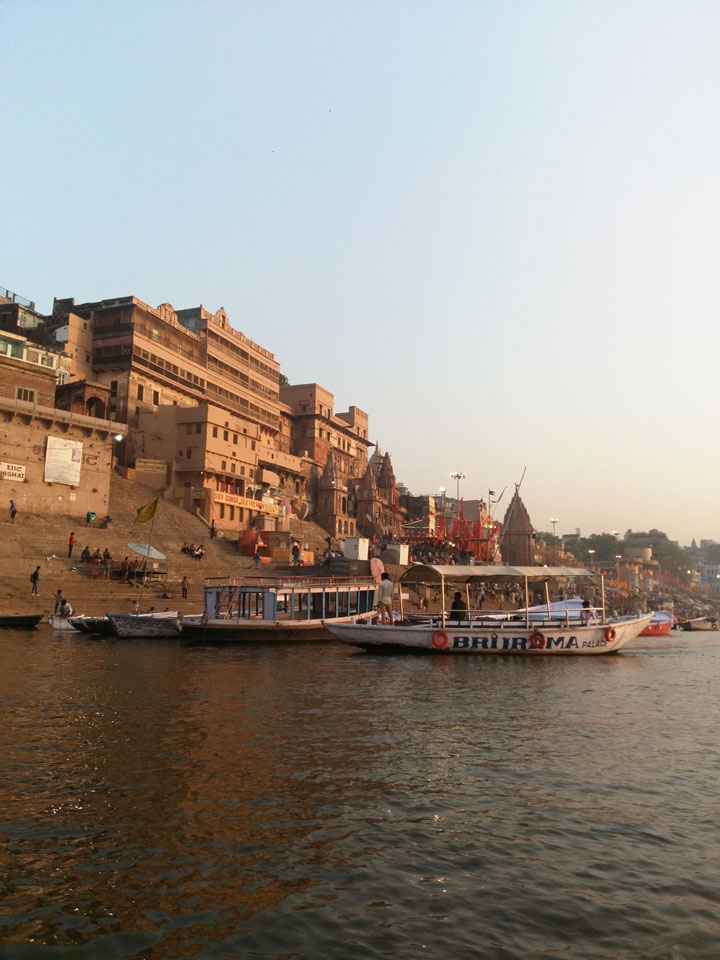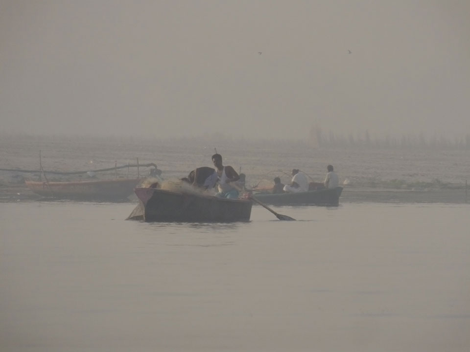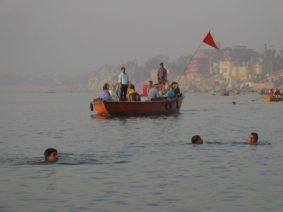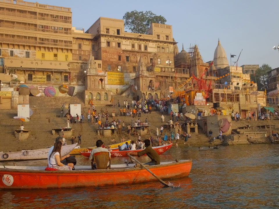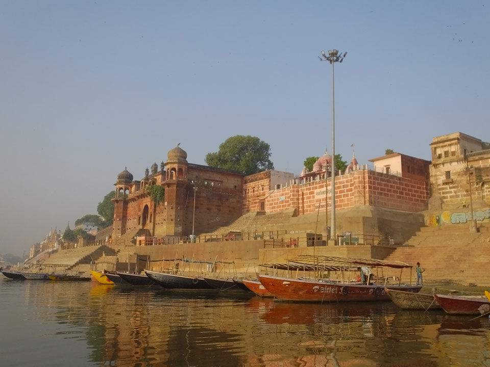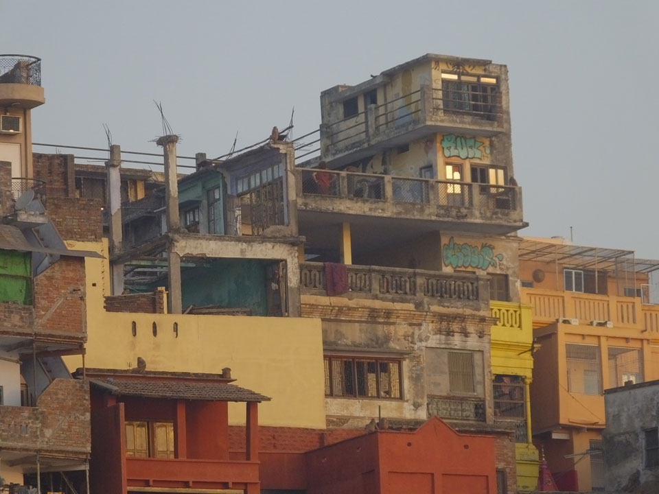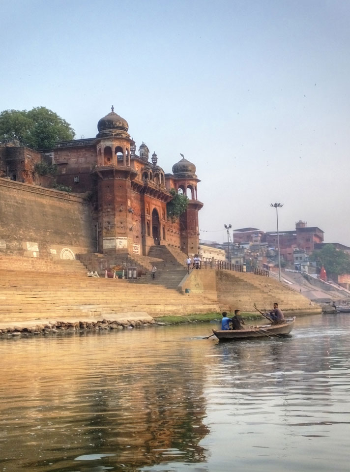 Meinen Wecker hatte ich mit Backups auf 4:35 gestellt. Um 5 war ich tatsächlich unten an der Rezeption, wo auch einige andere Frühaufsteher eintrudelten. Mit einem Zimmergenossen ging es los, unserer Ruderer führte uns zu einem Ghat. Die anderen Leute wurden auf ein anderes Boot gelotst.