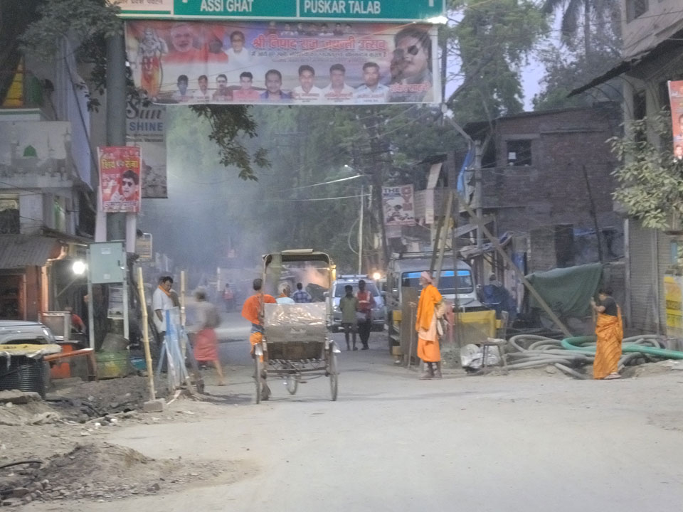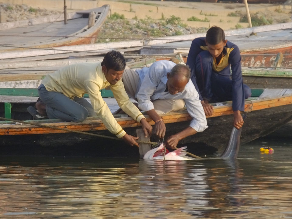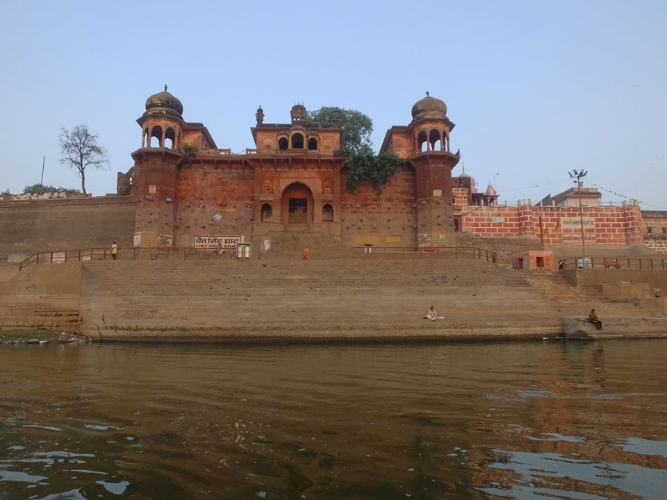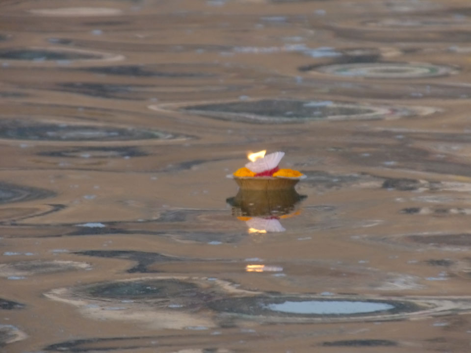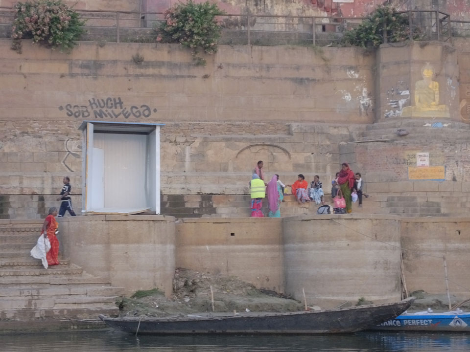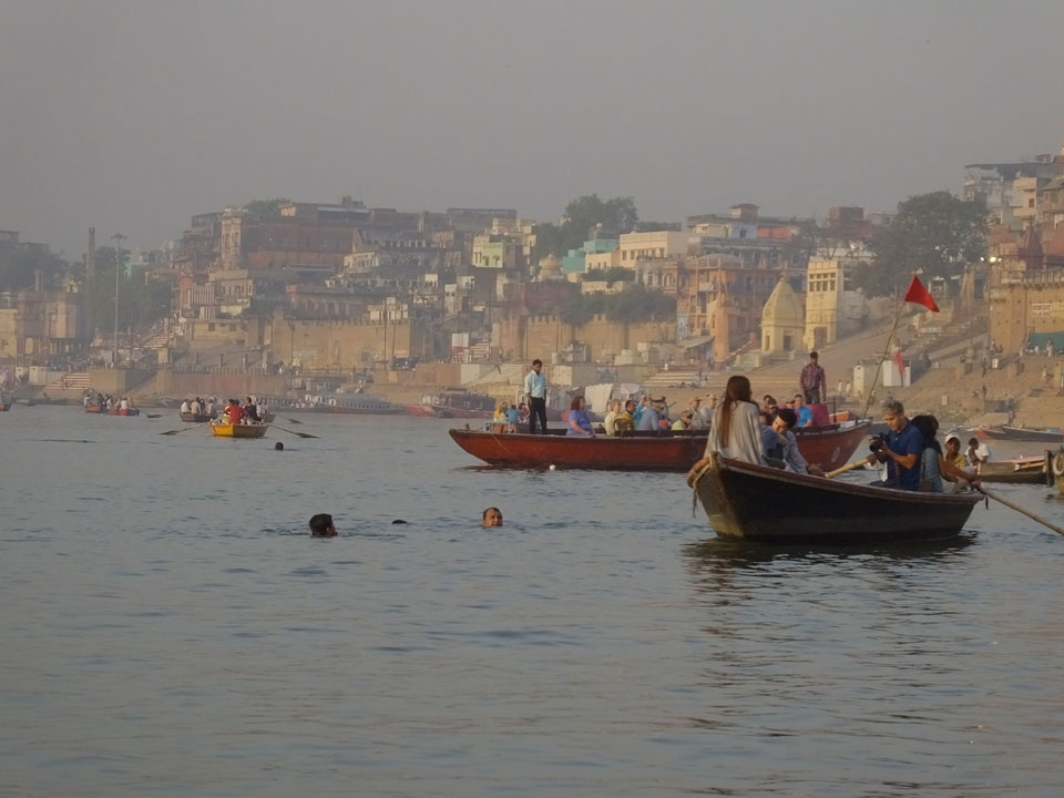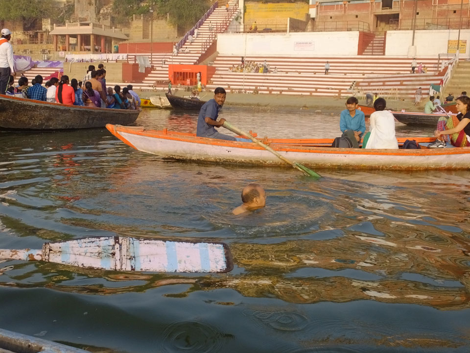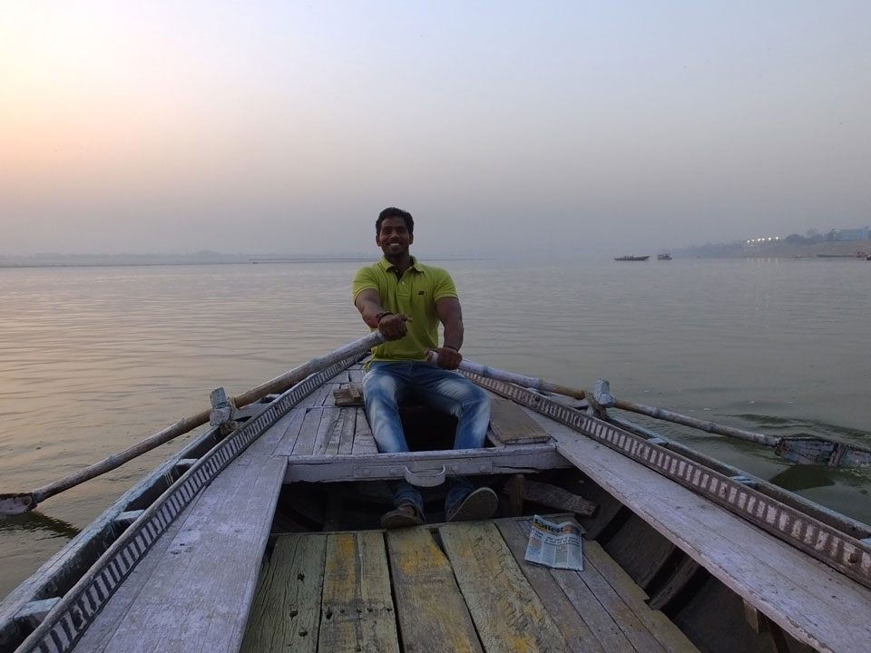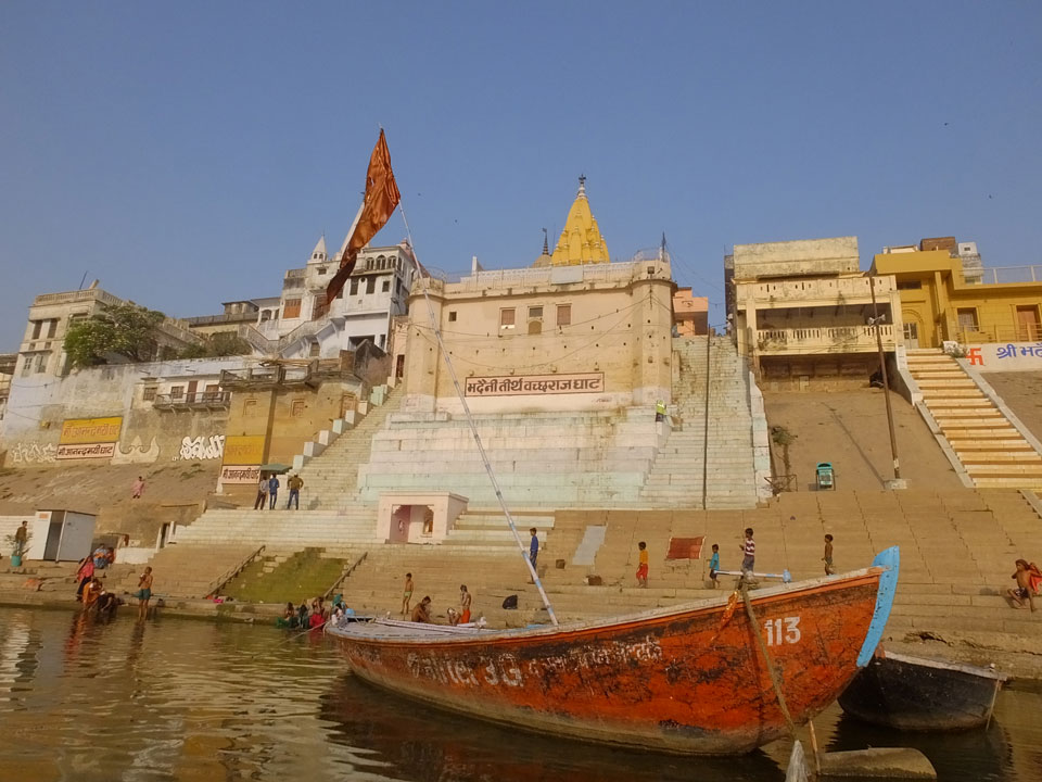Meinen Wecker hatte ich mit Backups auf 4:35 gestellt. Um 5 war ich tatsächlich unten an der Rezeption, wo auch einige andere Frühaufsteher eintrudelten. Mit einem Zimmergenossen ging es los, unserer Ruderer führte uns zu einem Ghat. Die anderen Leute wurden auf ein anderes Boot gelotst.