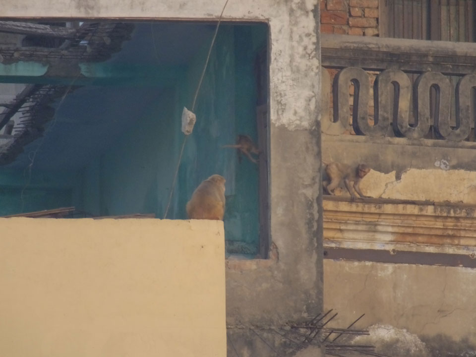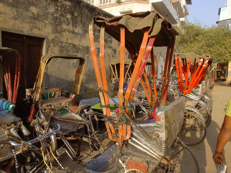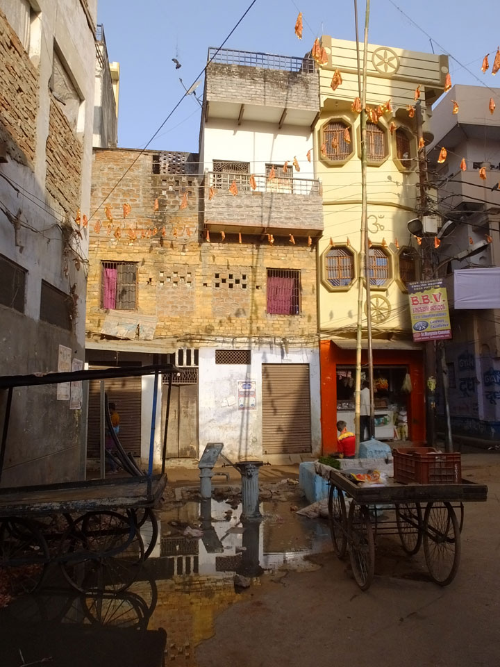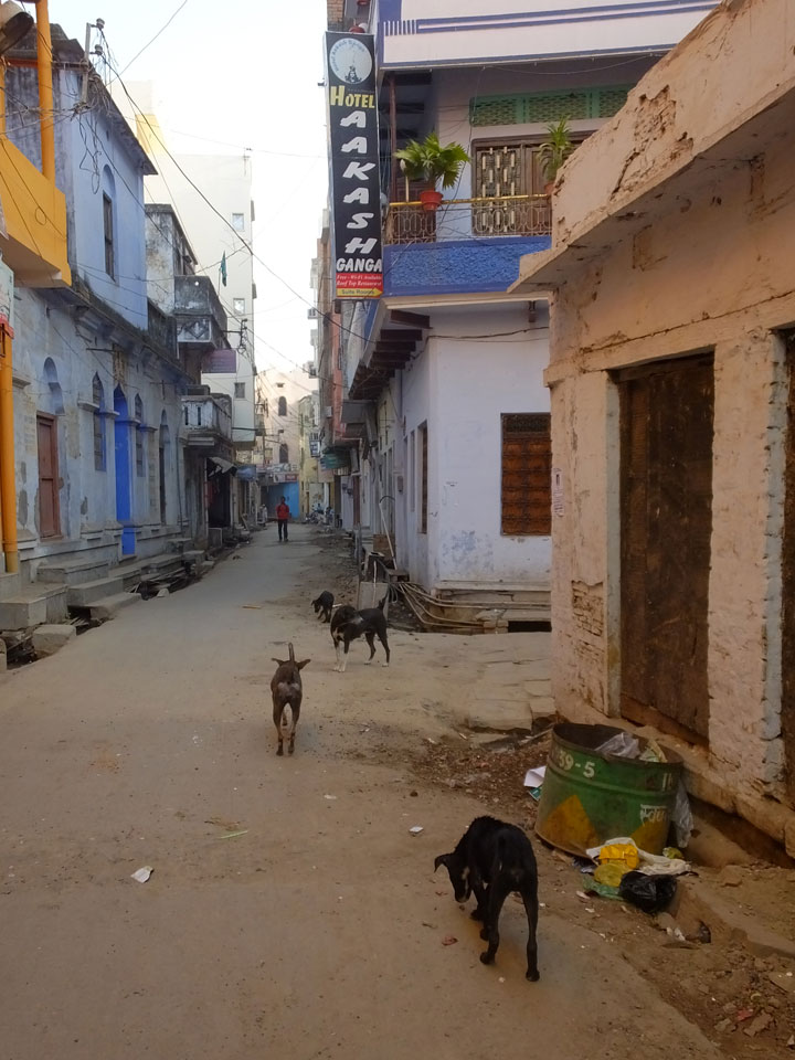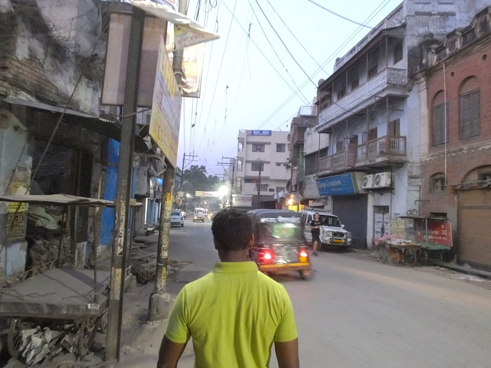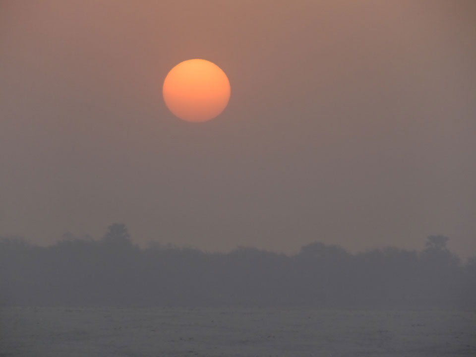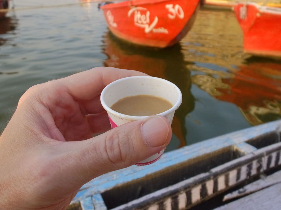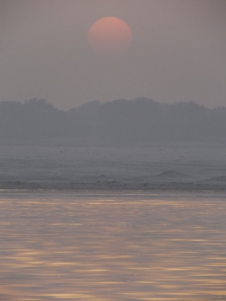 Meinen Wecker hatte ich mit Backups auf 4:35 gestellt. Um 5 war ich tatsächlich unten an der Rezeption, wo auch einige andere Frühaufsteher eintrudelten. Mit einem Zimmergenossen ging es los, unserer Ruderer führte uns zu einem Ghat. Die anderen Leute wurden auf ein anderes Boot gelotst.