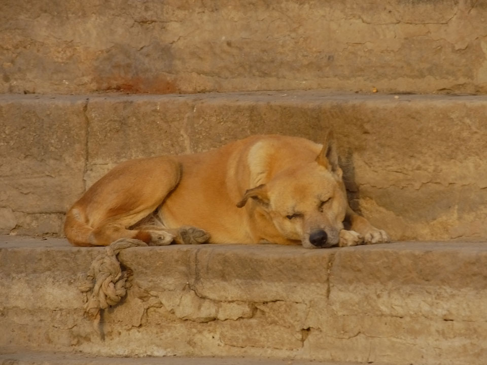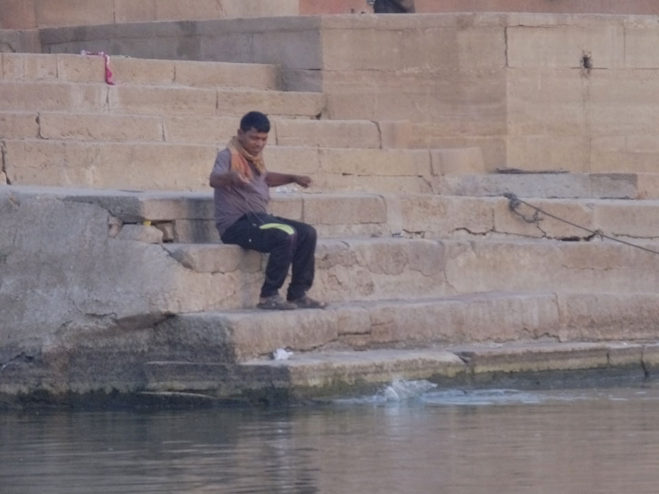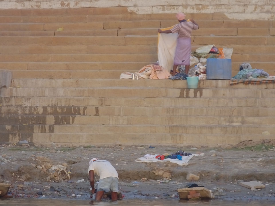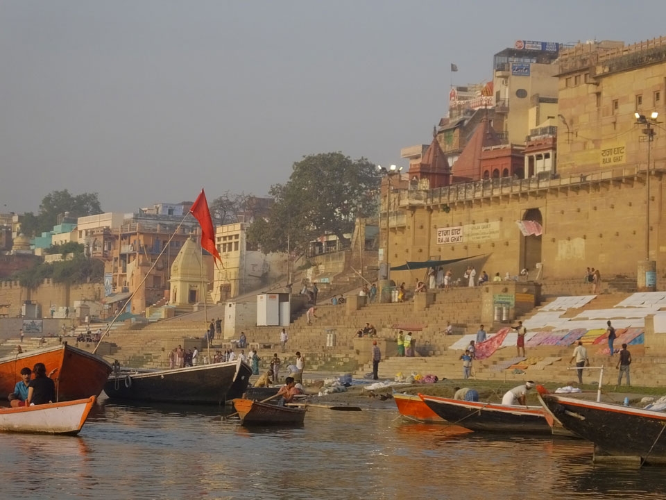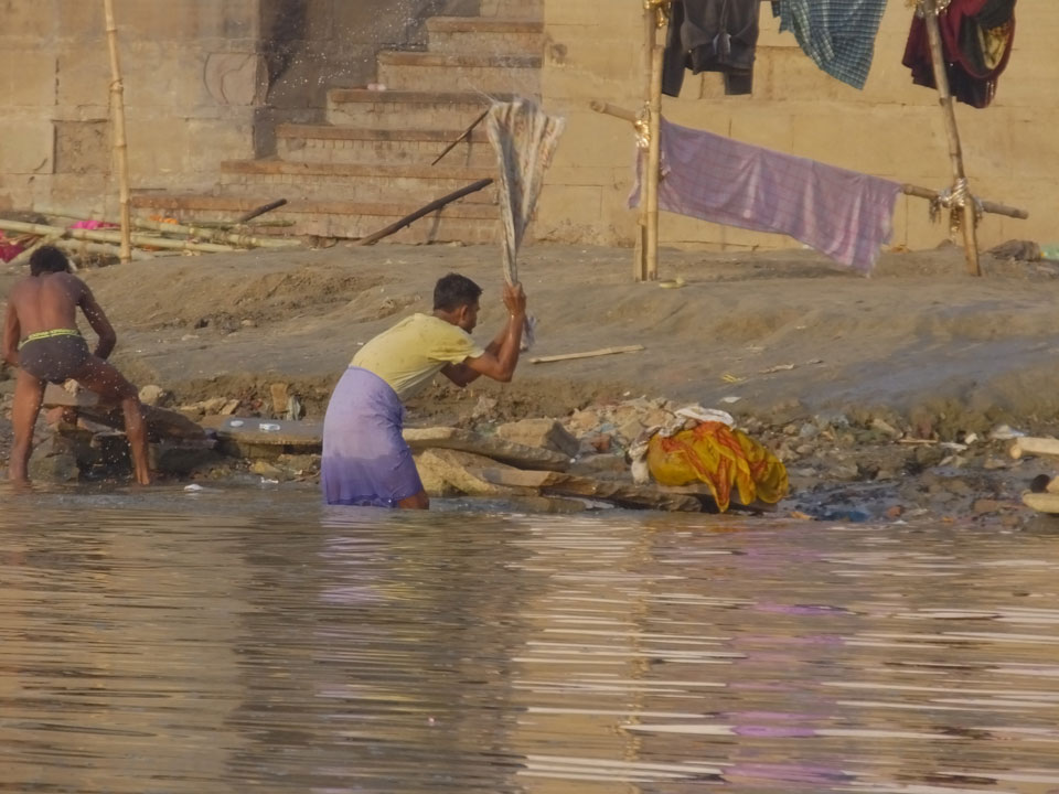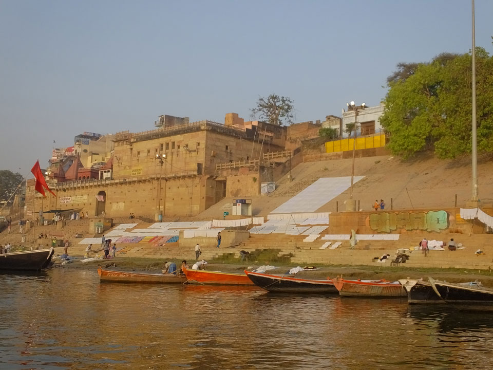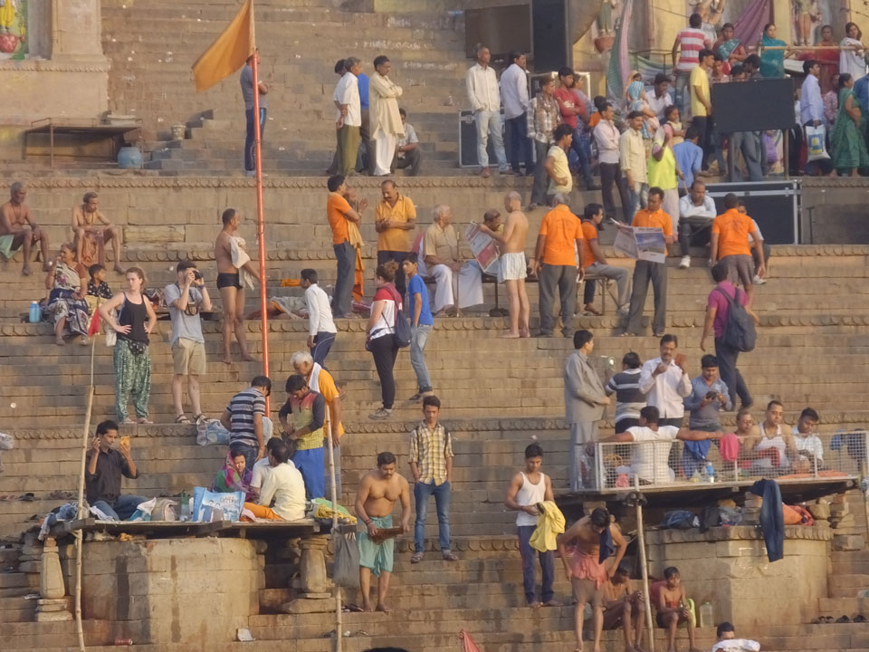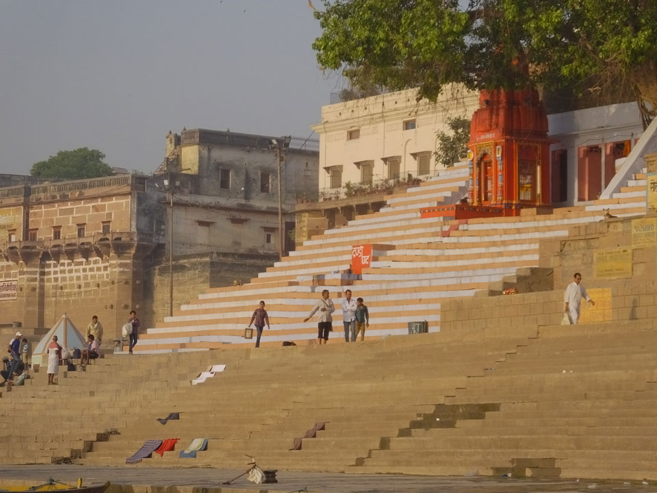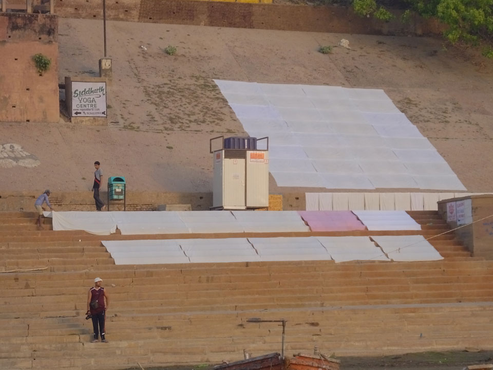 Eine tolle Atmosphäre zum Sonnenaufgang hier am Ganges. Mit der Luftverschmutzung läuft der Sonnenaufgang auch stark orange und über dem Horizont ab. Am Ufer badeten die ersten Leute, wuschen Sachen. Viele Bettlaken wurden zum Trocknen auf die Treppen gelegt. Wenn man sich wundert, warum indische Bettwäsche oft Schmutzstreifen hat, wundert einen das nach diesem Anblick nicht mehr.
