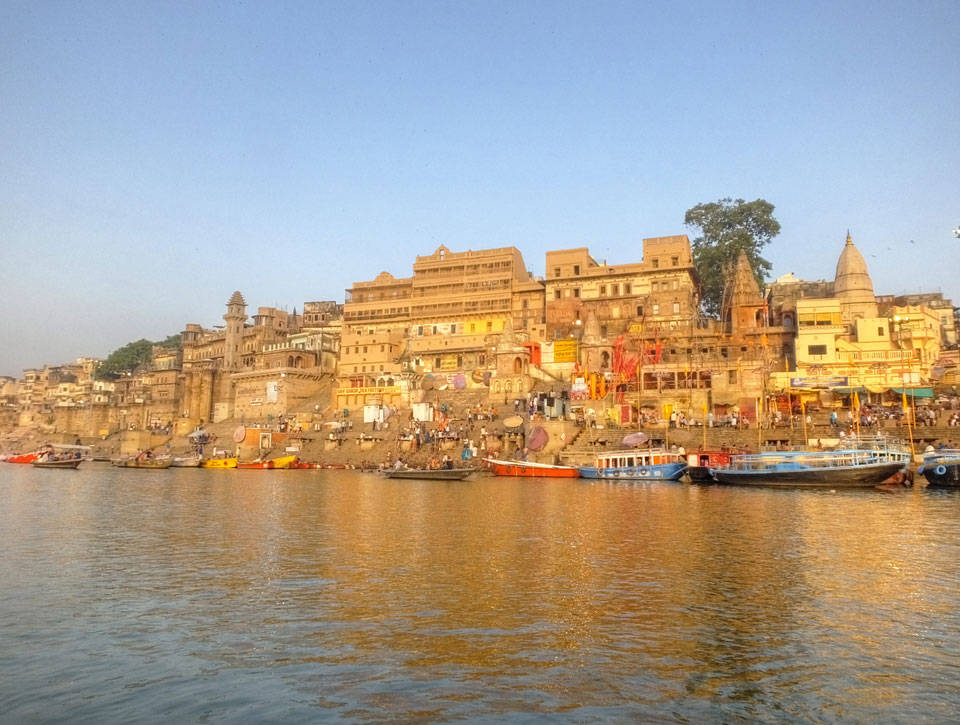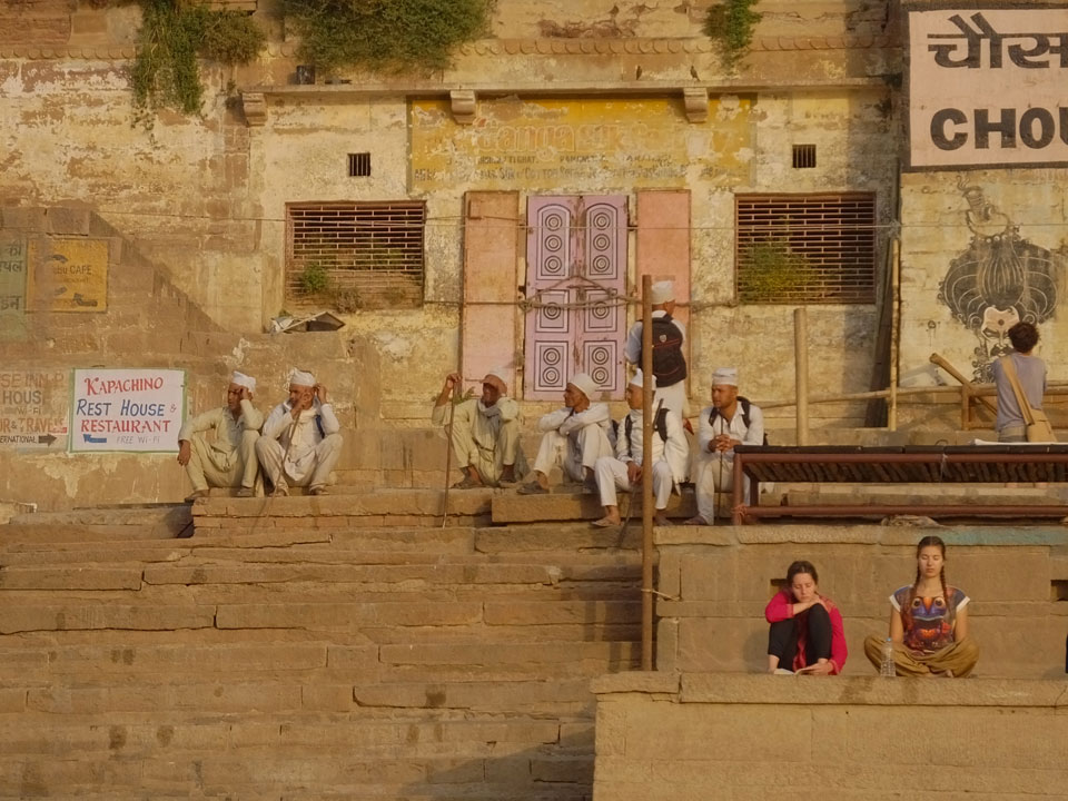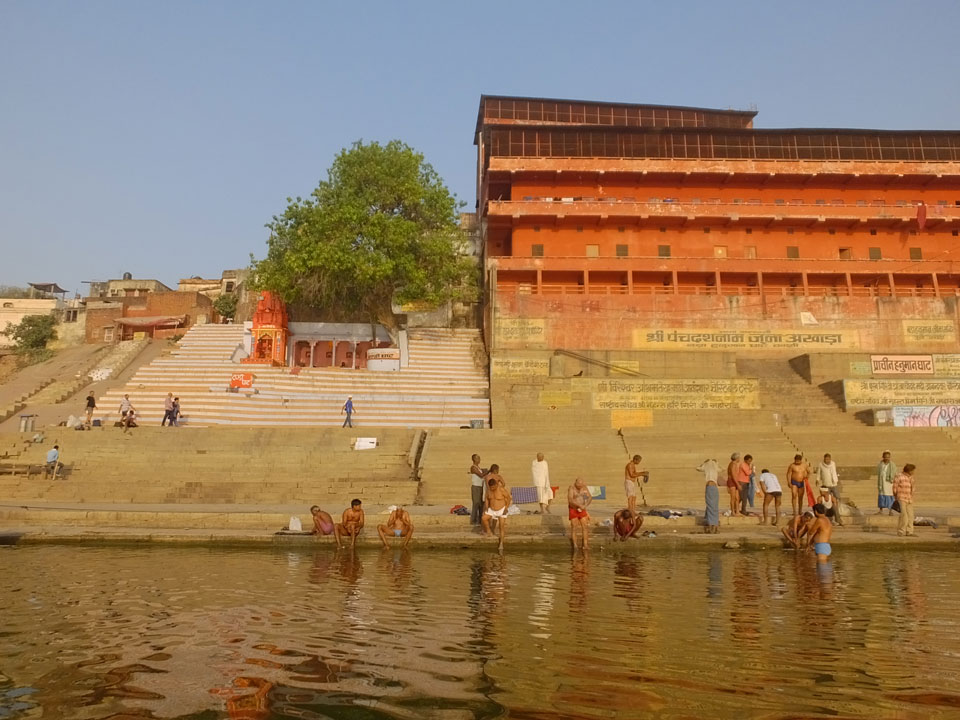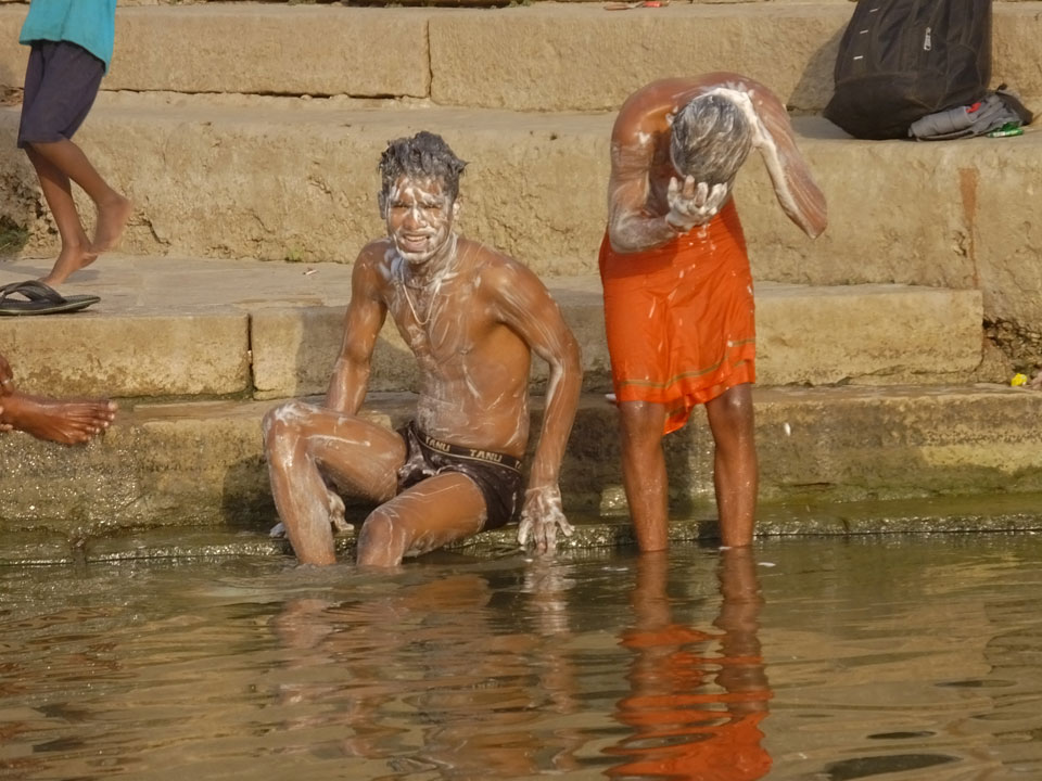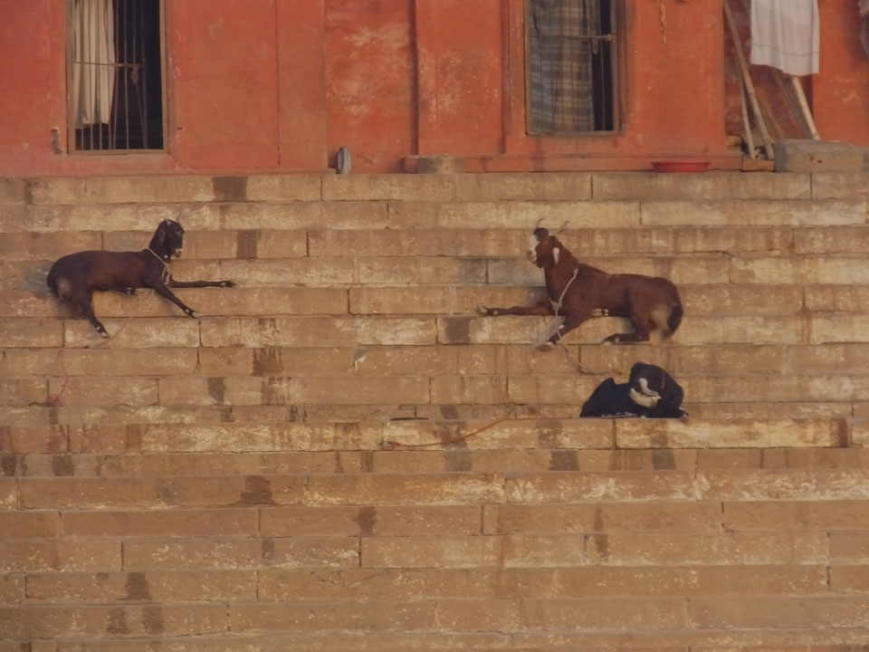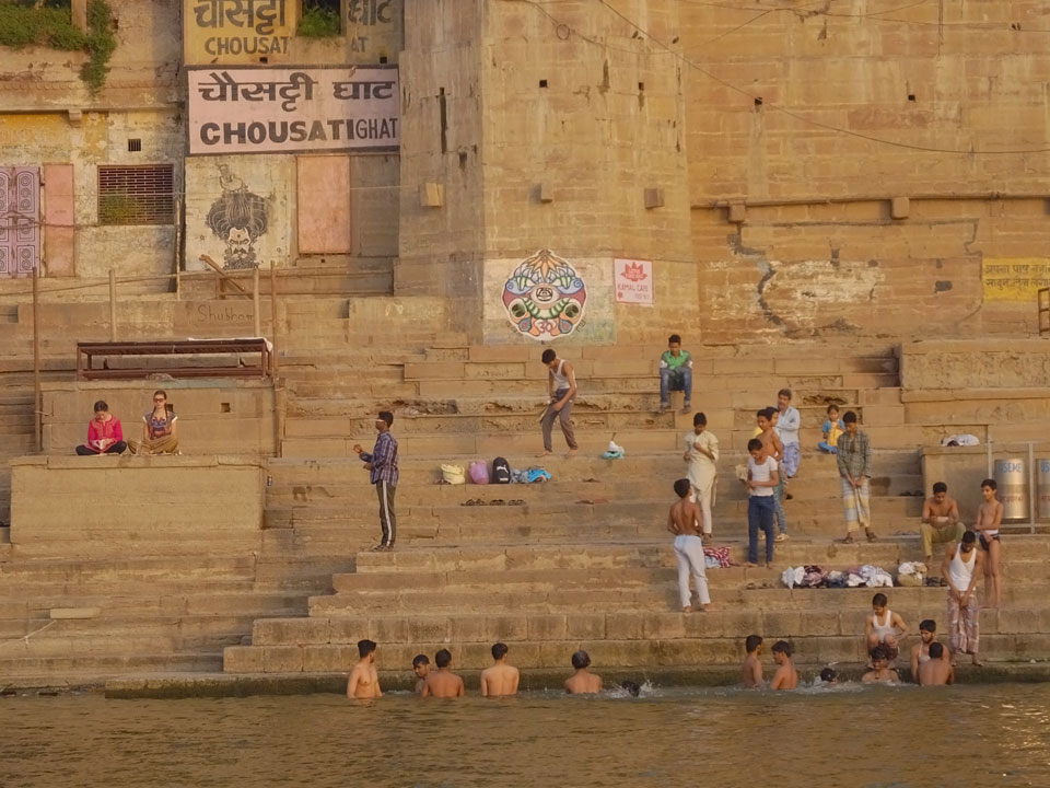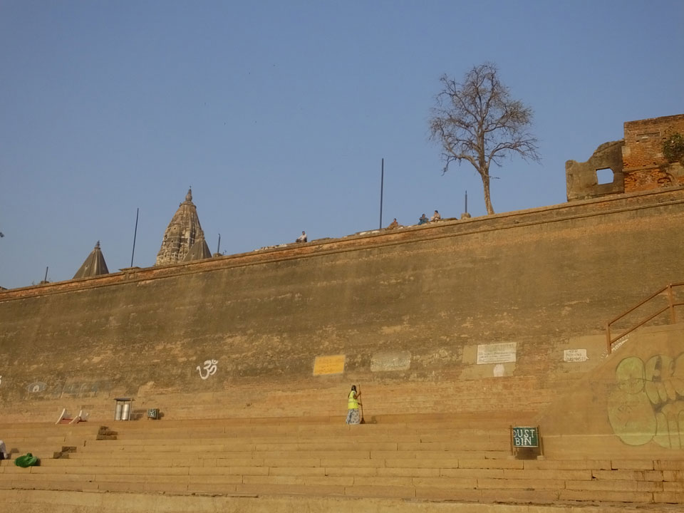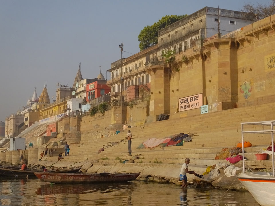 Eine tolle Atmosphäre zum Sonnenaufgang hier am Ganges. Mit der Luftverschmutzung läuft der Sonnenaufgang auch stark orange und über dem Horizont ab. Am Ufer badeten die ersten Leute, wuschen Sachen. Viele Bettlaken wurden zum Trocknen auf die Treppen gelegt. Wenn man sich wundert, warum indische Bettwäsche oft Schmutzstreifen hat, wundert einen das nach diesem Anblick nicht mehr.