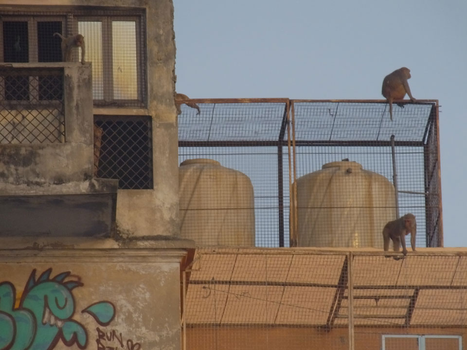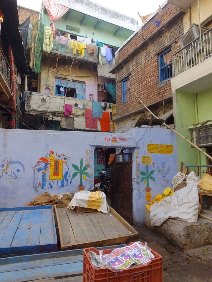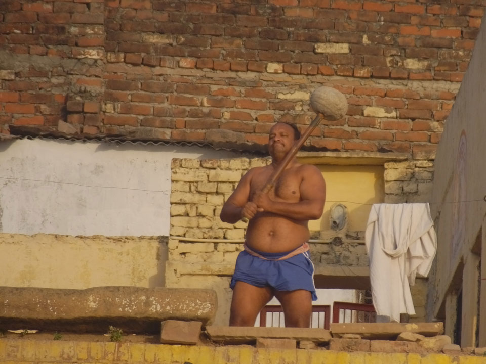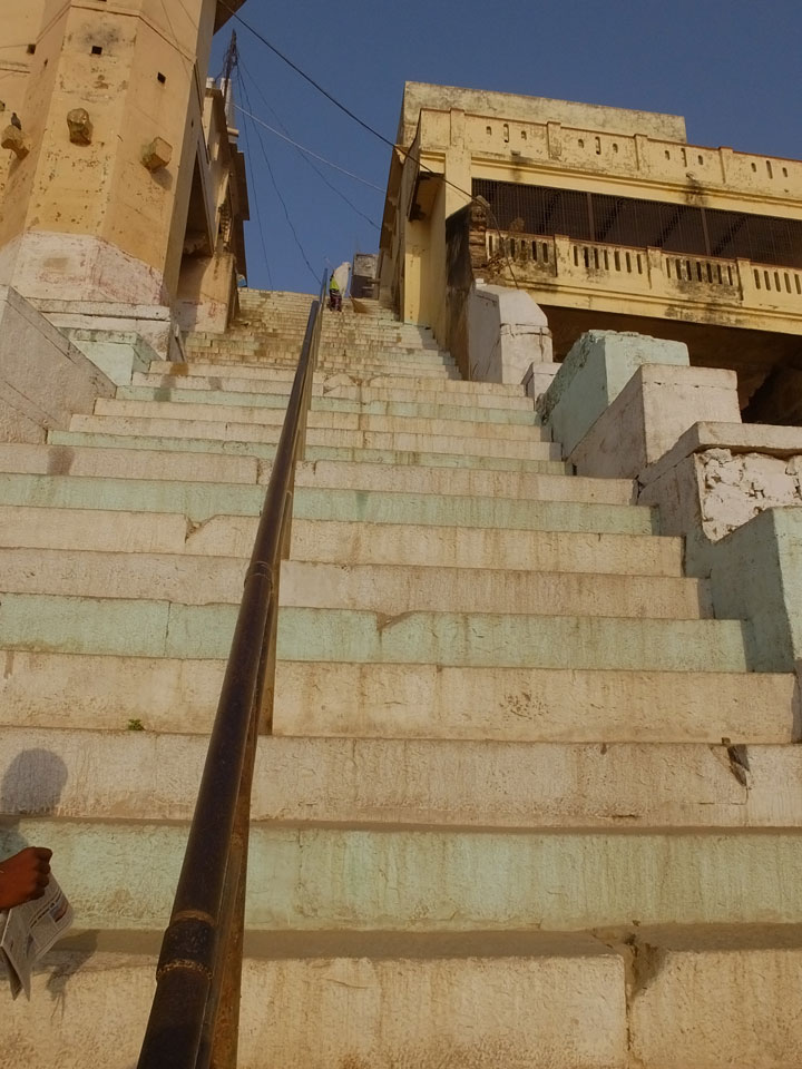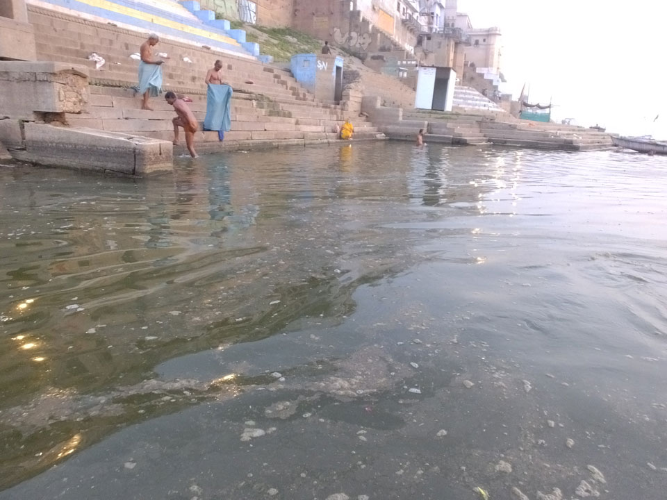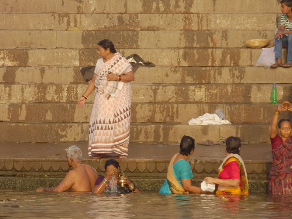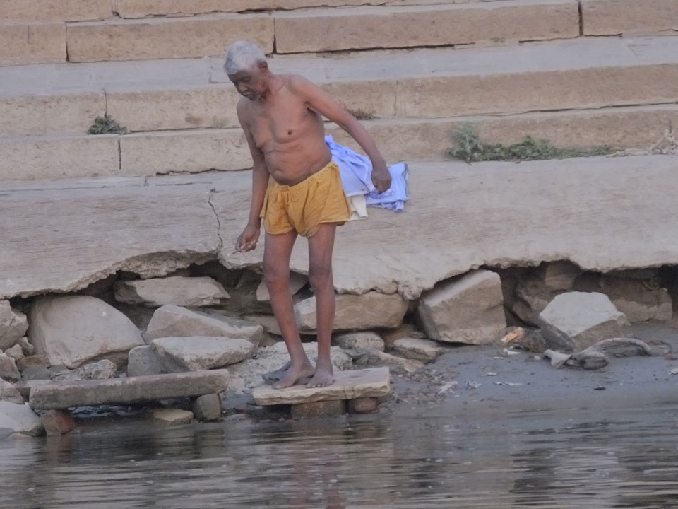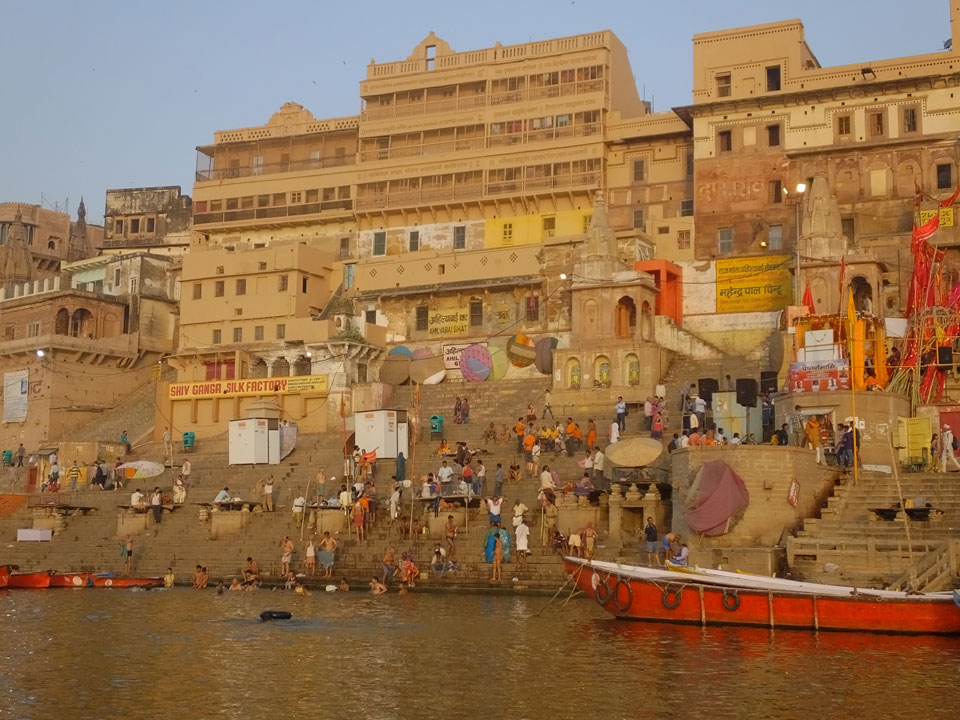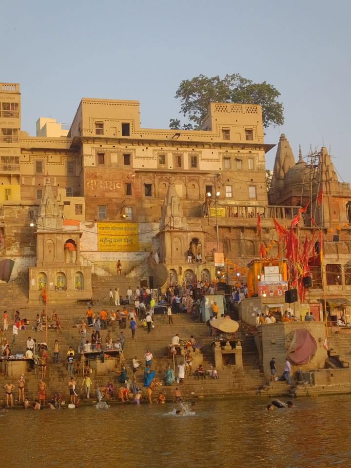 Eine tolle Atmosphäre zum Sonnenaufgang hier am Ganges. Mit der Luftverschmutzung läuft der Sonnenaufgang auch stark orange und über dem Horizont ab. Am Ufer badeten die ersten Leute, wuschen Sachen. Viele Bettlaken wurden zum Trocknen auf die Treppen gelegt. Wenn man sich wundert, warum indische Bettwäsche oft Schmutzstreifen hat, wundert einen das nach diesem Anblick nicht mehr.