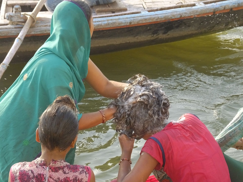 Ich fand das alles fantastisch. Unser Ruderer hatte ordentlich Mukkies. Wir kamen wieder an den Gebets-Ghats, wo mit Lautsprecher-Unterstützung gesungen wurde. Den zweiten Teil der Hostelgruppe trafen wir dann auch dort.