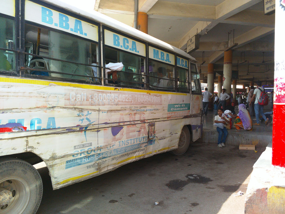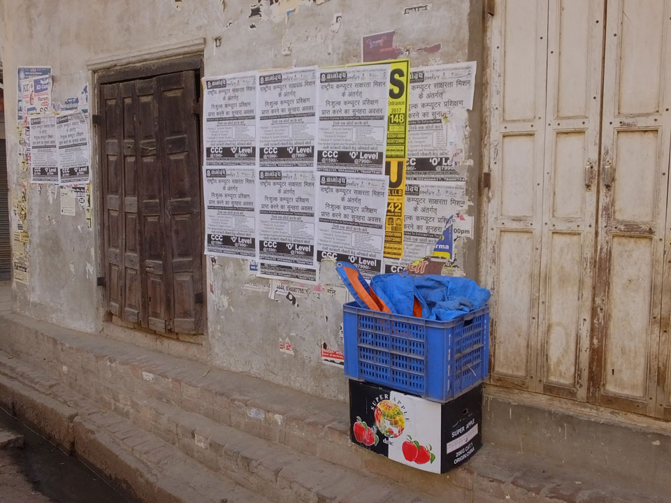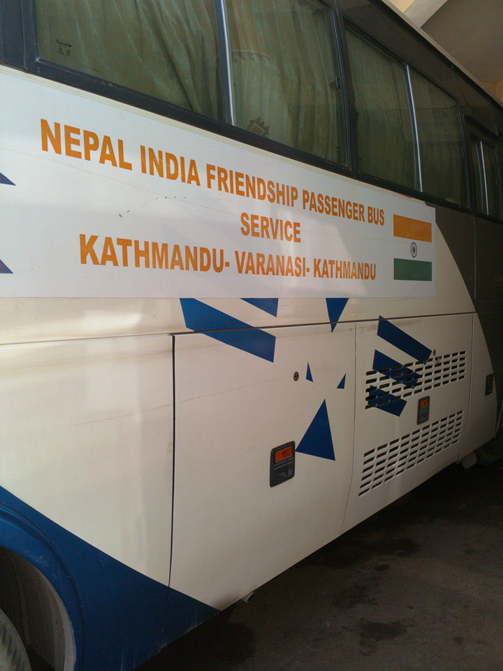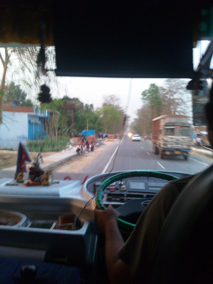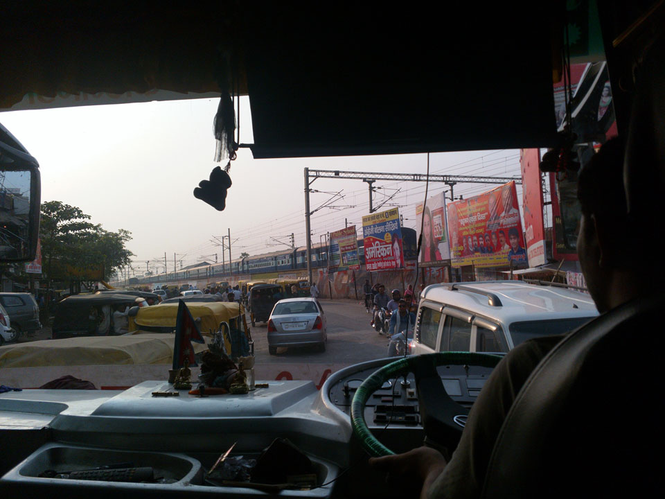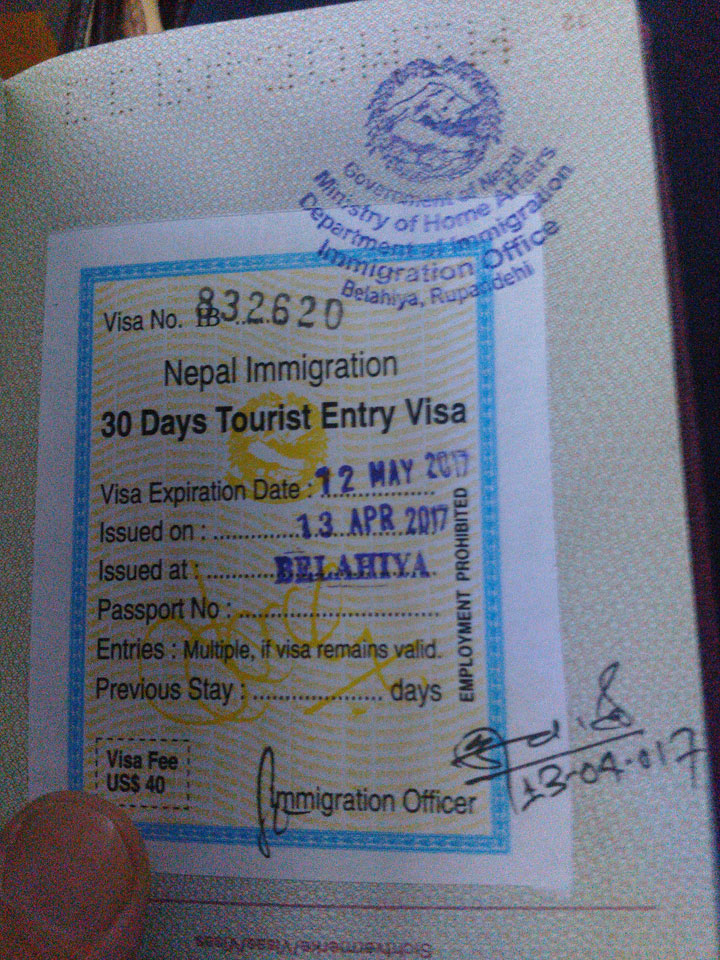 Wir kamen zur Grenze. Neben mir waren noch zwei Westler an Bord. Wir holten uns unsere Ausreisestempel. Für das 30-tägige Nepal-Visum brauchte ich 40 US-Dollar. Nix mir Euro oder so. Ein paar windige Inder wollten mir da gleich an der Grenze Dollars verkaufen doch das war nicht so einfach. Nur widerwillig kramte der Geldwechsler $40 aus dem Druckerpapierstapel hervor, legte noch ein paar nepalesische Rupien als Wechselgeld drauf. Das waren jedoch gerade mal €1,50 zu den $40, was mir gar nicht gefiel. Am Ende wollte man das Geschäft noch nicht machen, riss mir die Dollars wieder aus der Hand und gab mir den €50 Schein zurück. Der Busfahrer meinte, dass man in Nepal das auch tauschen kann – also weiter.