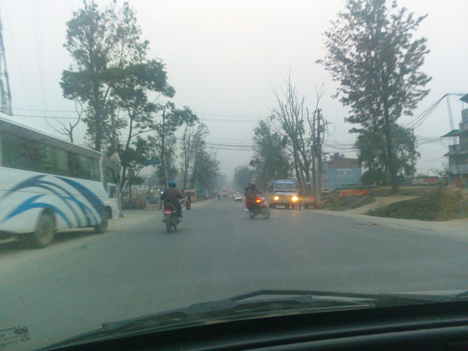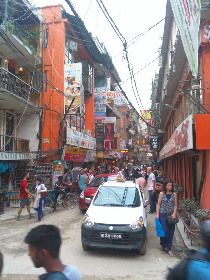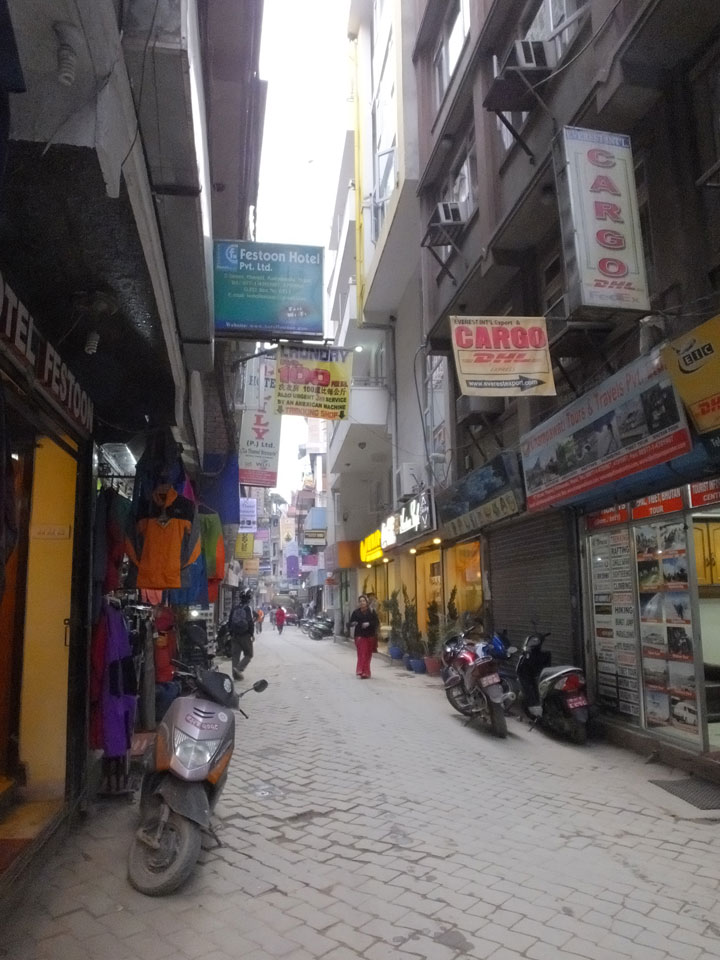Irgendwie im Morgengrauen standen wir dann da, alle verbliebenen Fahrgäste duselten vor sich. Ich wusste nicht genau, was los war, nickte hat auch immer mal weg. Dann irgendwann vor 6 wurden alle rausgelassen. Ein paar Taxis standen da. In die Thamel Gegend, wo mein Hotel war, wollte der Fahrer 300 Rupees. Gut, dass ich 350 vom Grenztausch hatte. Andere wollten sich mit mir das Taxi teilen, doch mein Rucksack nahm die komplette Rückbank in Anspruch.