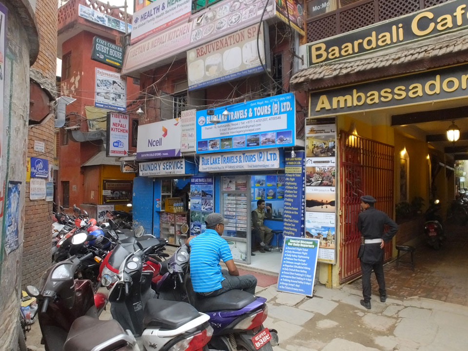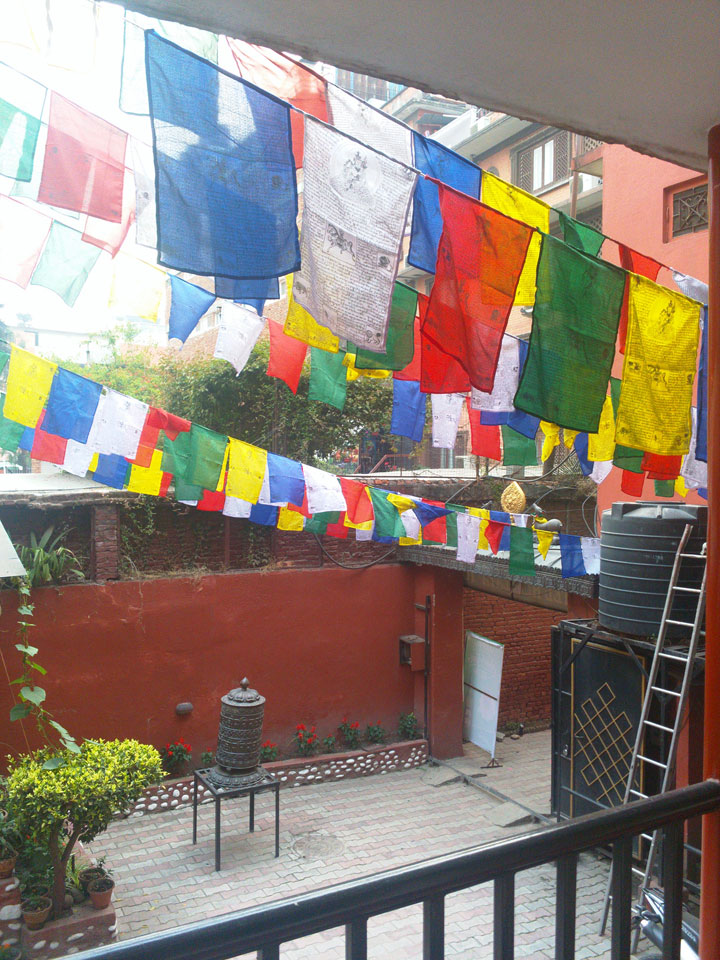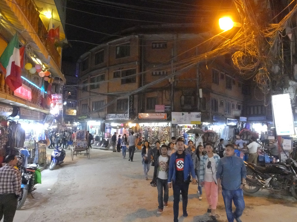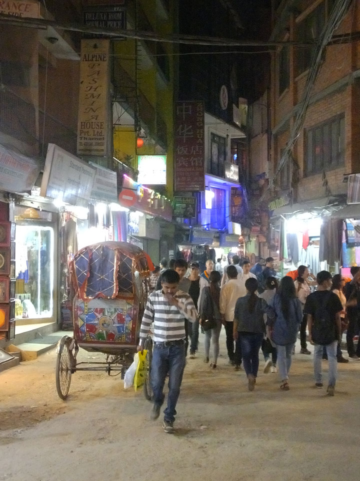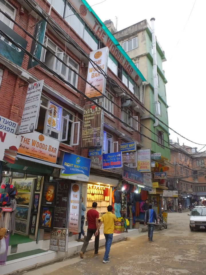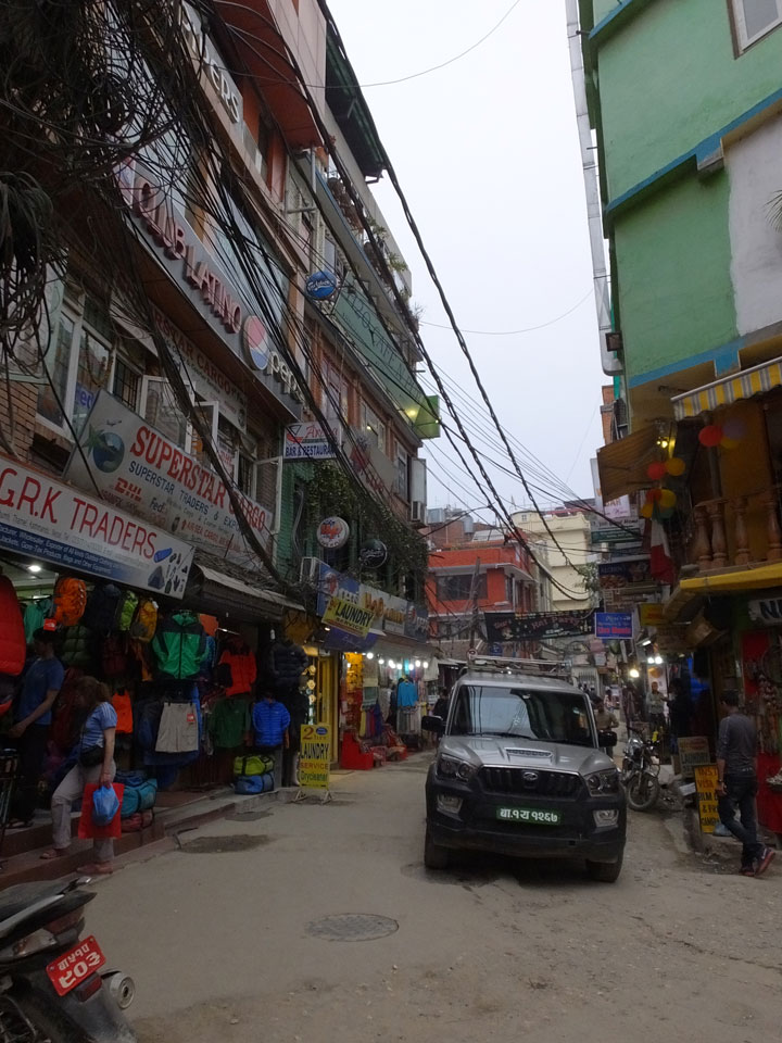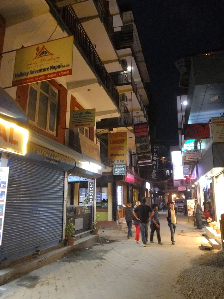Erst Abends ging ich mal raus, vom Hunger getrieben. Thamel ist megatouristisch, fast überall sind ausländische Touristen auf den Straßen. Ich holte Cash und war von den 500 Rupees (€4,80) Gebühren etwas überrascht. Dann fand ich ein ruhiges Gartenrestaurant, hatte mal ein Sandwich und Kanne Kaffee, selbst jetzt so spät (440 NRP). Für den Annapurna Trek soll man ca $25/Tag für Unterkunft und Essen benötigen.