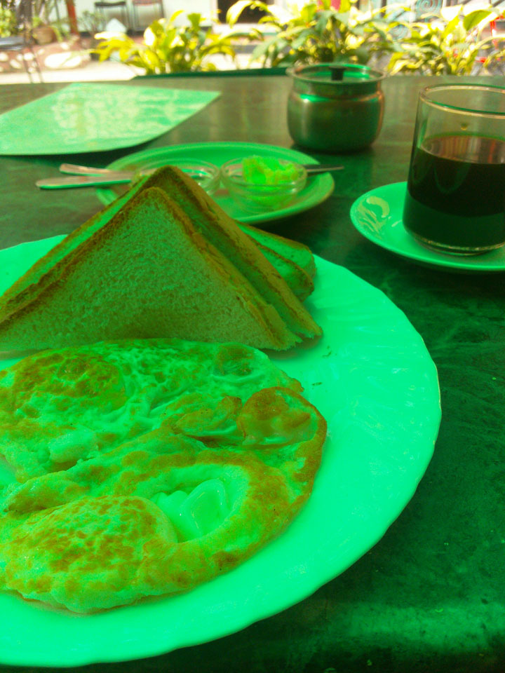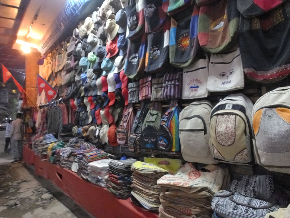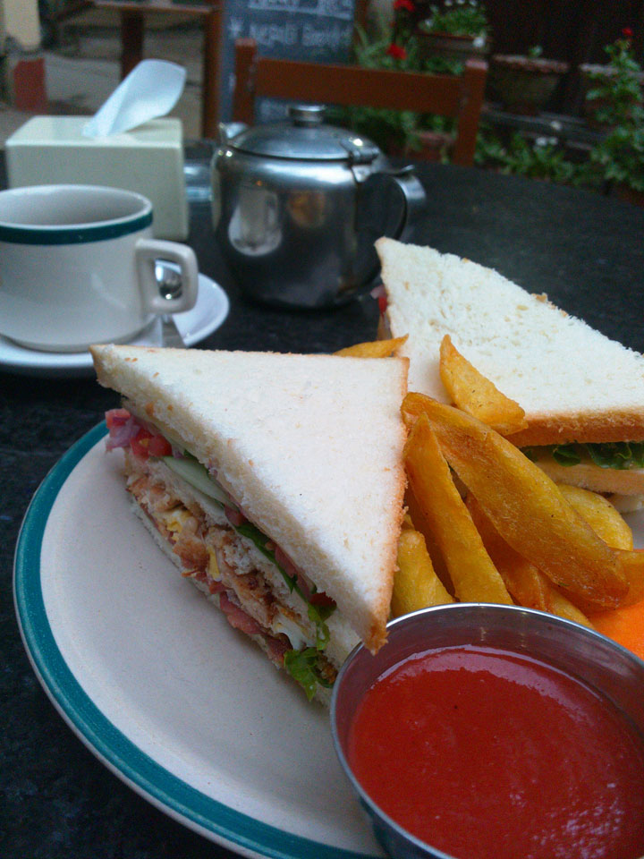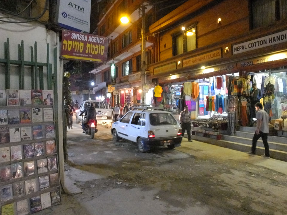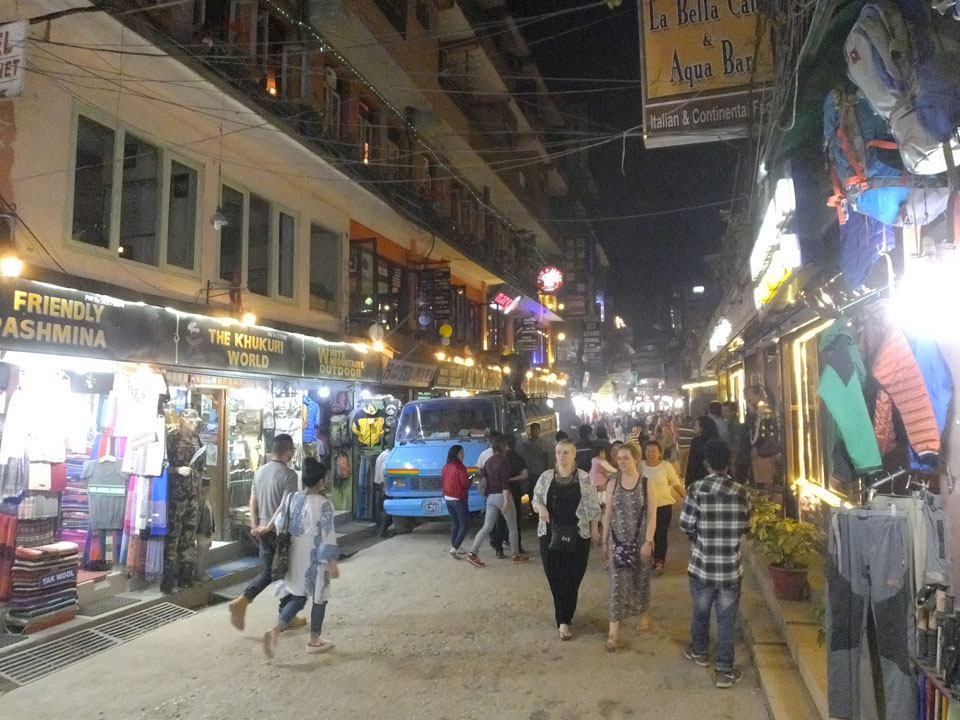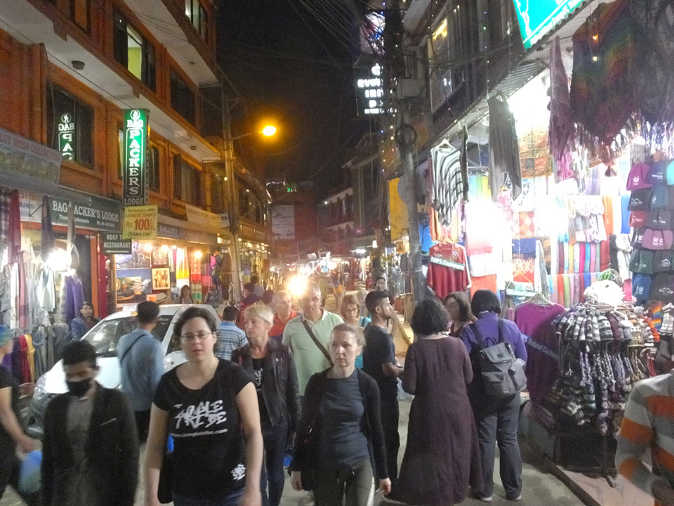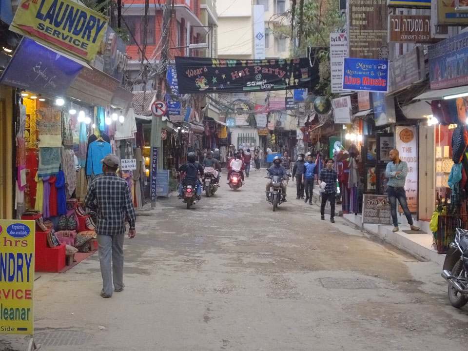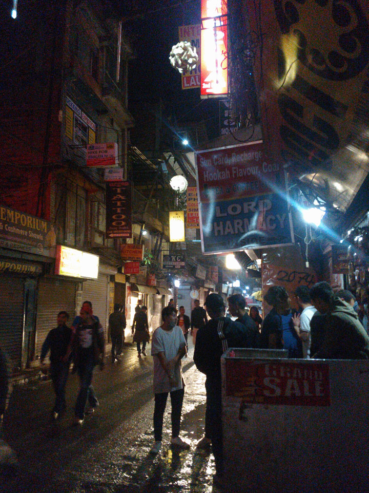 Erst Abends ging ich mal raus, vom Hunger getrieben. Thamel ist megatouristisch, fast überall sind ausländische Touristen auf den Straßen. Ich holte Cash und war von den 500 Rupees (€4,80) Gebühren etwas überrascht. Dann fand ich ein ruhiges Gartenrestaurant, hatte mal ein Sandwich und Kanne Kaffee, selbst jetzt so spät (440 NRP). Für den Annapurna Trek soll man ca $25/Tag für Unterkunft und Essen benötigen.