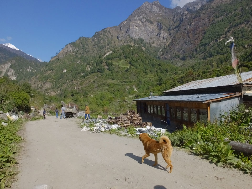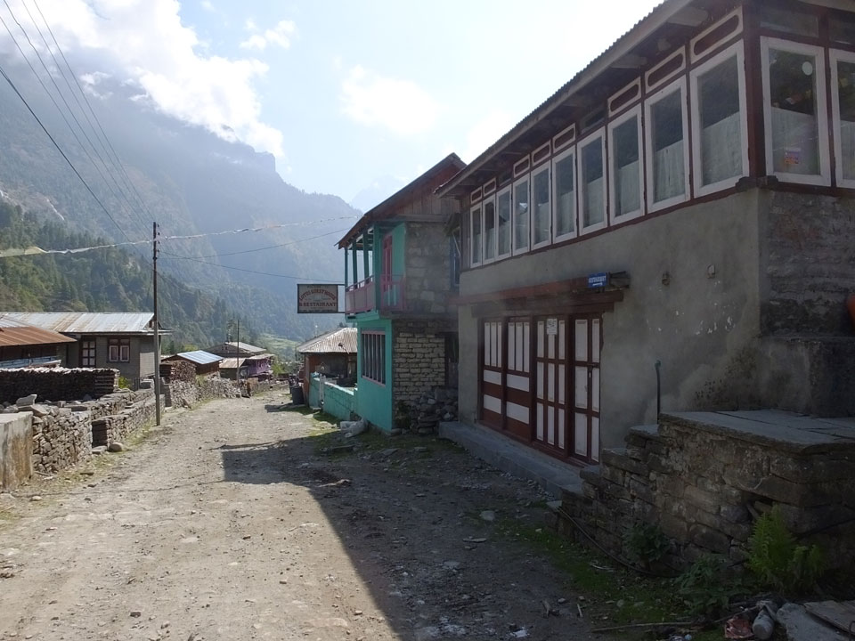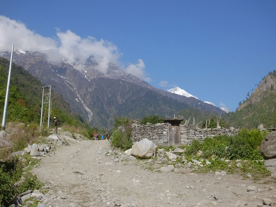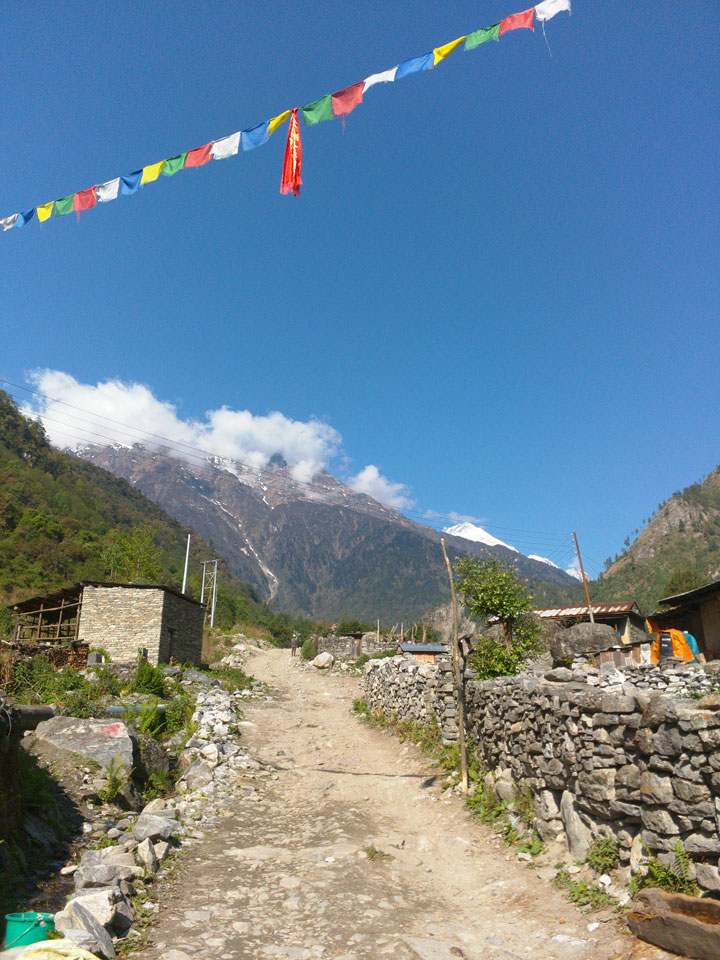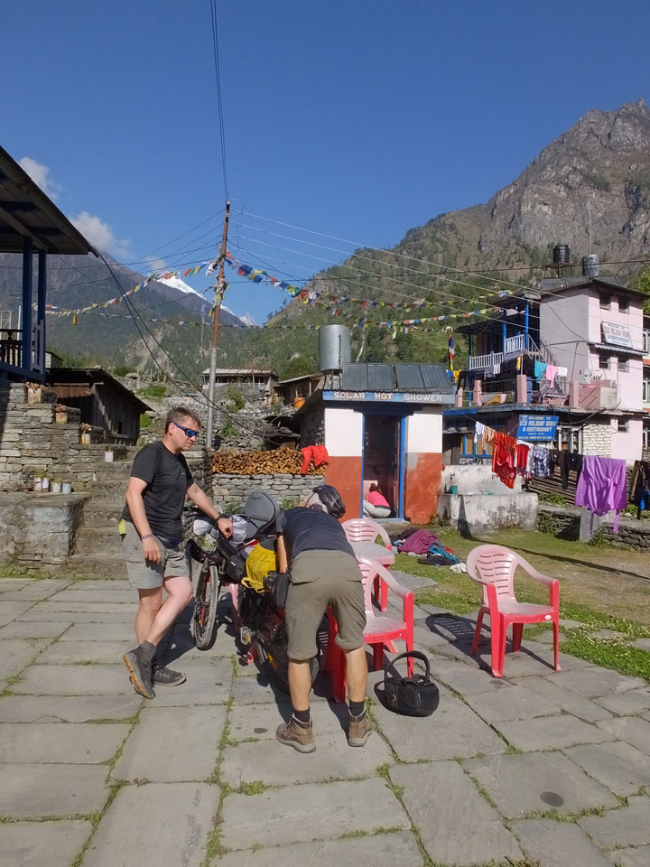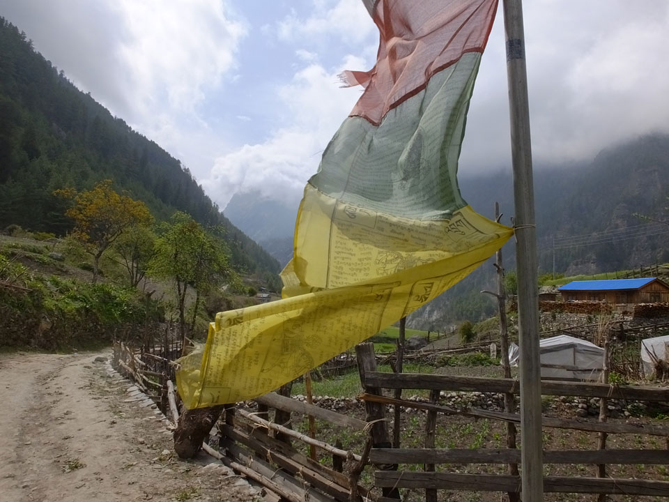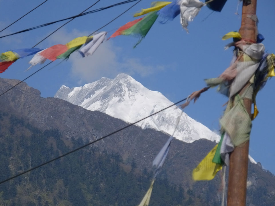 Ich hatte einen Buchweizen Fladen und Omelette zum Frühstück, was mich gut auffüllte. Das Wetter war fantastisch, sodass wir gleich einen Teil des Manaslu (8156m) in der Ferne sahen.