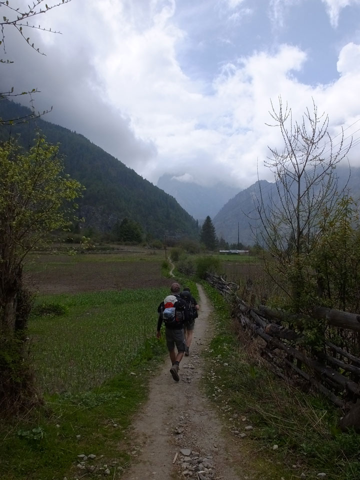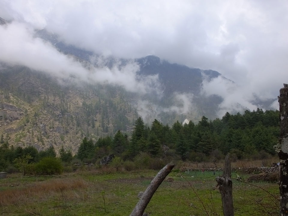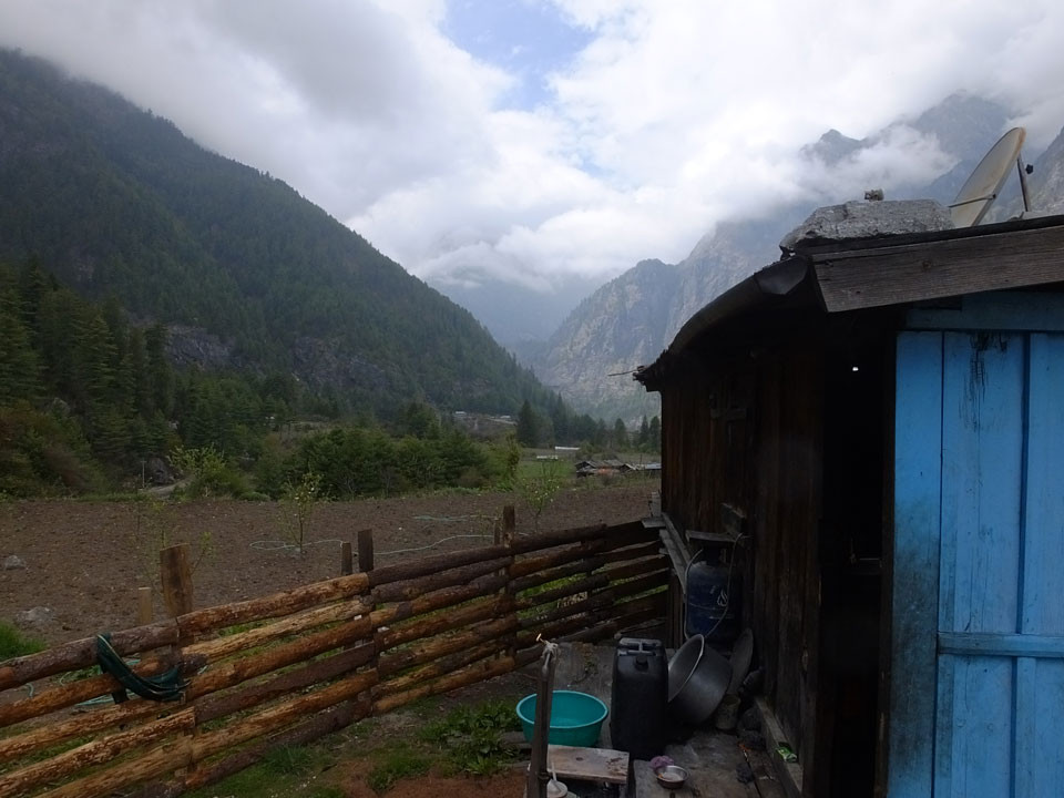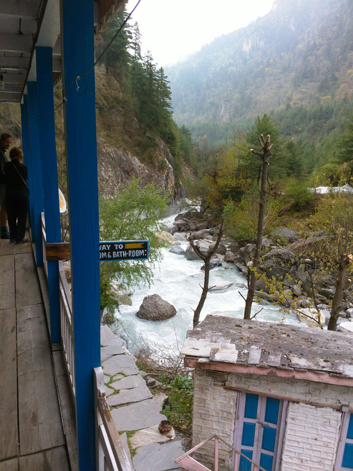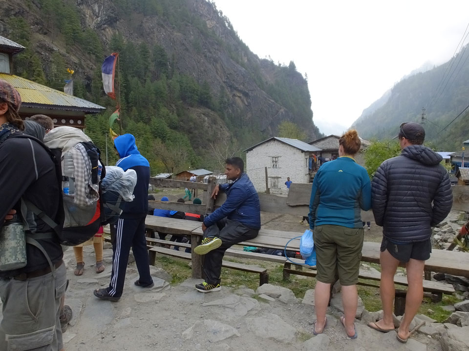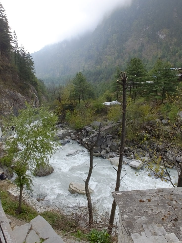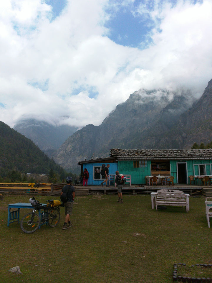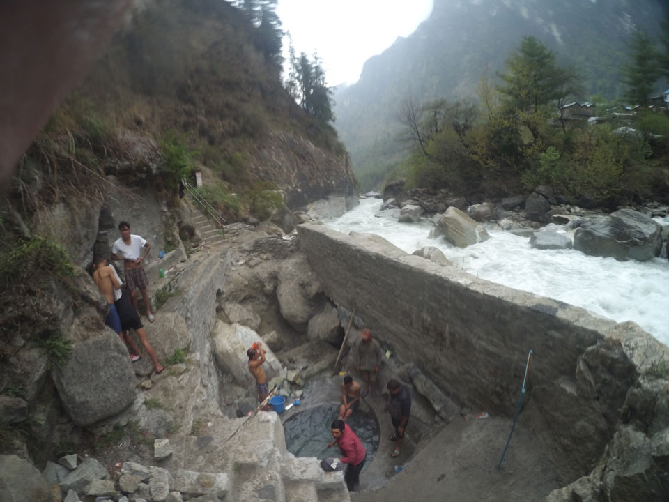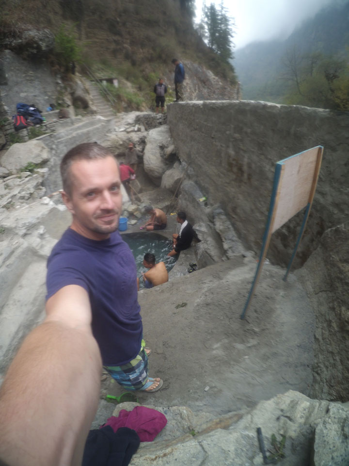 In Chame dann rief die Französin von der gegenüberliegenden Seite aus einem Hotel. Sie war doch schneller unterwegs als wir, was eigentlich unglaublich war. Wir checkten in dem Hotel ein. Ich hatte ein kleines Zimmer mitd em Deutschen. Das Wetter hatte sich heute den ganzen Tag schon zu gezogen, doch hier gab es heiße Quellen, gleich in der Nähe. Ich schnappte also meine Badehose und ging in das heiße Bad – ein kleiner Betonpool. Aber wie fantastisch das war! Das Wasser war so gut und heiß. Genau richtig für meinen Rücken und die Schultern. Ganz so lange konnte man da nicht drin bleiben. Ein paar Nepali saßen da auch da, rauchten einen Joint.