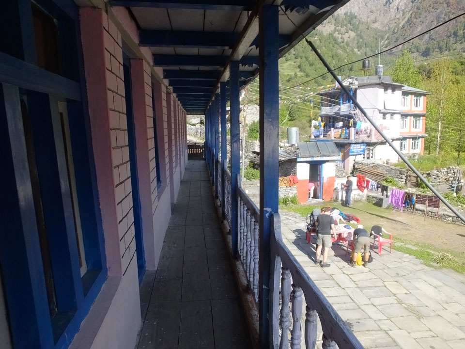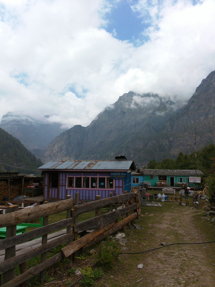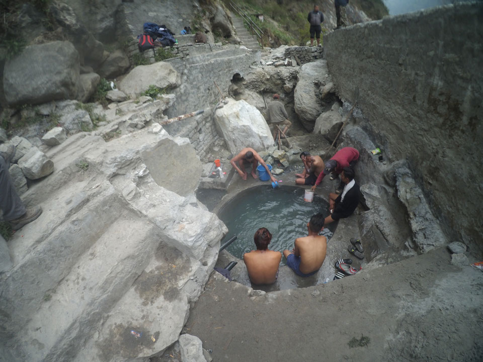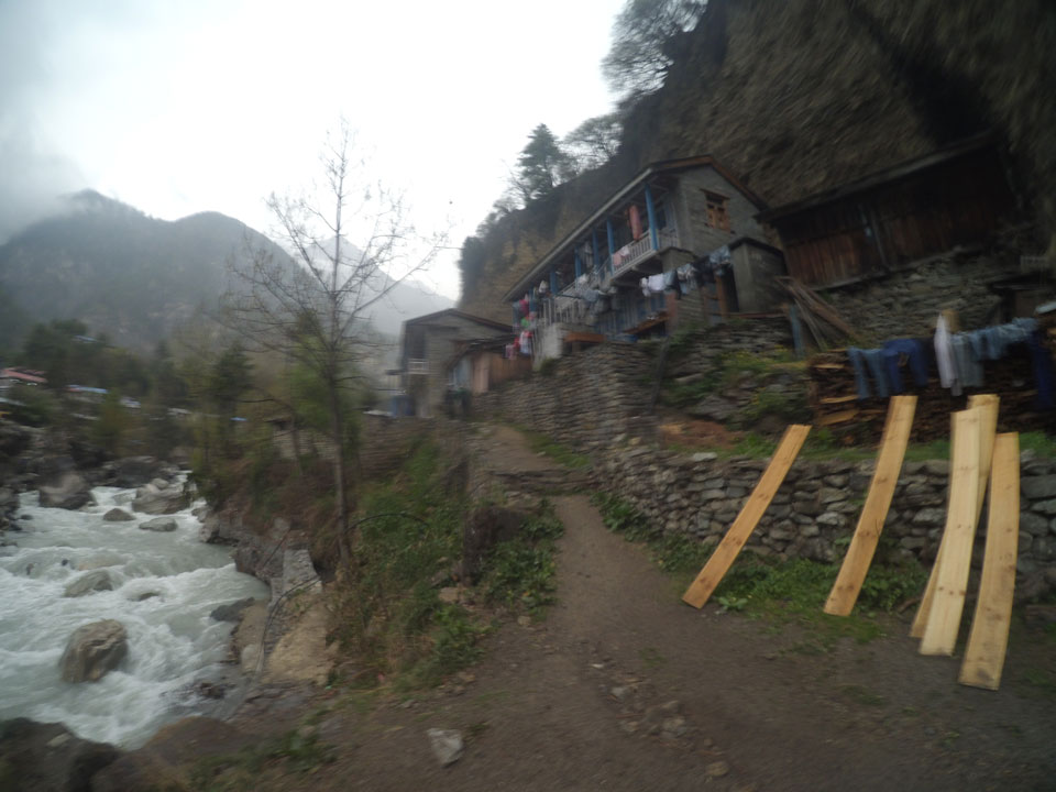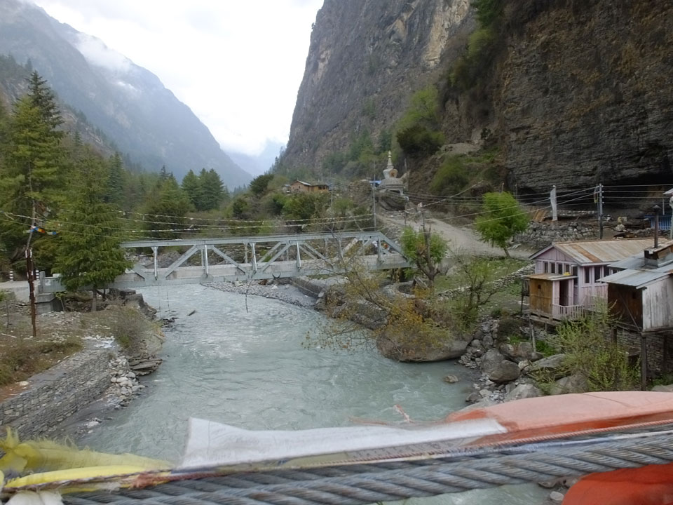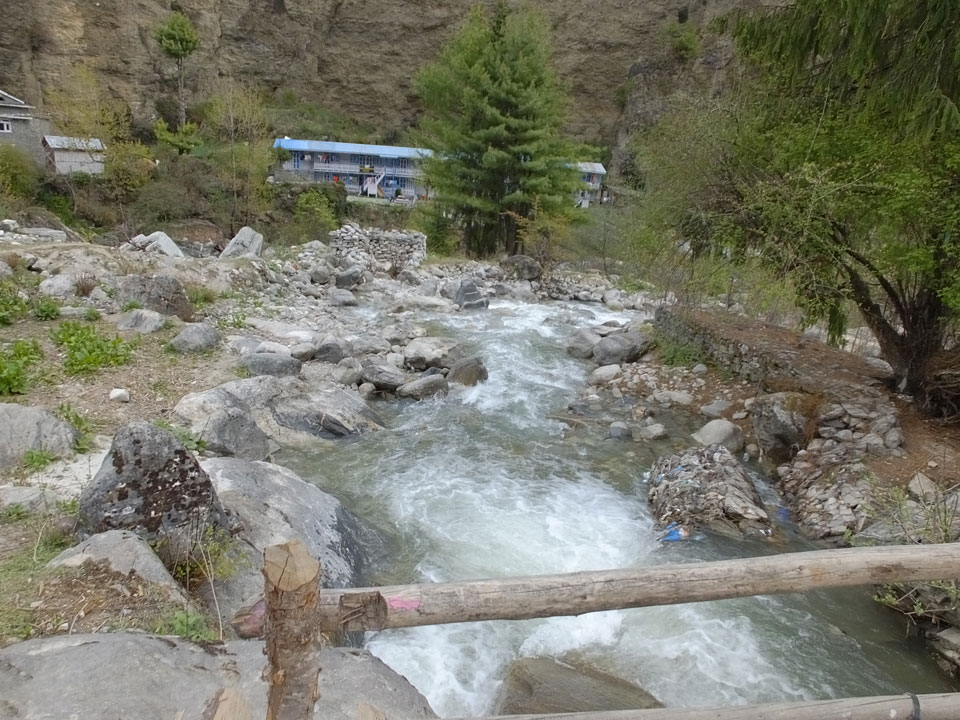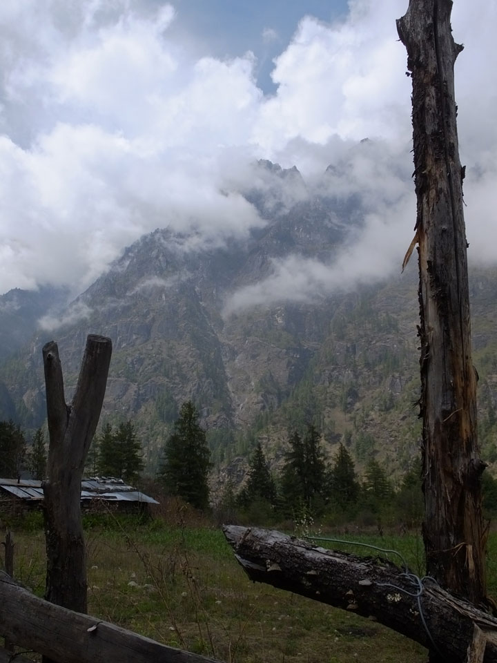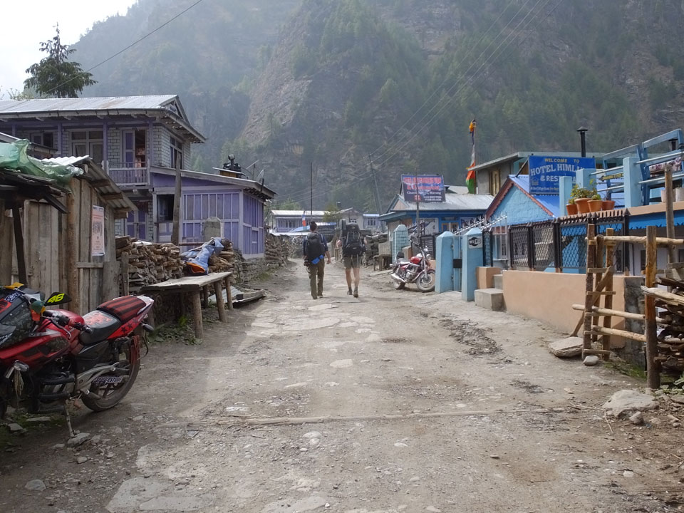 In Chame dann rief die Französin von der gegenüberliegenden Seite aus einem Hotel. Sie war doch schneller unterwegs als wir, was eigentlich unglaublich war. Wir checkten in dem Hotel ein. Ich hatte ein kleines Zimmer mitd em Deutschen. Das Wetter hatte sich heute den ganzen Tag schon zu gezogen, doch hier gab es heiße Quellen, gleich in der Nähe. Ich schnappte also meine Badehose und ging in das heiße Bad – ein kleiner Betonpool. Aber wie fantastisch das war! Das Wasser war so gut und heiß. Genau richtig für meinen Rücken und die Schultern. Ganz so lange konnte man da nicht drin bleiben. Ein paar Nepali saßen da auch da, rauchten einen Joint.
