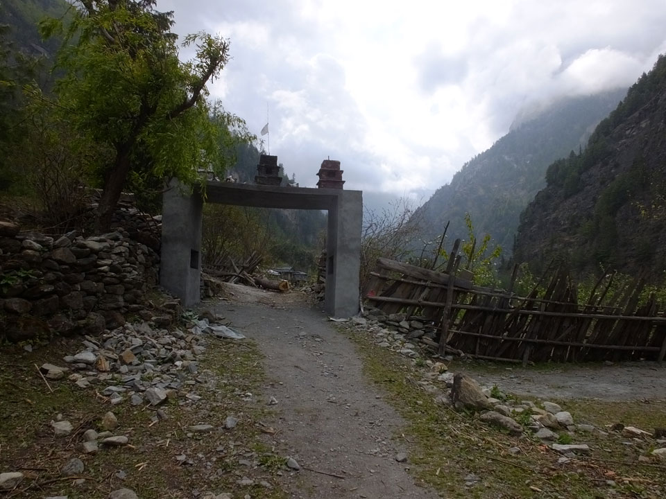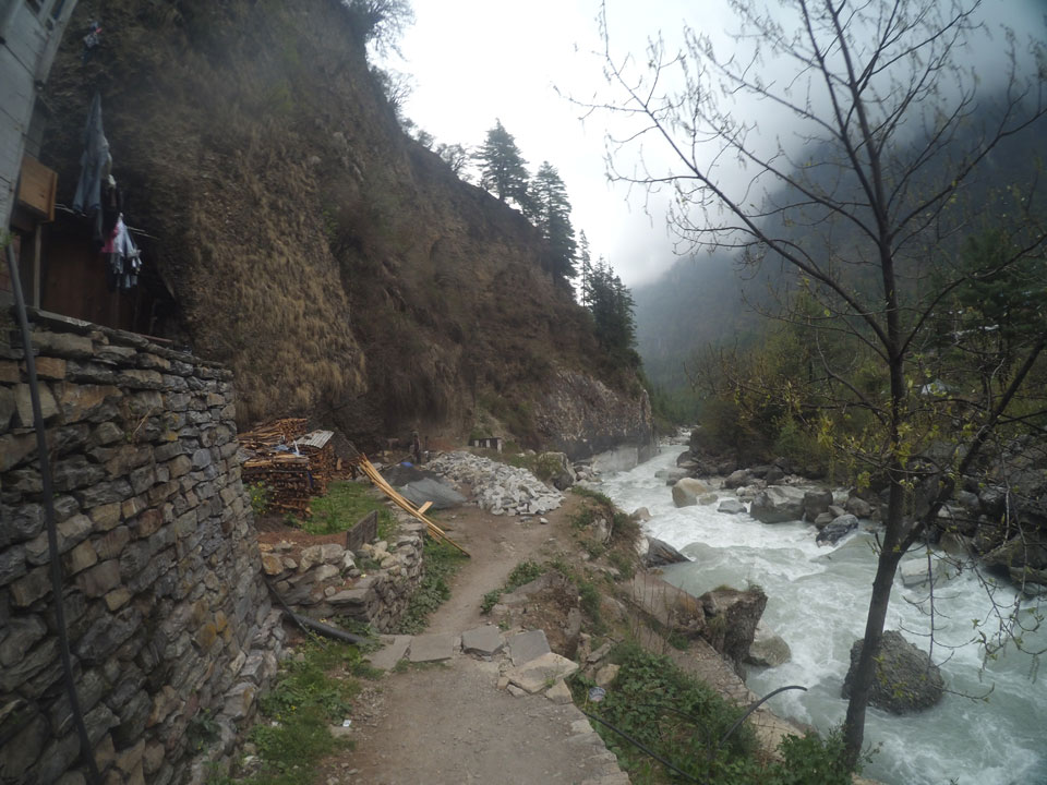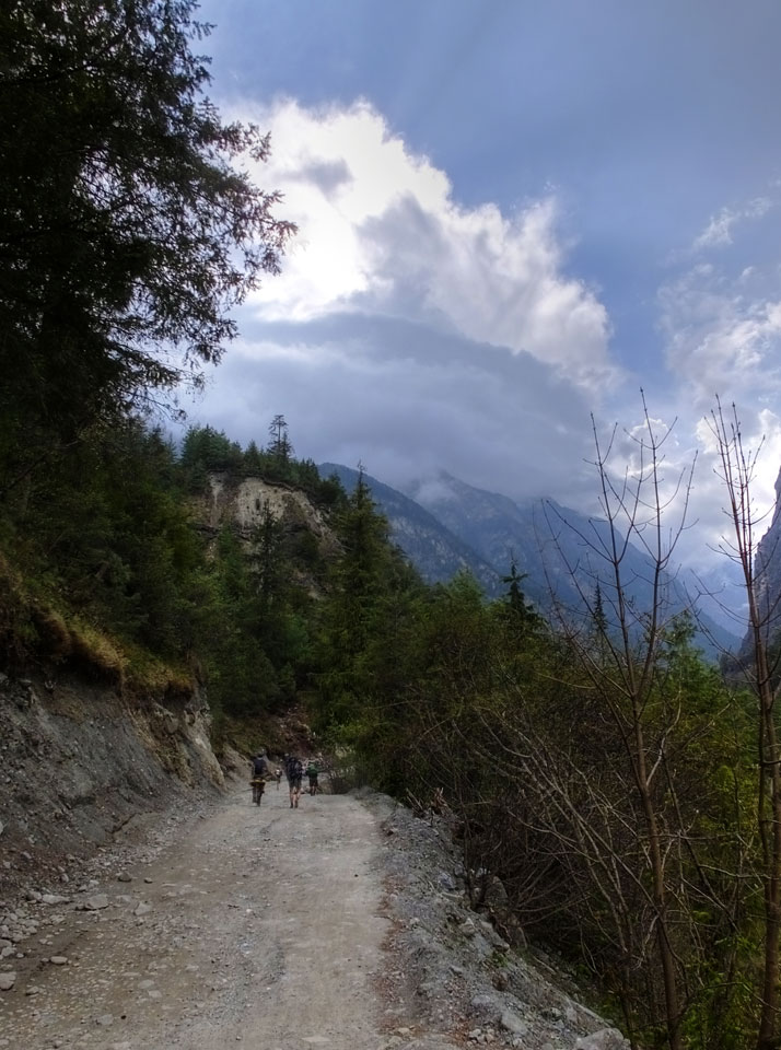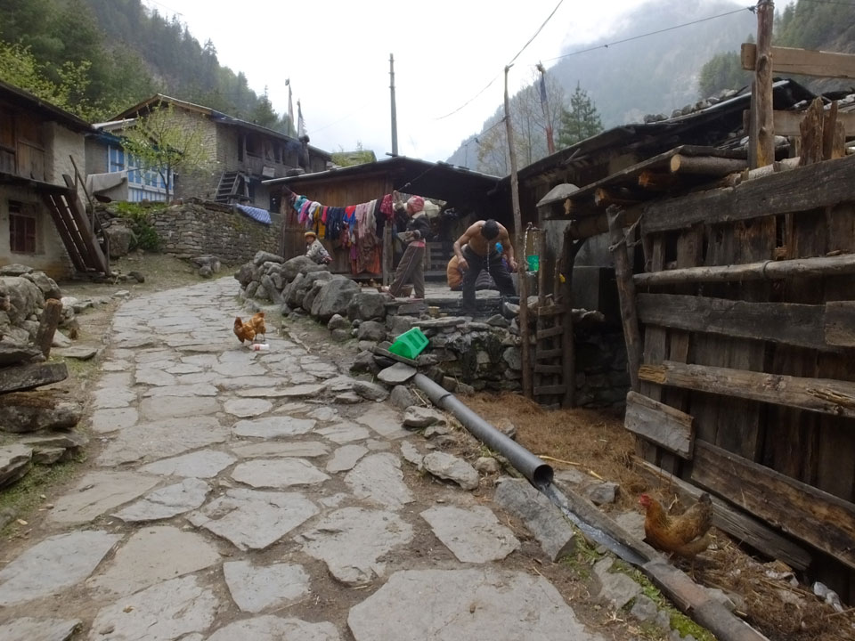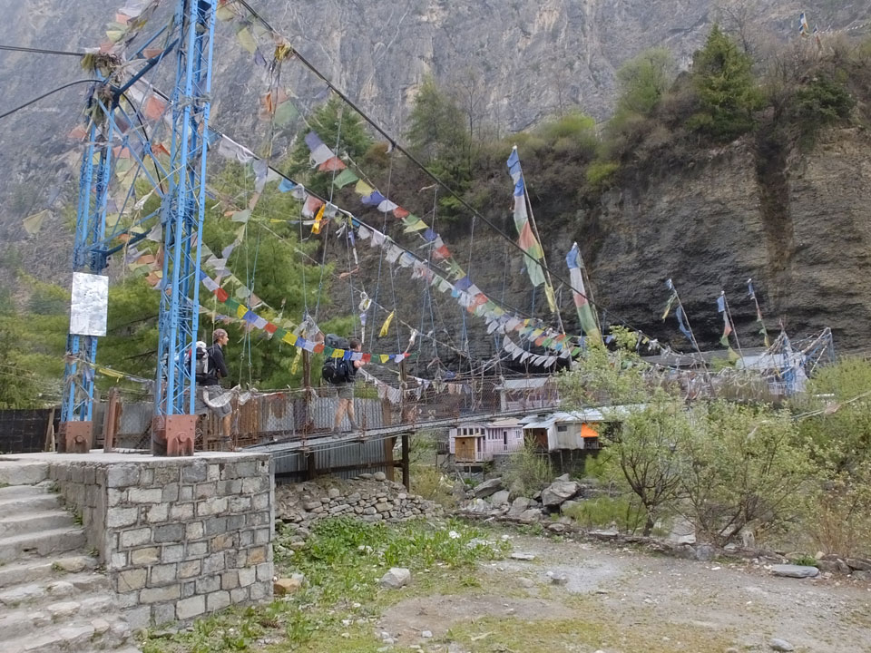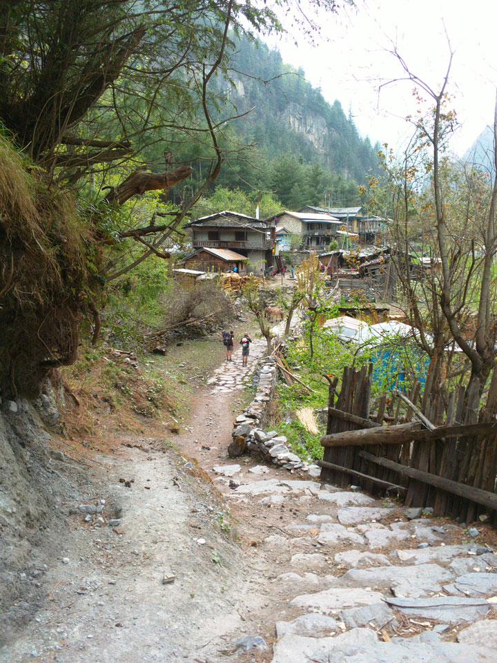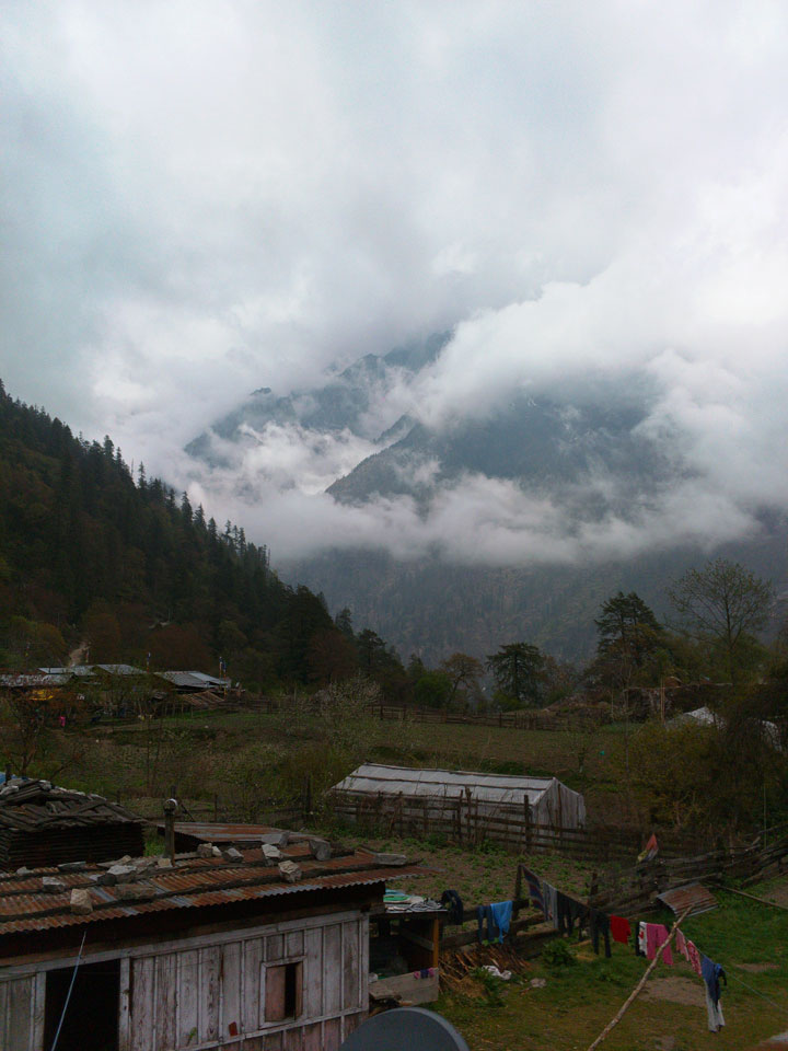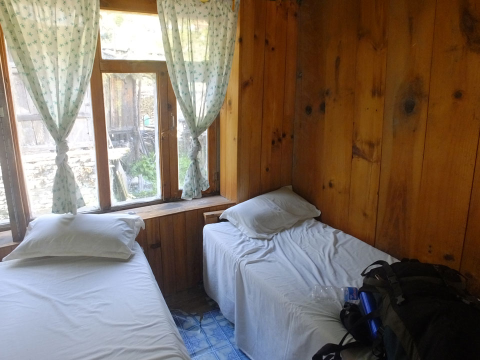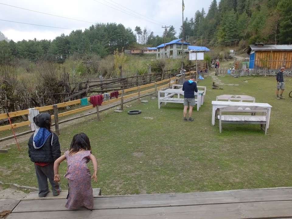 In Chame dann rief die Französin von der gegenüberliegenden Seite aus einem Hotel. Sie war doch schneller unterwegs als wir, was eigentlich unglaublich war. Wir checkten in dem Hotel ein. Ich hatte ein kleines Zimmer mitd em Deutschen. Das Wetter hatte sich heute den ganzen Tag schon zu gezogen, doch hier gab es heiße Quellen, gleich in der Nähe. Ich schnappte also meine Badehose und ging in das heiße Bad – ein kleiner Betonpool. Aber wie fantastisch das war! Das Wasser war so gut und heiß. Genau richtig für meinen Rücken und die Schultern. Ganz so lange konnte man da nicht drin bleiben. Ein paar Nepali saßen da auch da, rauchten einen Joint.