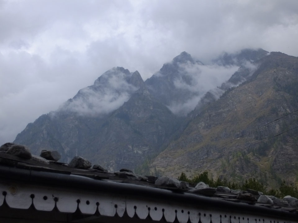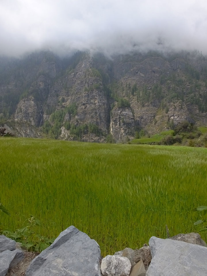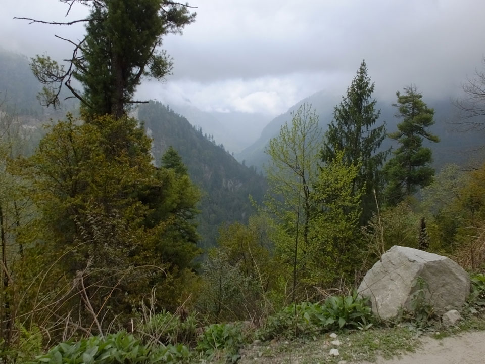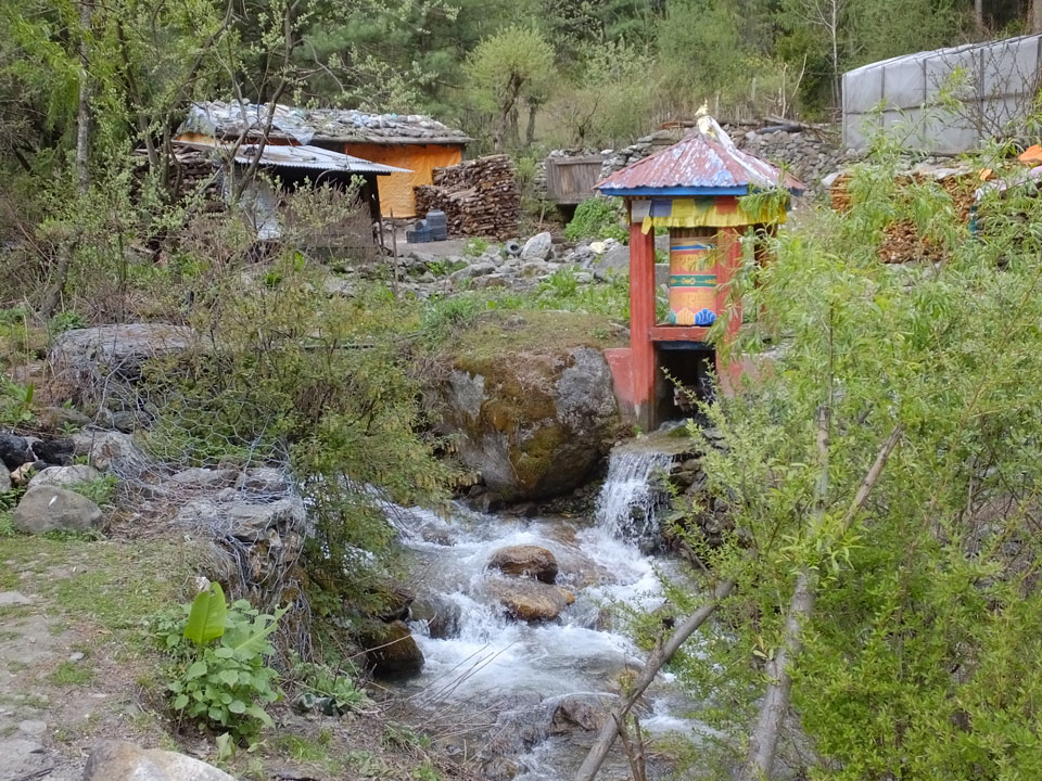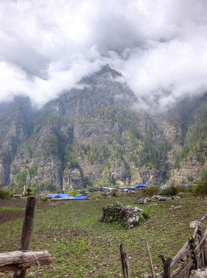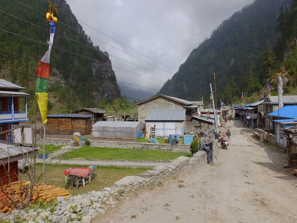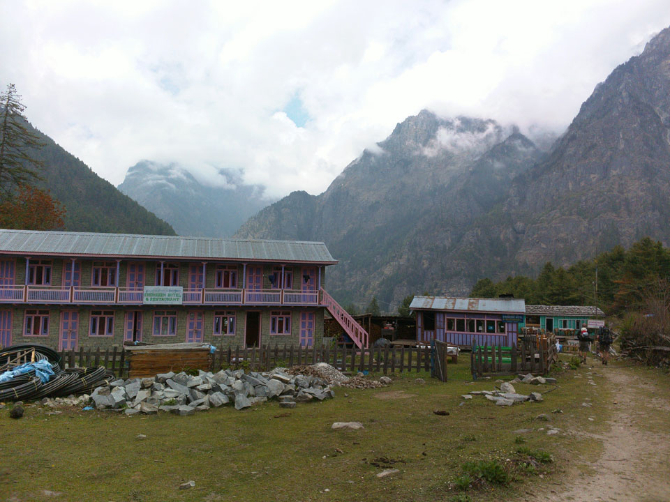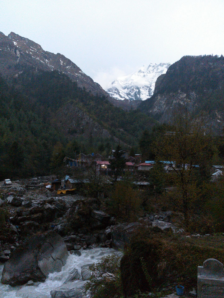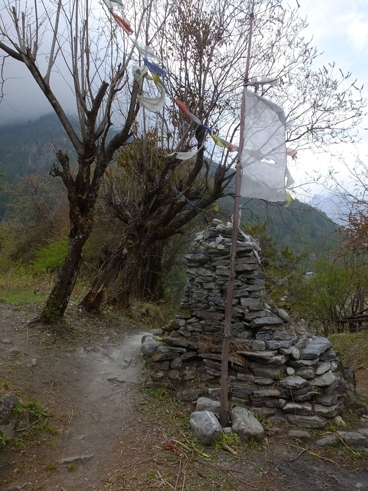 In Chame dann rief die Französin von der gegenüberliegenden Seite aus einem Hotel. Sie war doch schneller unterwegs als wir, was eigentlich unglaublich war. Wir checkten in dem Hotel ein. Ich hatte ein kleines Zimmer mitd em Deutschen. Das Wetter hatte sich heute den ganzen Tag schon zu gezogen, doch hier gab es heiße Quellen, gleich in der Nähe. Ich schnappte also meine Badehose und ging in das heiße Bad – ein kleiner Betonpool. Aber wie fantastisch das war! Das Wasser war so gut und heiß. Genau richtig für meinen Rücken und die Schultern. Ganz so lange konnte man da nicht drin bleiben. Ein paar Nepali saßen da auch da, rauchten einen Joint.