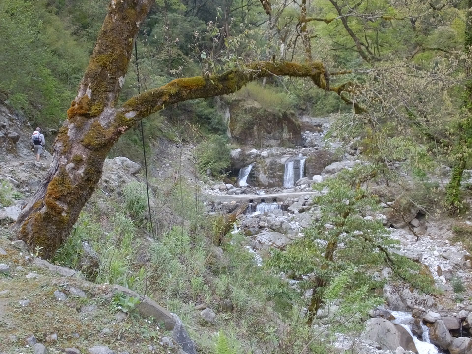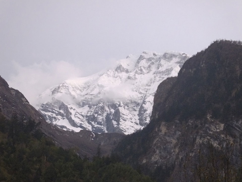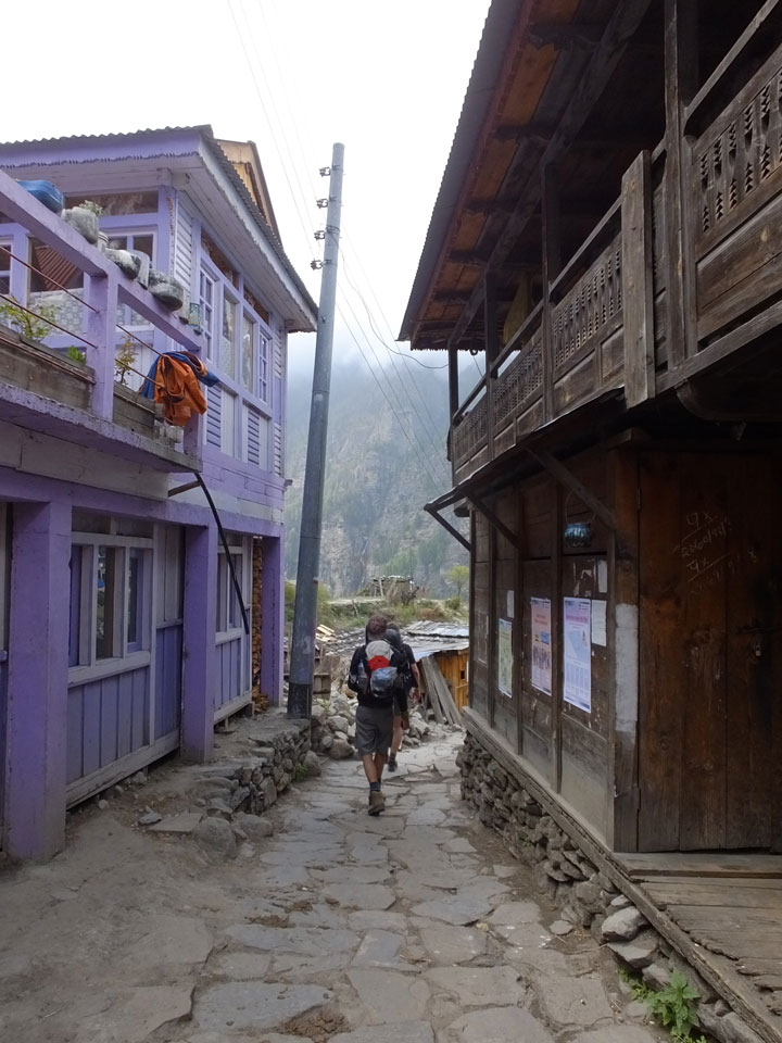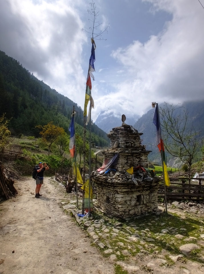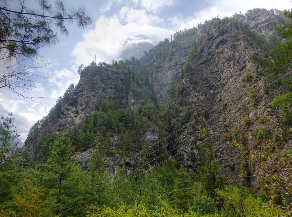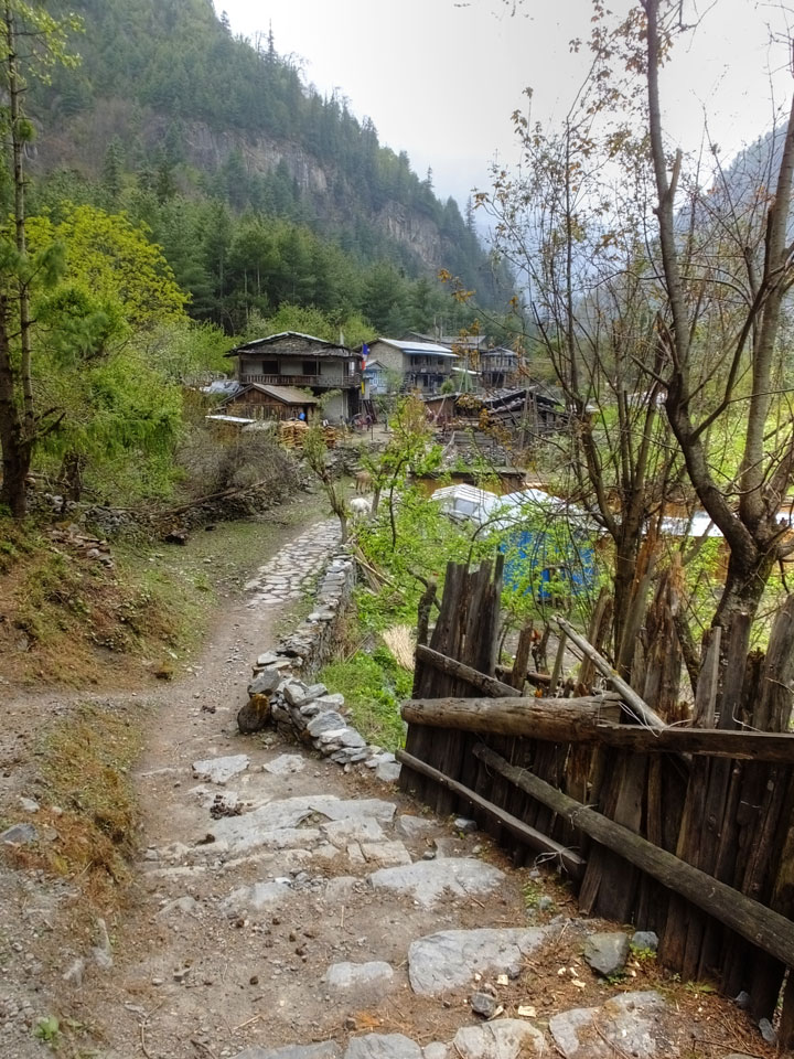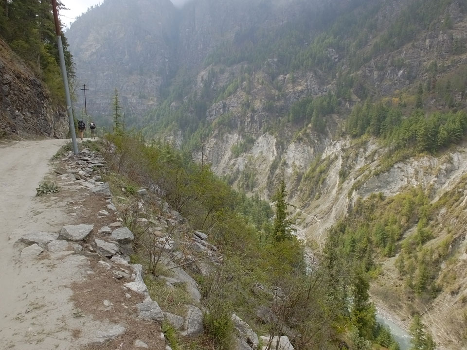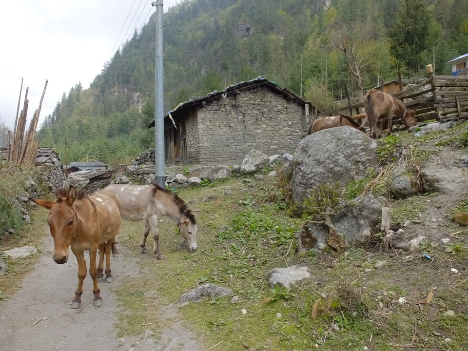 In Chame dann rief die Französin von der gegenüberliegenden Seite aus einem Hotel. Sie war doch schneller unterwegs als wir, was eigentlich unglaublich war. Wir checkten in dem Hotel ein. Ich hatte ein kleines Zimmer mitd em Deutschen. Das Wetter hatte sich heute den ganzen Tag schon zu gezogen, doch hier gab es heiße Quellen, gleich in der Nähe. Ich schnappte also meine Badehose und ging in das heiße Bad – ein kleiner Betonpool. Aber wie fantastisch das war! Das Wasser war so gut und heiß. Genau richtig für meinen Rücken und die Schultern. Ganz so lange konnte man da nicht drin bleiben. Ein paar Nepali saßen da auch da, rauchten einen Joint.