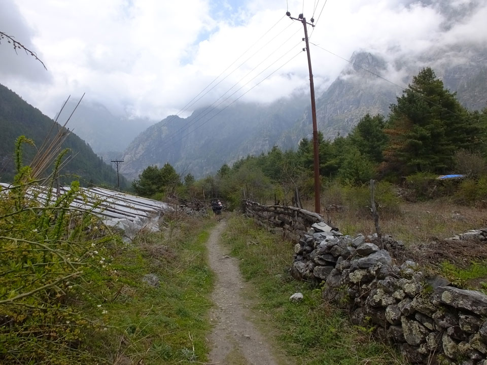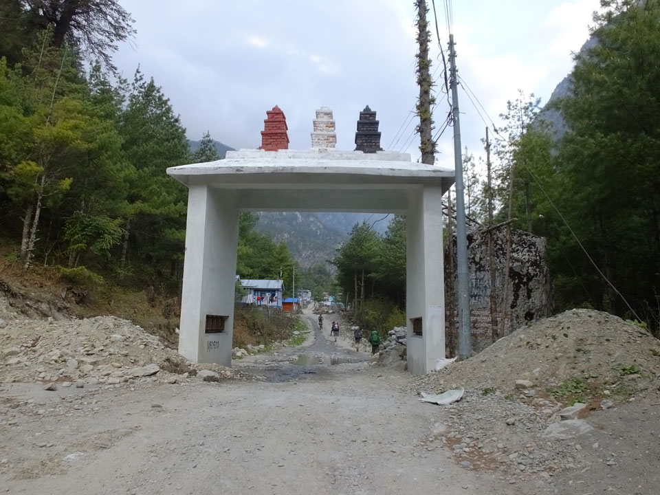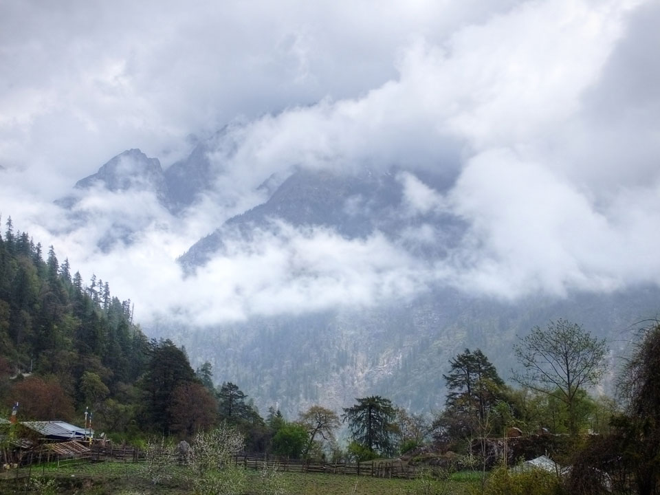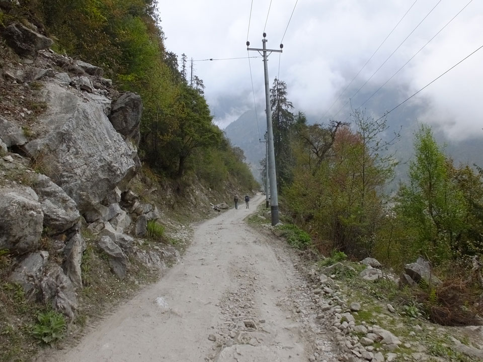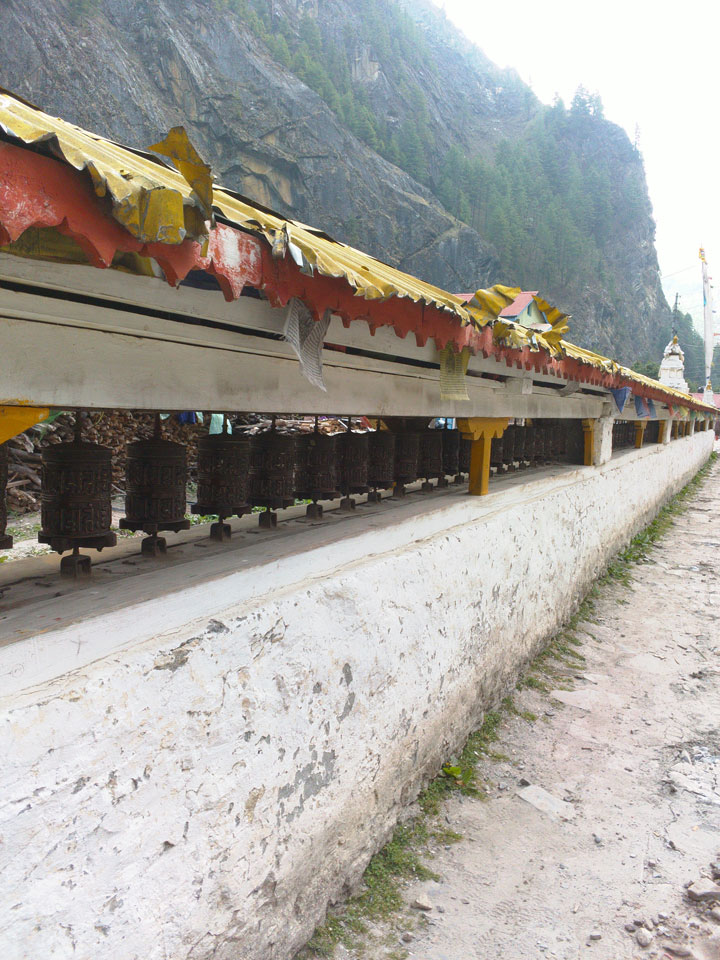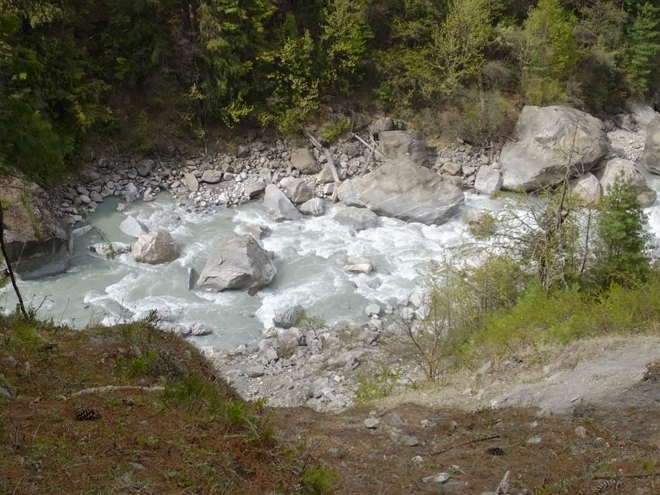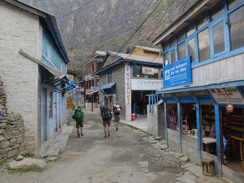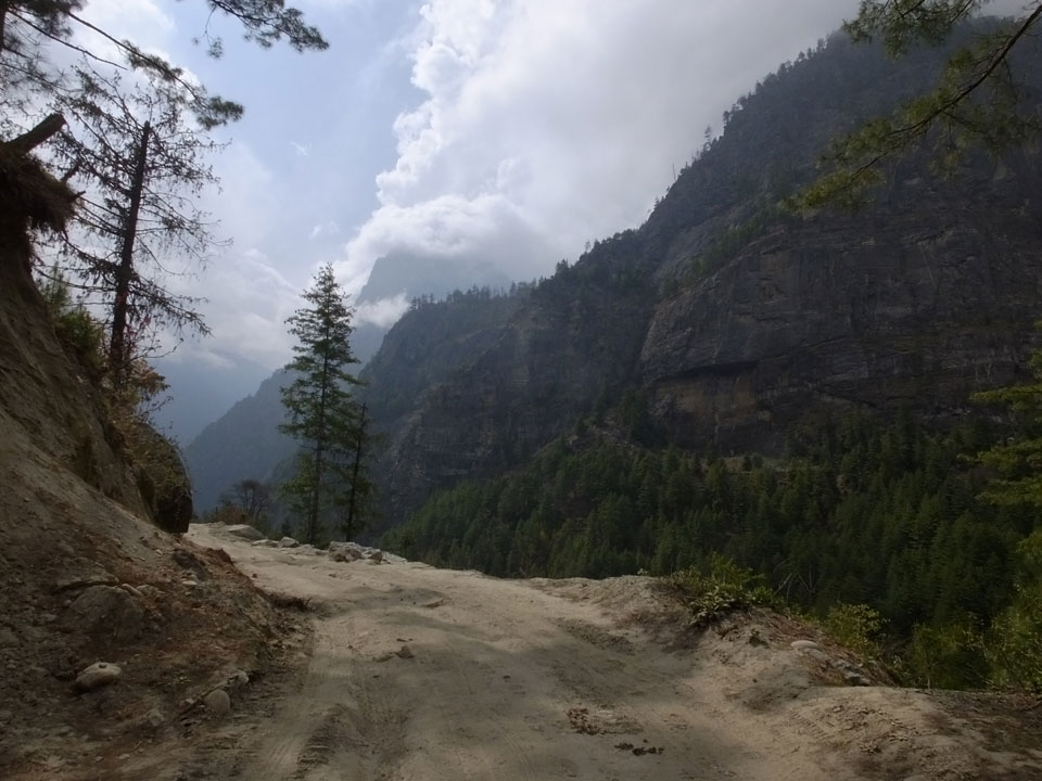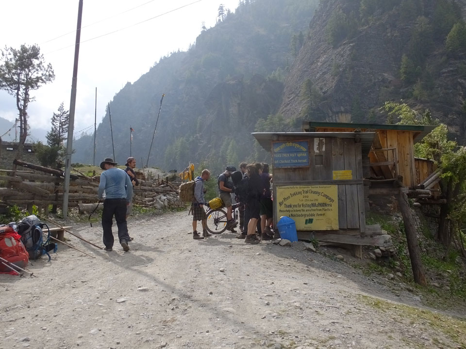 In Chame dann rief die Französin von der gegenüberliegenden Seite aus einem Hotel. Sie war doch schneller unterwegs als wir, was eigentlich unglaublich war. Wir checkten in dem Hotel ein. Ich hatte ein kleines Zimmer mitd em Deutschen. Das Wetter hatte sich heute den ganzen Tag schon zu gezogen, doch hier gab es heiße Quellen, gleich in der Nähe. Ich schnappte also meine Badehose und ging in das heiße Bad – ein kleiner Betonpool. Aber wie fantastisch das war! Das Wasser war so gut und heiß. Genau richtig für meinen Rücken und die Schultern. Ganz so lange konnte man da nicht drin bleiben. Ein paar Nepali saßen da auch da, rauchten einen Joint.