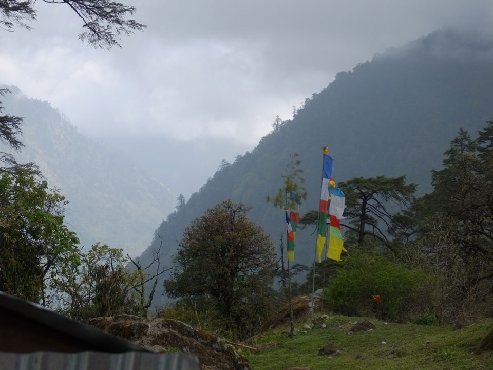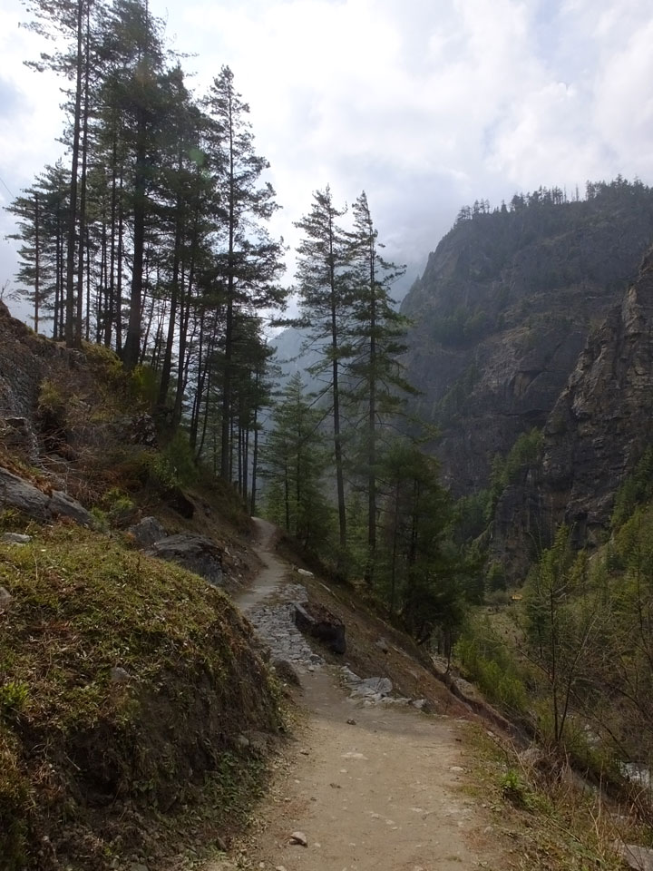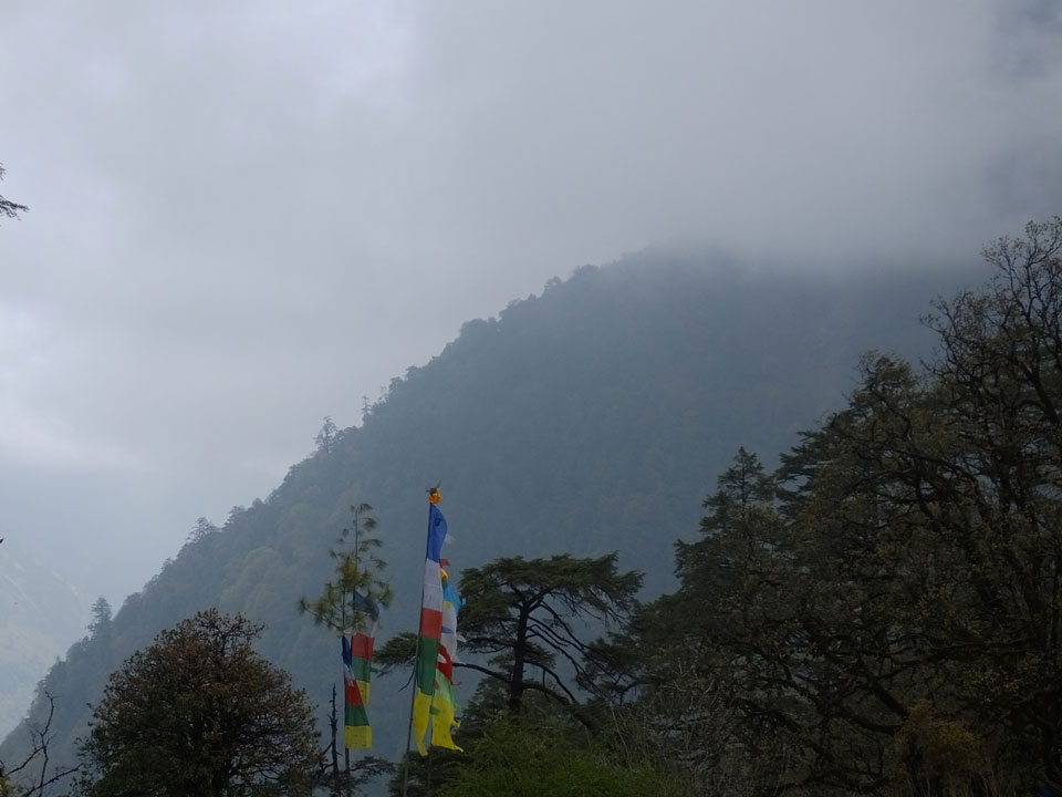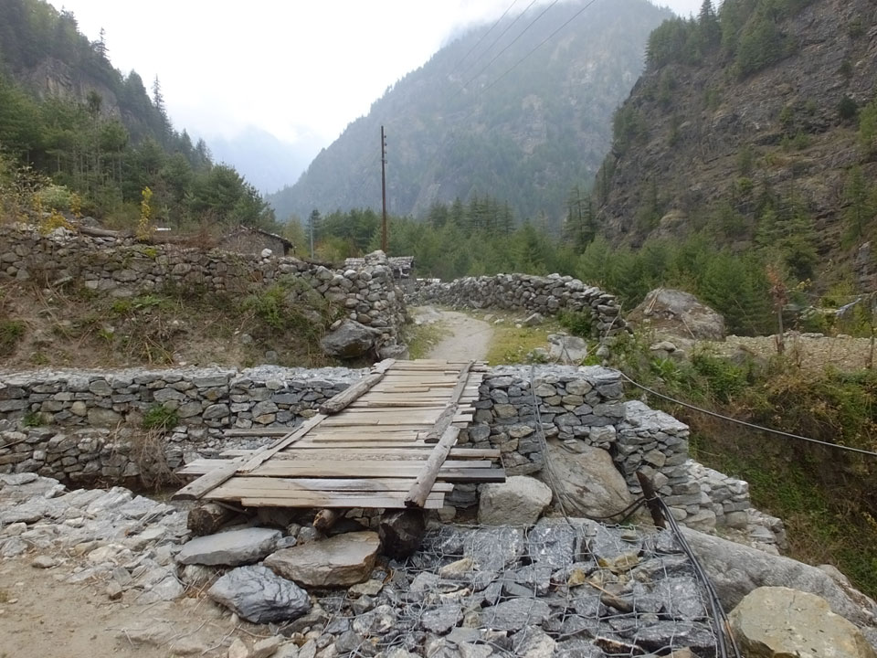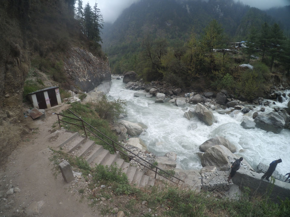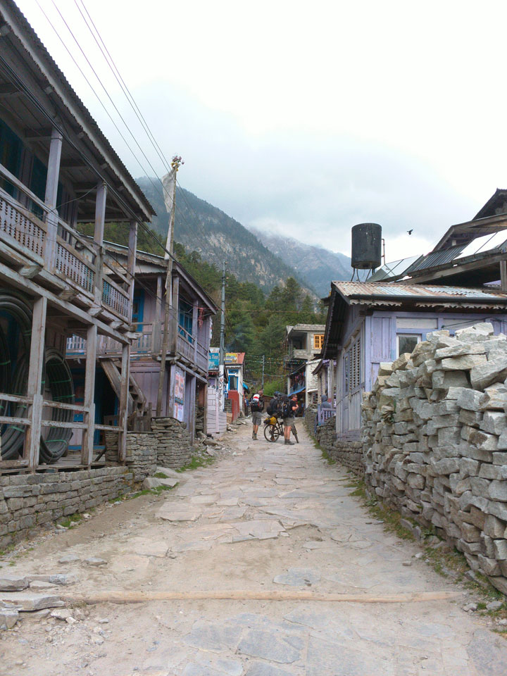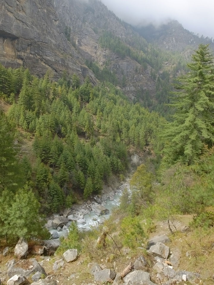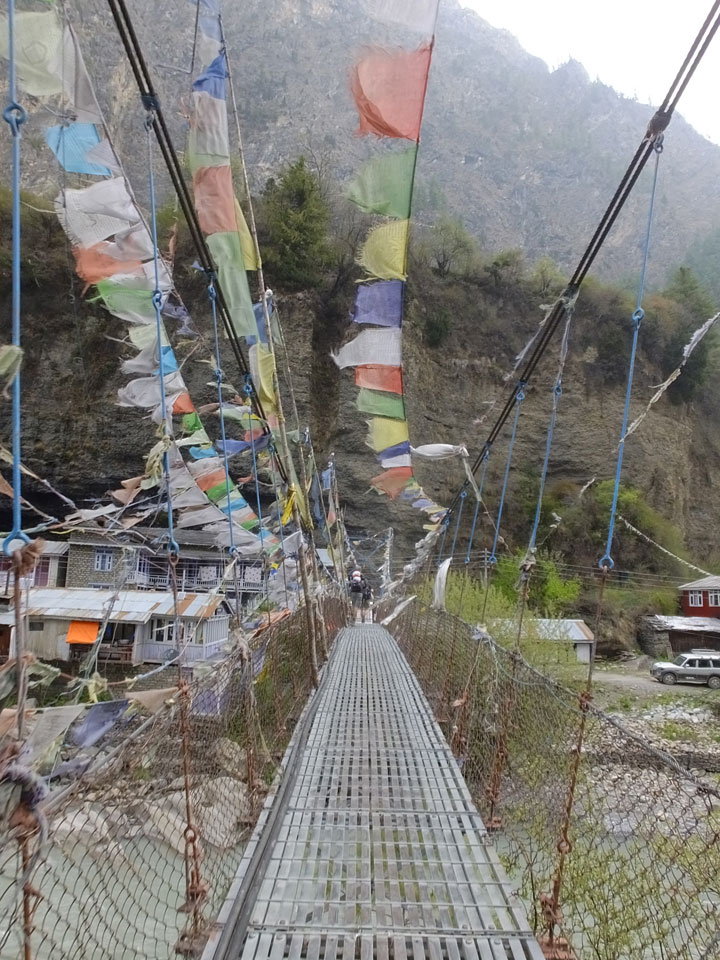 In Chame dann rief die Französin von der gegenüberliegenden Seite aus einem Hotel. Sie war doch schneller unterwegs als wir, was eigentlich unglaublich war. Wir checkten in dem Hotel ein. Ich hatte ein kleines Zimmer mitd em Deutschen. Das Wetter hatte sich heute den ganzen Tag schon zu gezogen, doch hier gab es heiße Quellen, gleich in der Nähe. Ich schnappte also meine Badehose und ging in das heiße Bad – ein kleiner Betonpool. Aber wie fantastisch das war! Das Wasser war so gut und heiß. Genau richtig für meinen Rücken und die Schultern. Ganz so lange konnte man da nicht drin bleiben. Ein paar Nepali saßen da auch da, rauchten einen Joint.