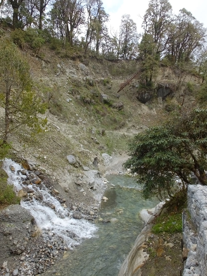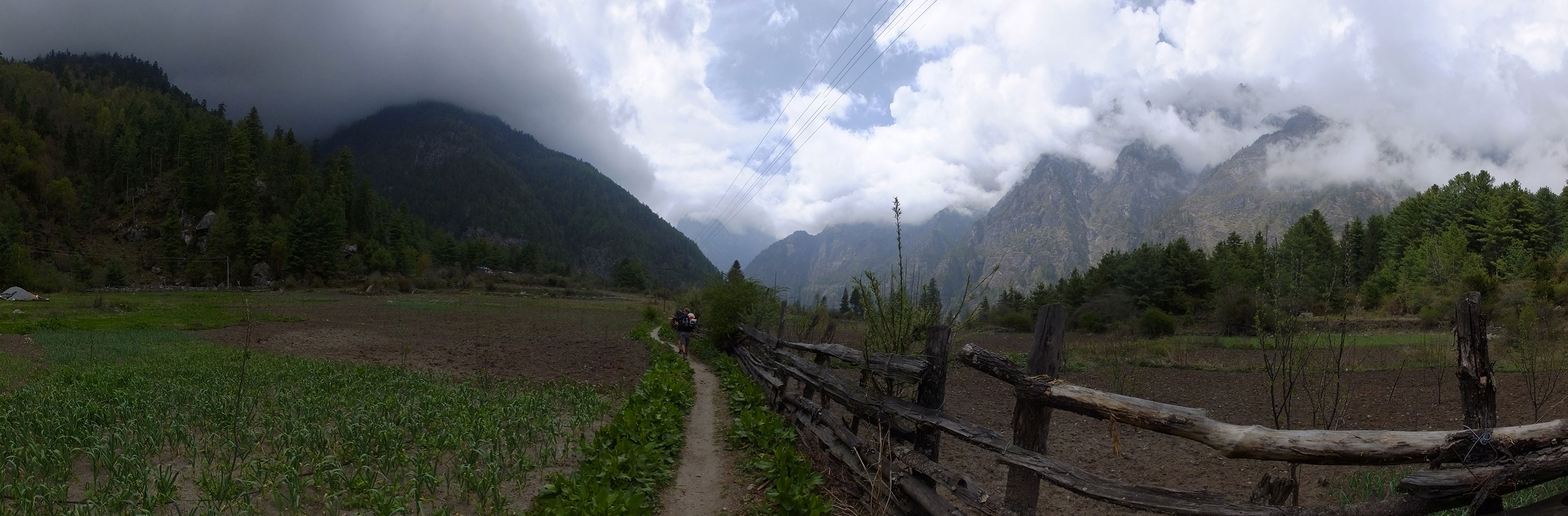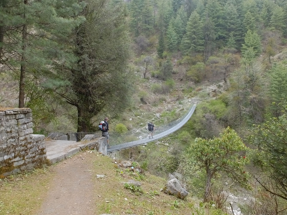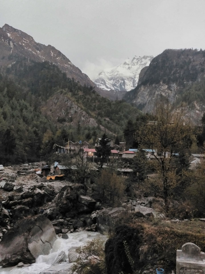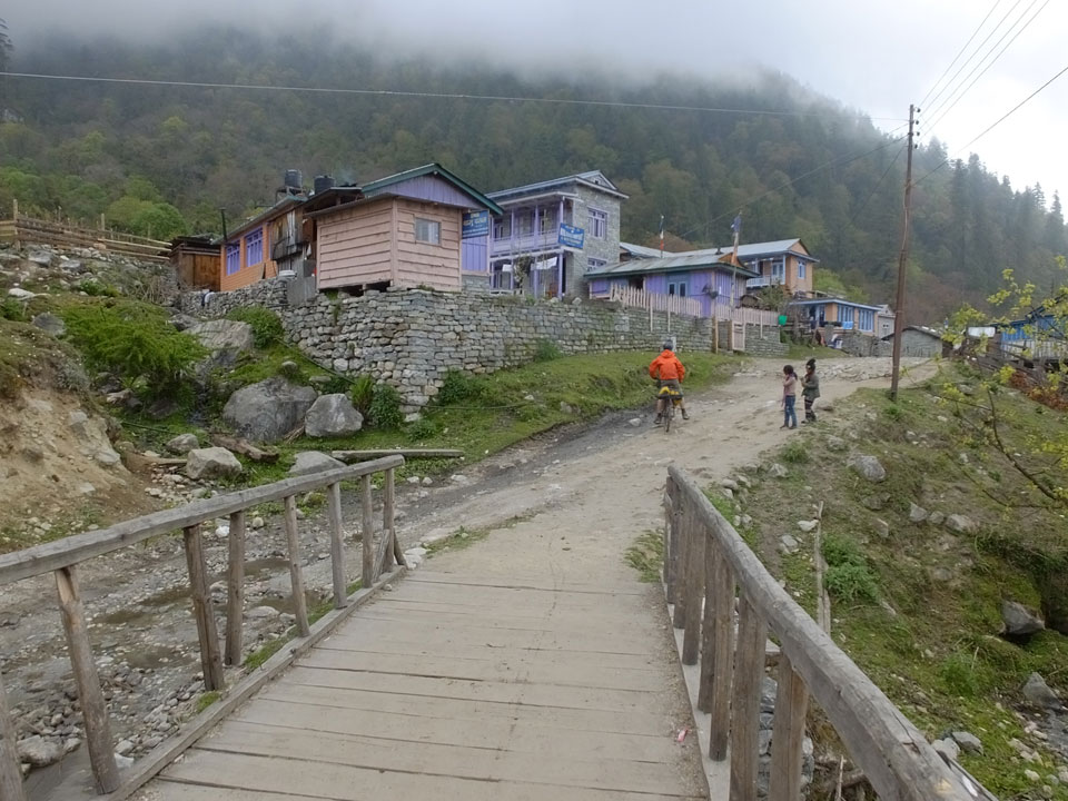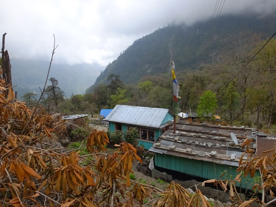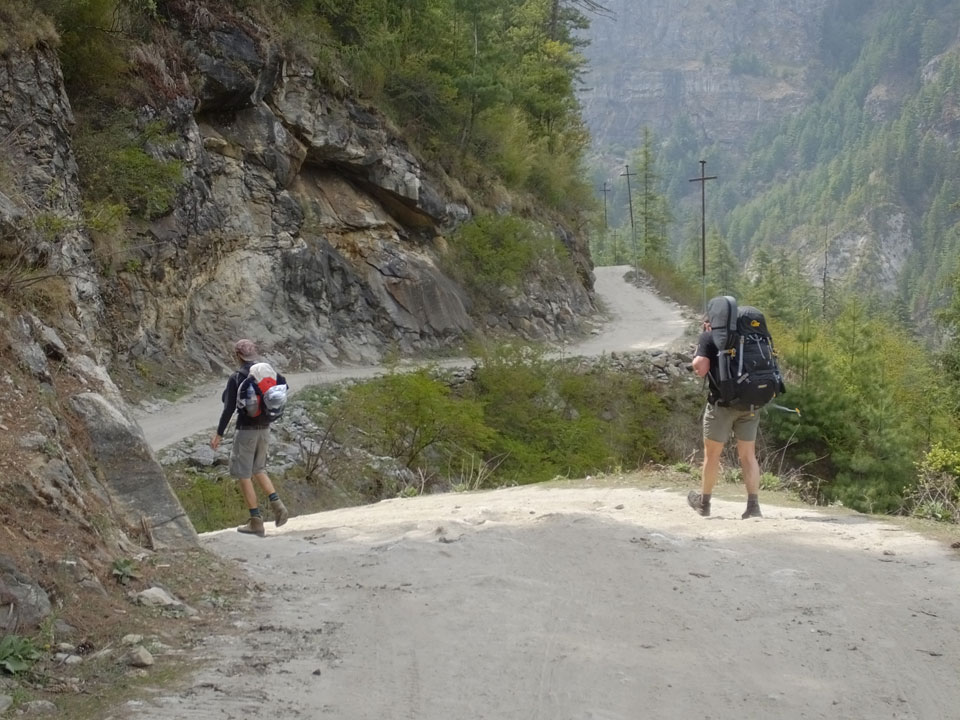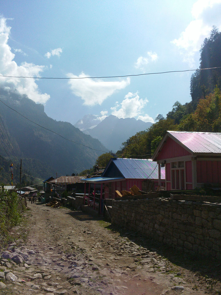 In Chame dann rief die Französin von der gegenüberliegenden Seite aus einem Hotel. Sie war doch schneller unterwegs als wir, was eigentlich unglaublich war. Wir checkten in dem Hotel ein. Ich hatte ein kleines Zimmer mitd em Deutschen. Das Wetter hatte sich heute den ganzen Tag schon zu gezogen, doch hier gab es heiße Quellen, gleich in der Nähe. Ich schnappte also meine Badehose und ging in das heiße Bad – ein kleiner Betonpool. Aber wie fantastisch das war! Das Wasser war so gut und heiß. Genau richtig für meinen Rücken und die Schultern. Ganz so lange konnte man da nicht drin bleiben. Ein paar Nepali saßen da auch da, rauchten einen Joint.
