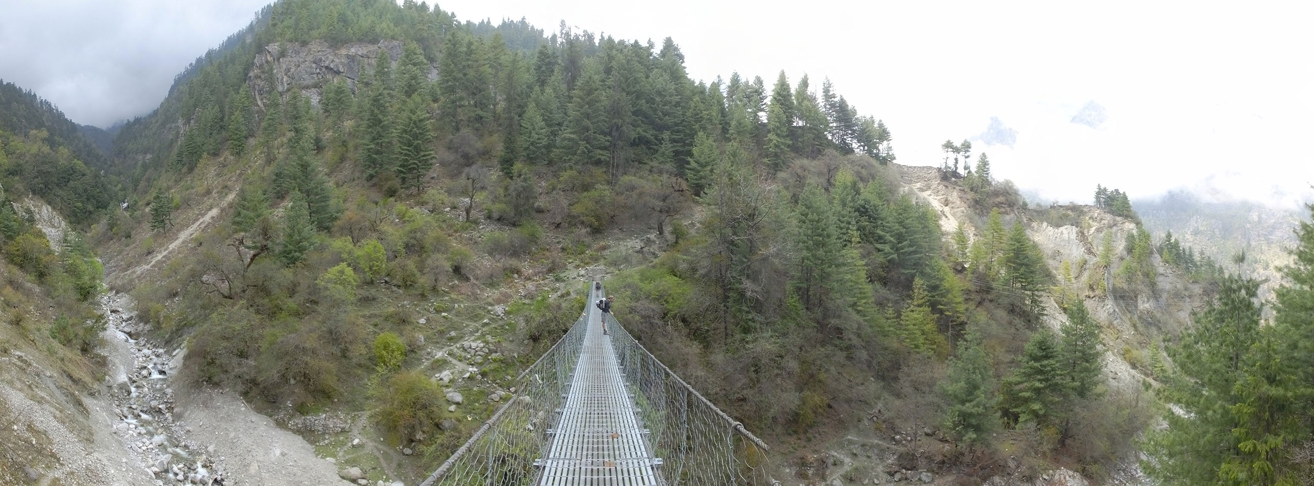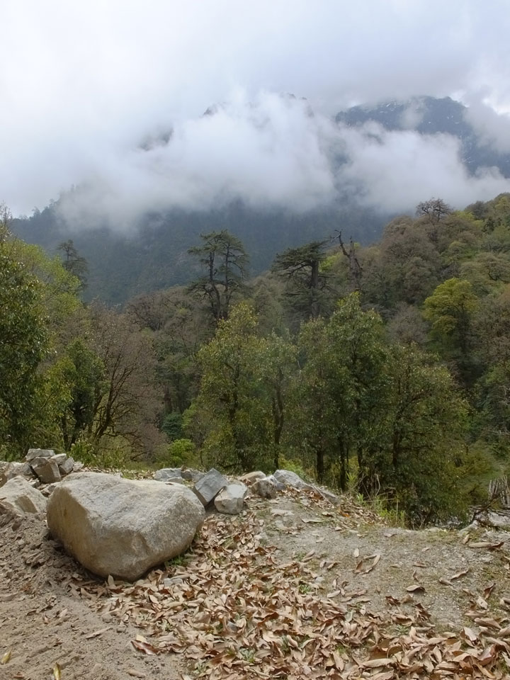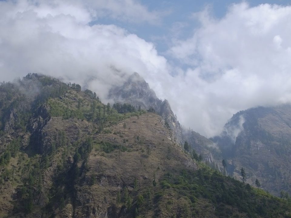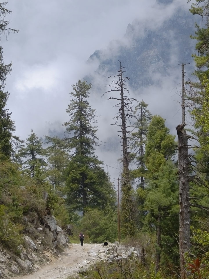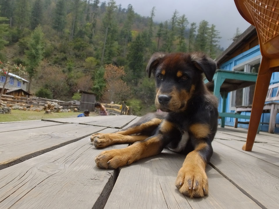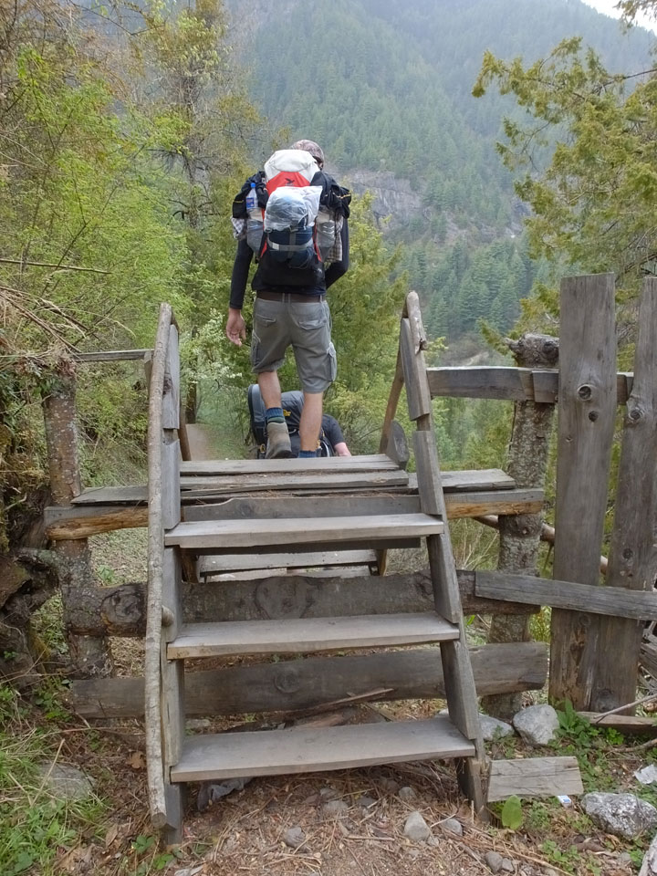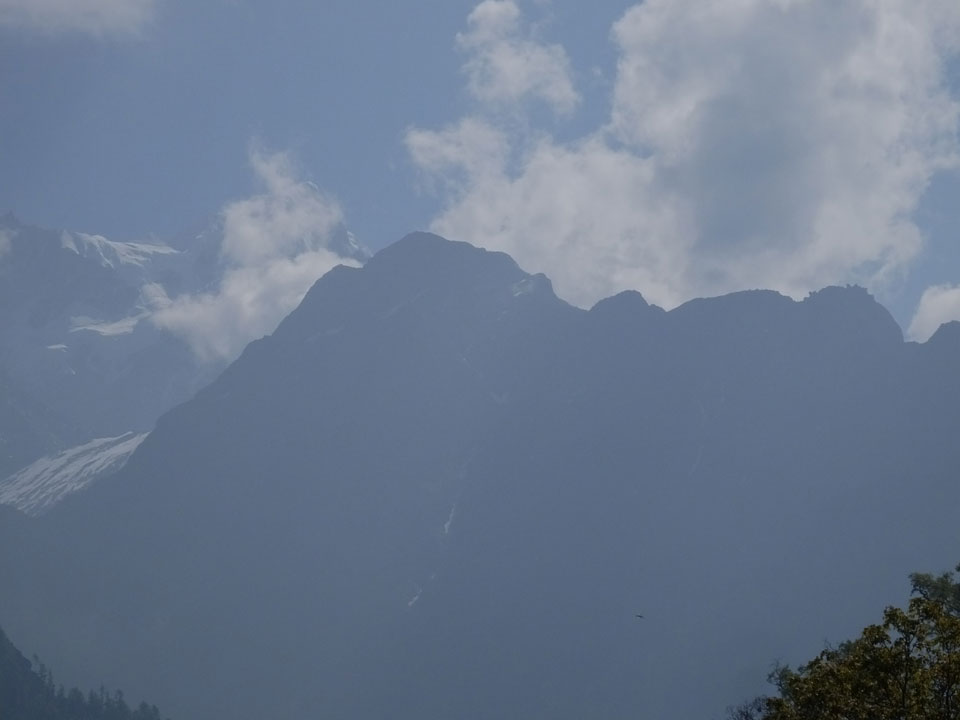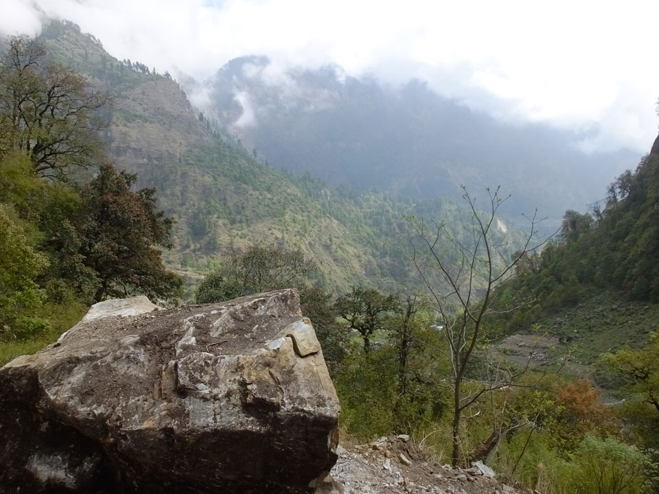 In Chame dann rief die Französin von der gegenüberliegenden Seite aus einem Hotel. Sie war doch schneller unterwegs als wir, was eigentlich unglaublich war. Wir checkten in dem Hotel ein. Ich hatte ein kleines Zimmer mitd em Deutschen. Das Wetter hatte sich heute den ganzen Tag schon zu gezogen, doch hier gab es heiße Quellen, gleich in der Nähe. Ich schnappte also meine Badehose und ging in das heiße Bad – ein kleiner Betonpool. Aber wie fantastisch das war! Das Wasser war so gut und heiß. Genau richtig für meinen Rücken und die Schultern. Ganz so lange konnte man da nicht drin bleiben. Ein paar Nepali saßen da auch da, rauchten einen Joint.