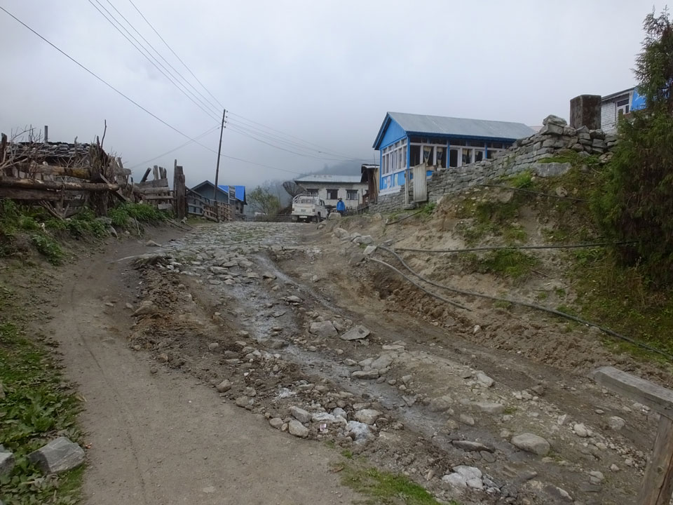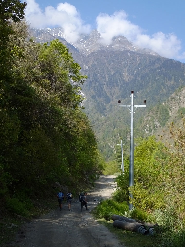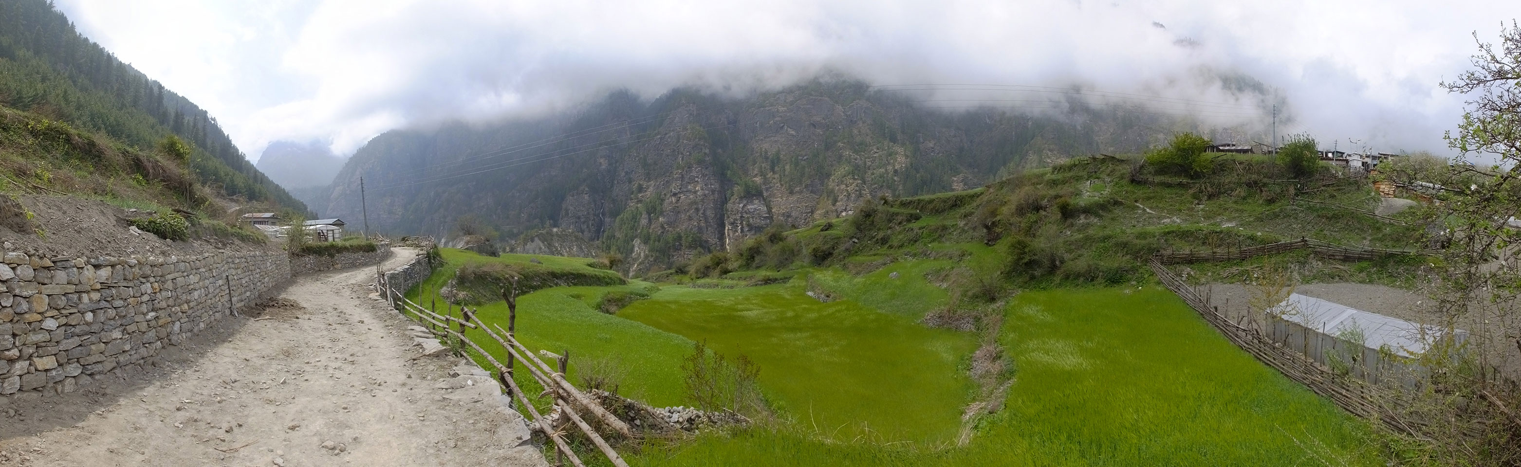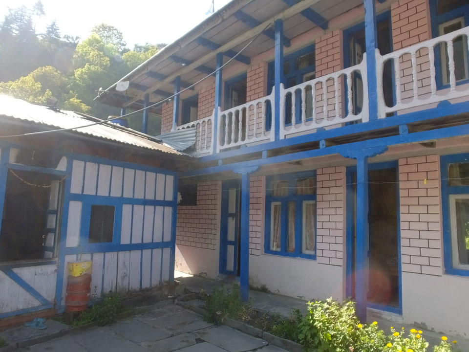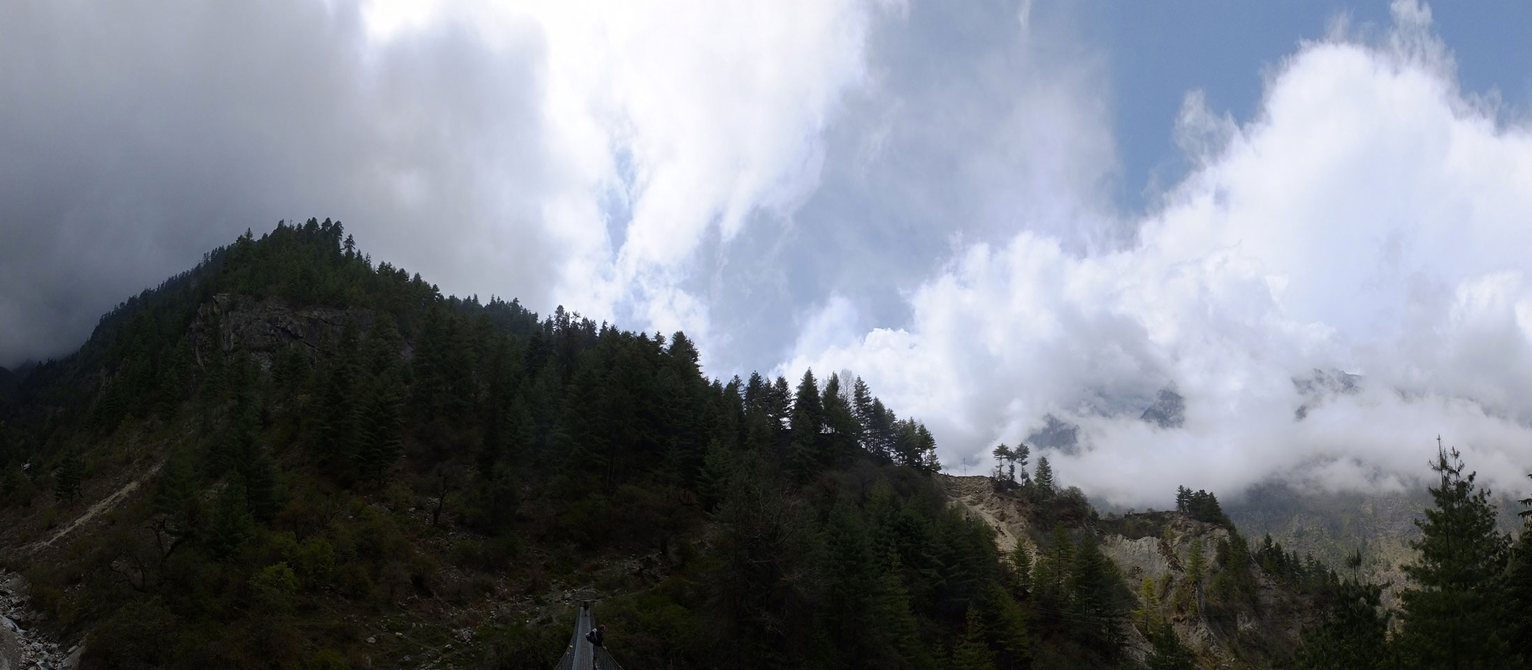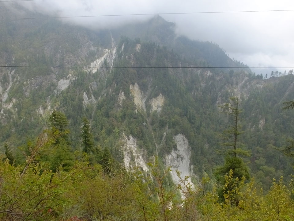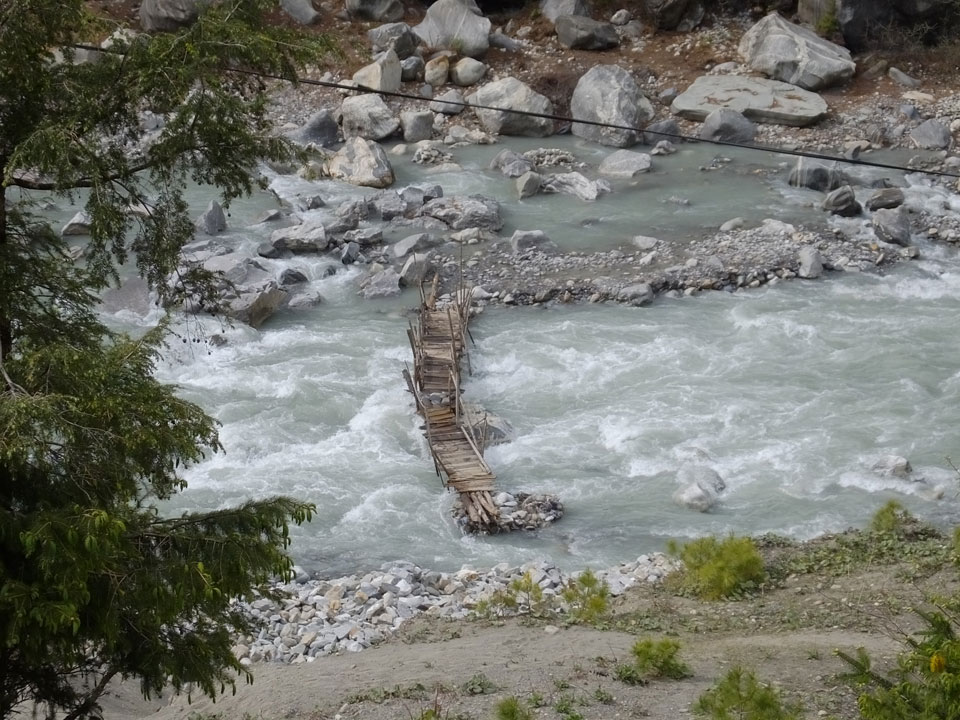 In Chame dann rief die Französin von der gegenüberliegenden Seite aus einem Hotel. Sie war doch schneller unterwegs als wir, was eigentlich unglaublich war. Wir checkten in dem Hotel ein. Ich hatte ein kleines Zimmer mitd em Deutschen. Das Wetter hatte sich heute den ganzen Tag schon zu gezogen, doch hier gab es heiße Quellen, gleich in der Nähe. Ich schnappte also meine Badehose und ging in das heiße Bad – ein kleiner Betonpool. Aber wie fantastisch das war! Das Wasser war so gut und heiß. Genau richtig für meinen Rücken und die Schultern. Ganz so lange konnte man da nicht drin bleiben. Ein paar Nepali saßen da auch da, rauchten einen Joint.