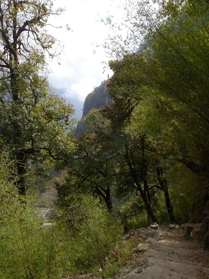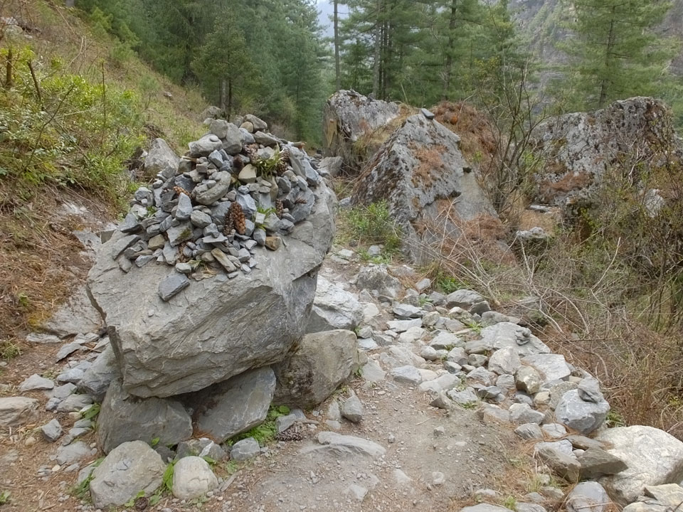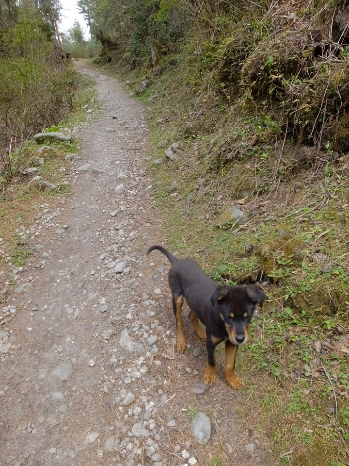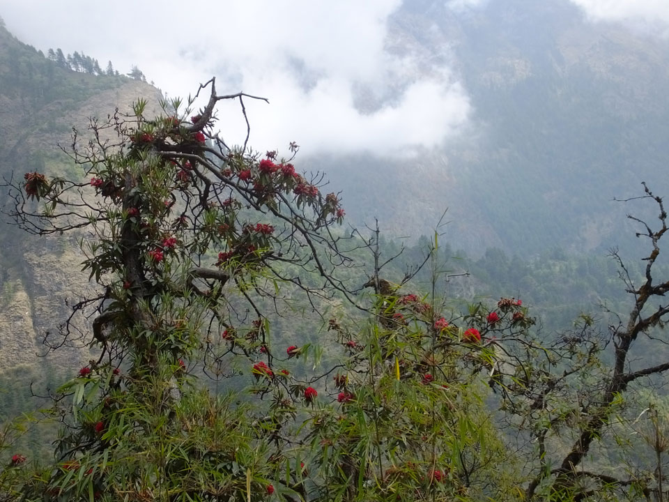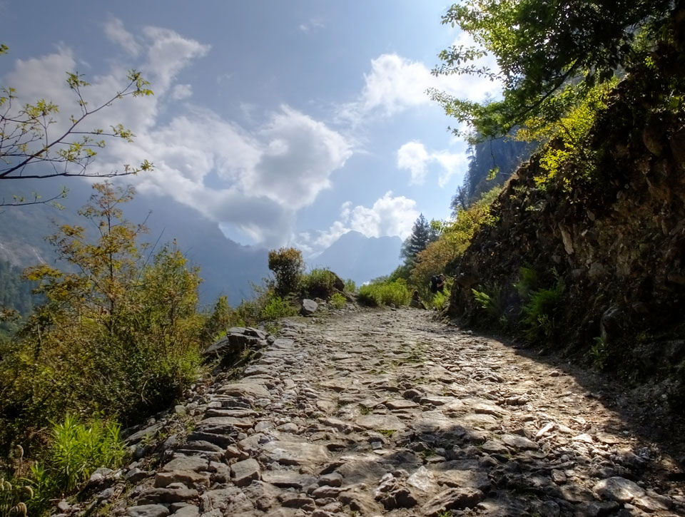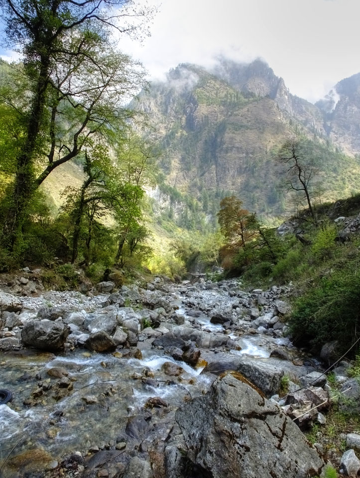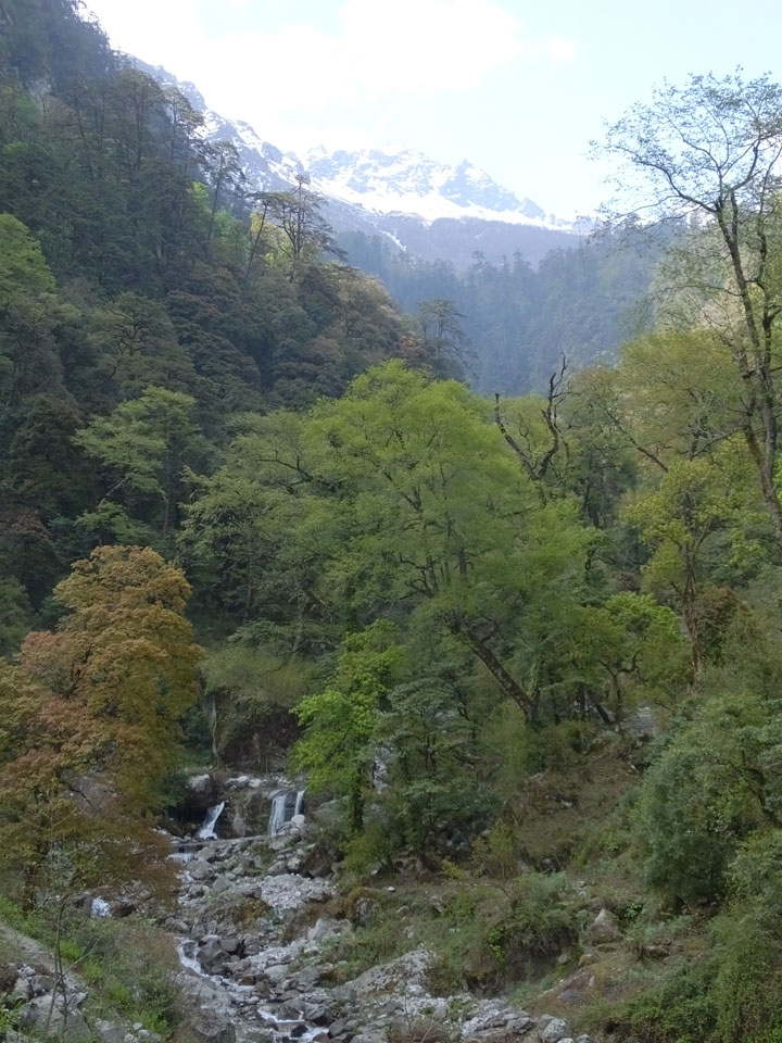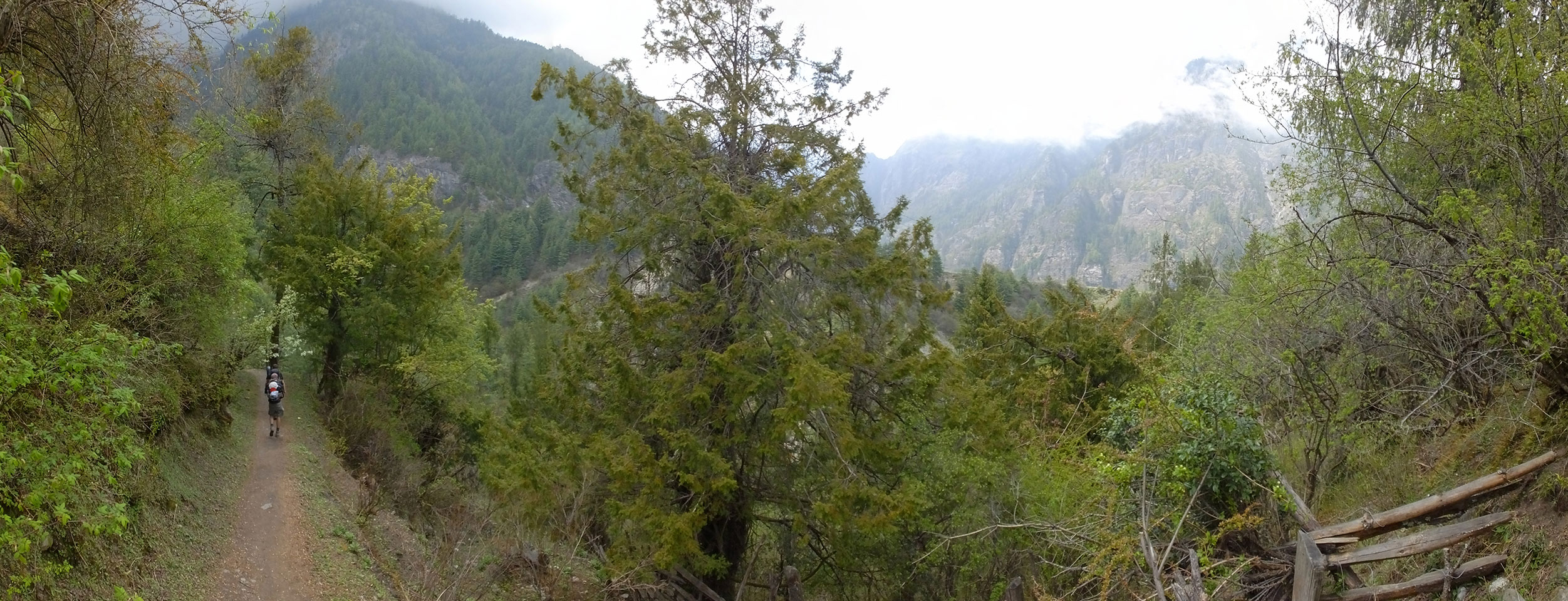 In Chame dann rief die Französin von der gegenüberliegenden Seite aus einem Hotel. Sie war doch schneller unterwegs als wir, was eigentlich unglaublich war. Wir checkten in dem Hotel ein. Ich hatte ein kleines Zimmer mitd em Deutschen. Das Wetter hatte sich heute den ganzen Tag schon zu gezogen, doch hier gab es heiße Quellen, gleich in der Nähe. Ich schnappte also meine Badehose und ging in das heiße Bad – ein kleiner Betonpool. Aber wie fantastisch das war! Das Wasser war so gut und heiß. Genau richtig für meinen Rücken und die Schultern. Ganz so lange konnte man da nicht drin bleiben. Ein paar Nepali saßen da auch da, rauchten einen Joint.
