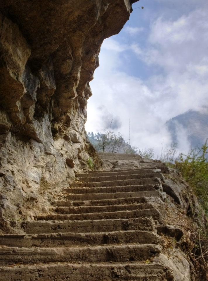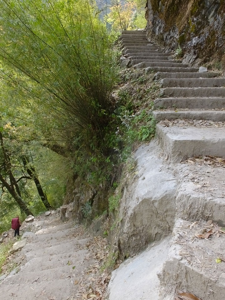 Über Stufen ging es immer weiter bergauf, überquerten den Fluss auch wieder über Hängebrücken – immer weiter nach oben, wo es dann auch schon ganz schön frisch wurde. Wir verloren die Französin, der Deutsche ging voraus.