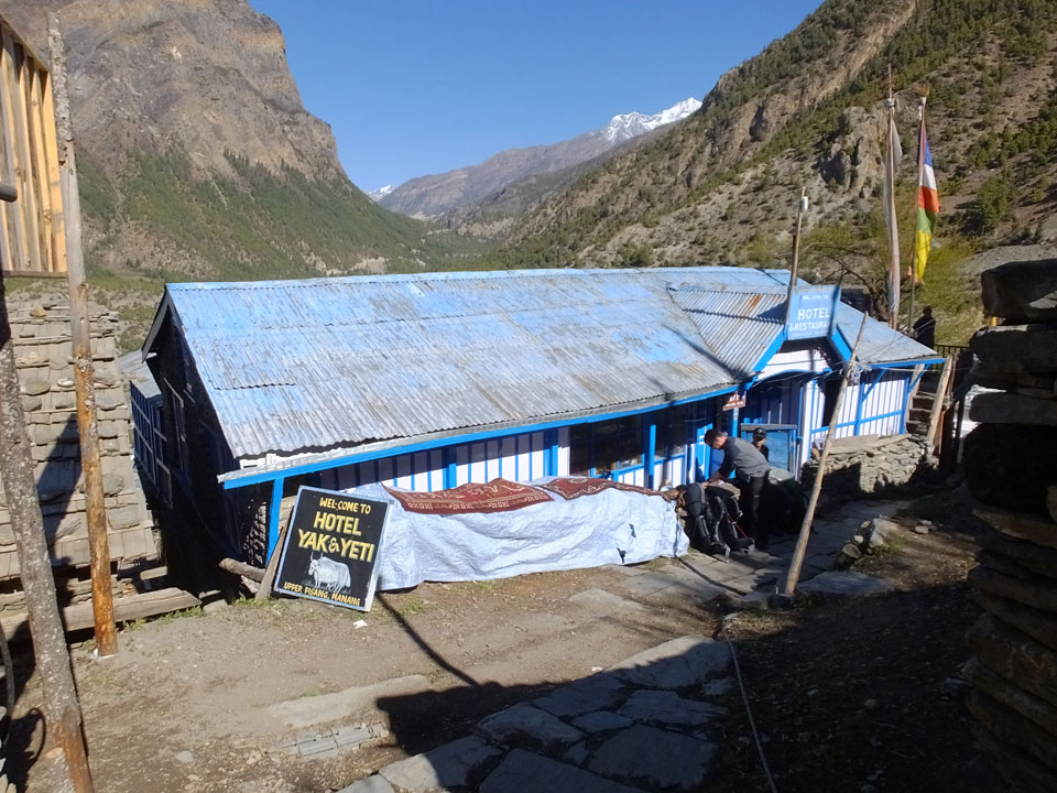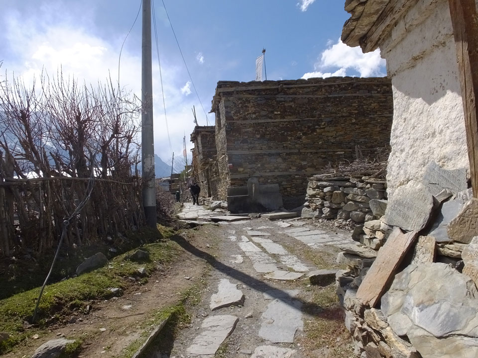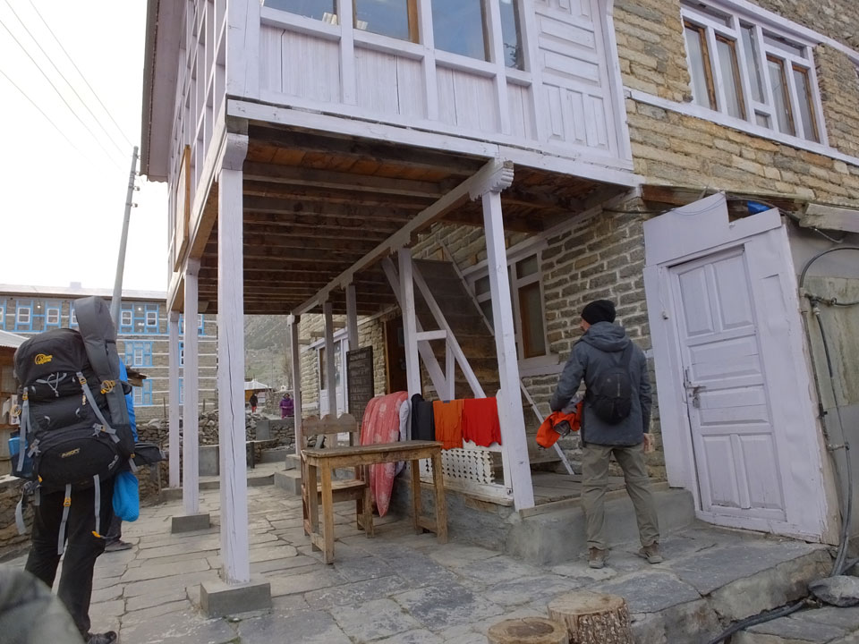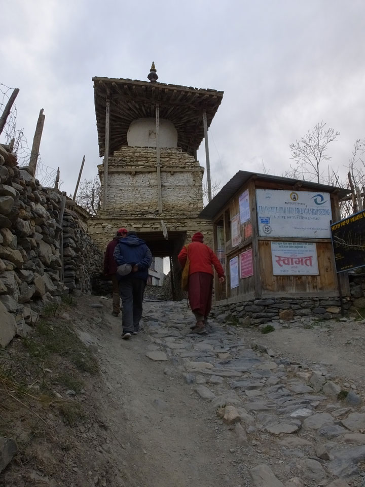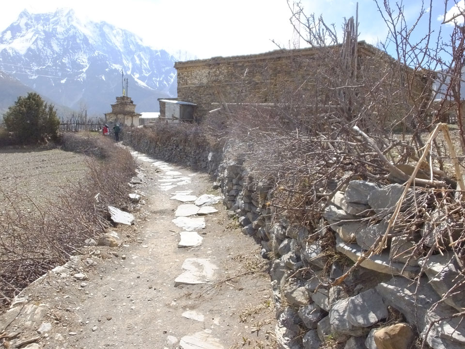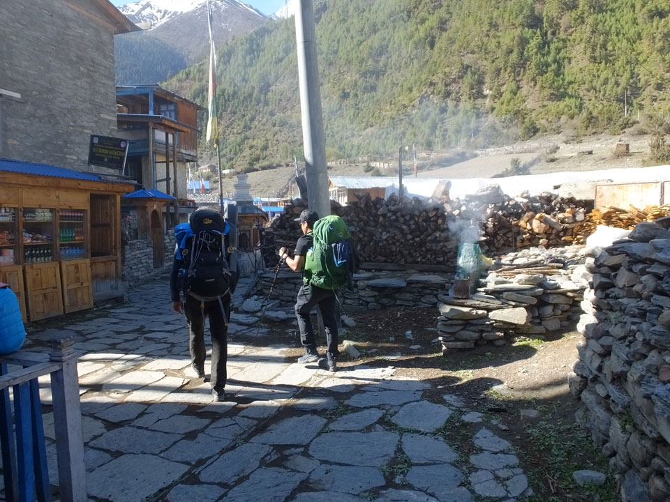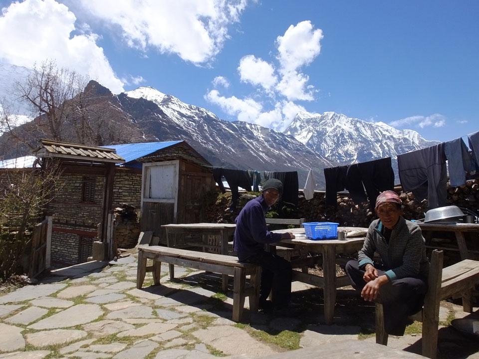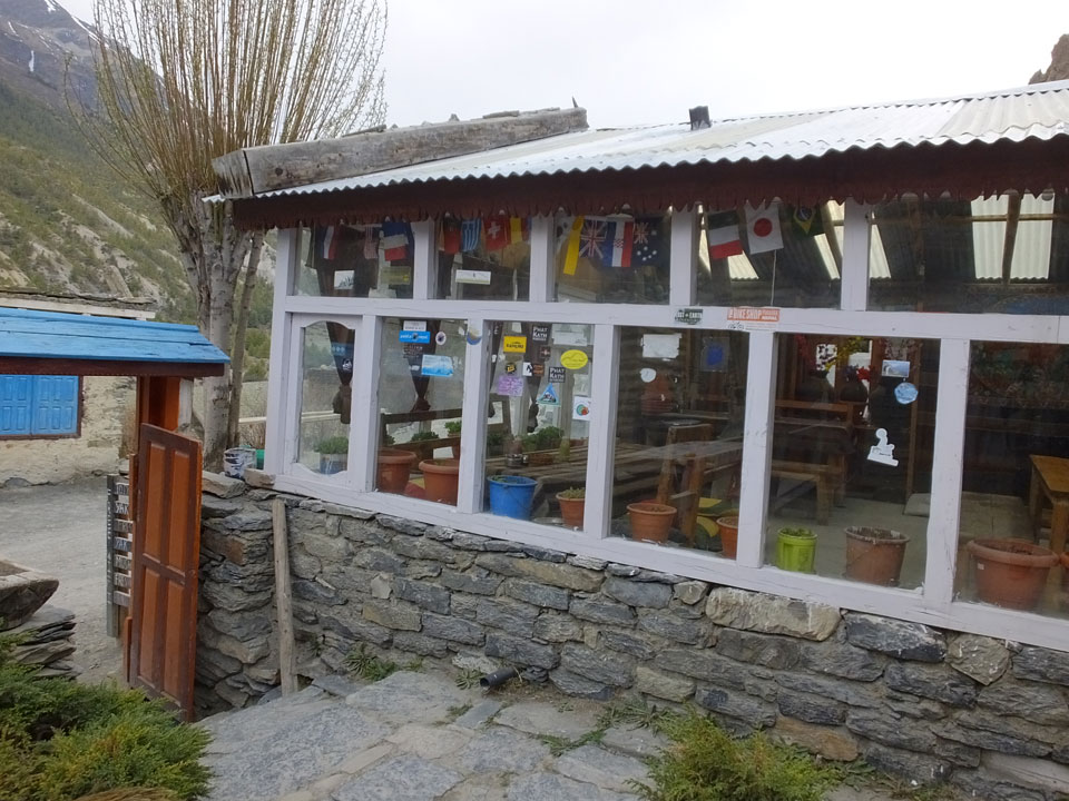 Es kamen noch weitere kleine Dörfer auf dem Weg nach Manang. Eine Pause in Ngang(?) brachte einen Milchkaffee und ich wurde mal ein paar Müsliriegel los. Das Verfallsdatum war 25.3., wobei ich mich da etwas unwohl fühlte, hatte ich die Sachen schon den Leuten angeboten. Ein Philippino und der Thai wollten woanders übernachten und nicht ganz bis nach Manang durchlaufen. Der Deutsche, der heute vor uns aufbracht kam zufällig auch vorbei. Hatten wir ihn doch nochmal wiedergesehen.