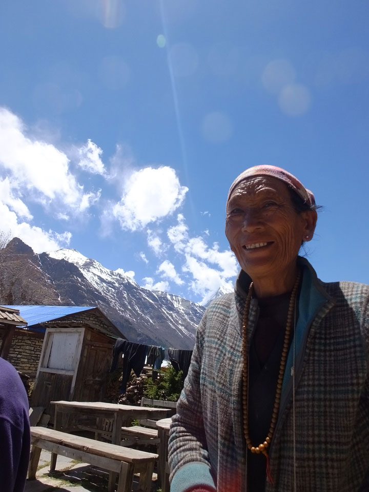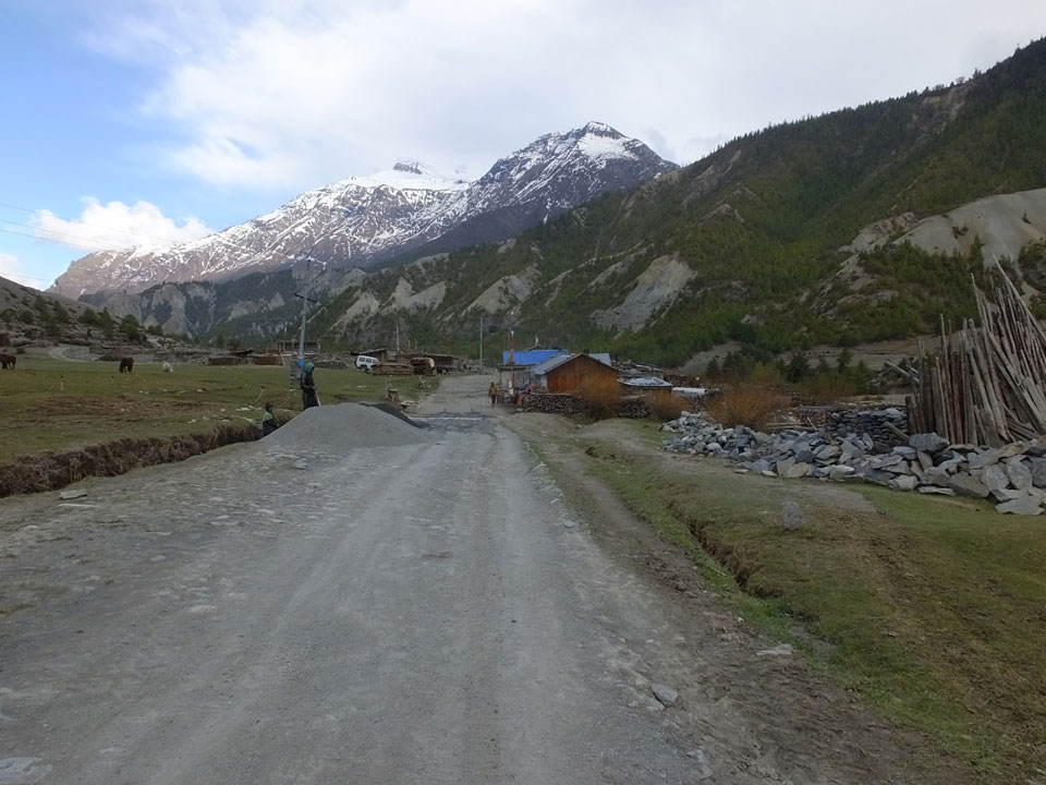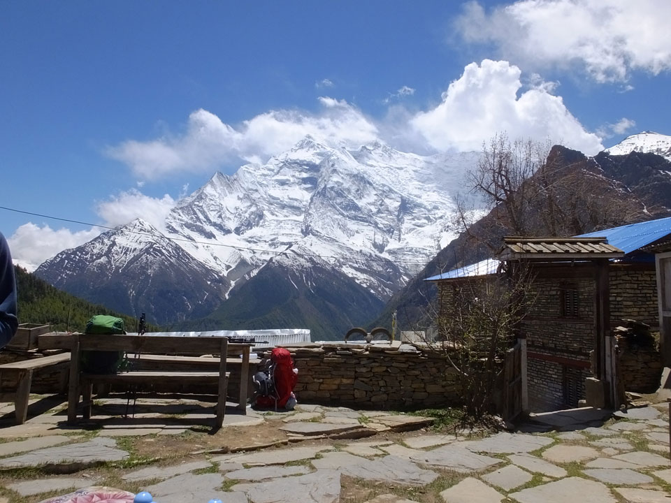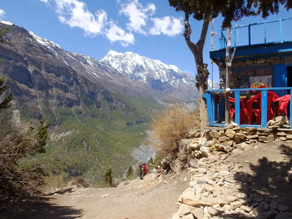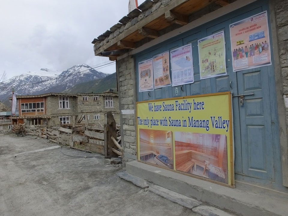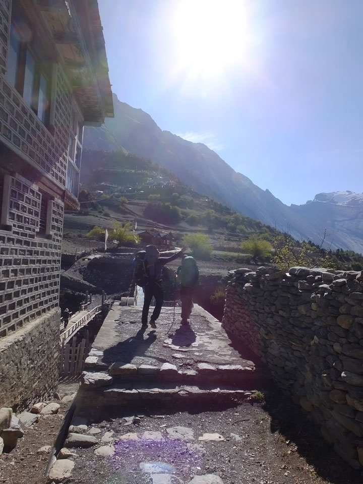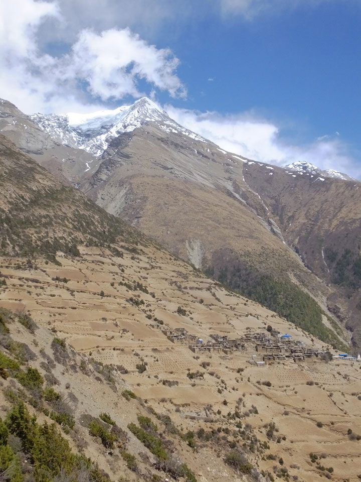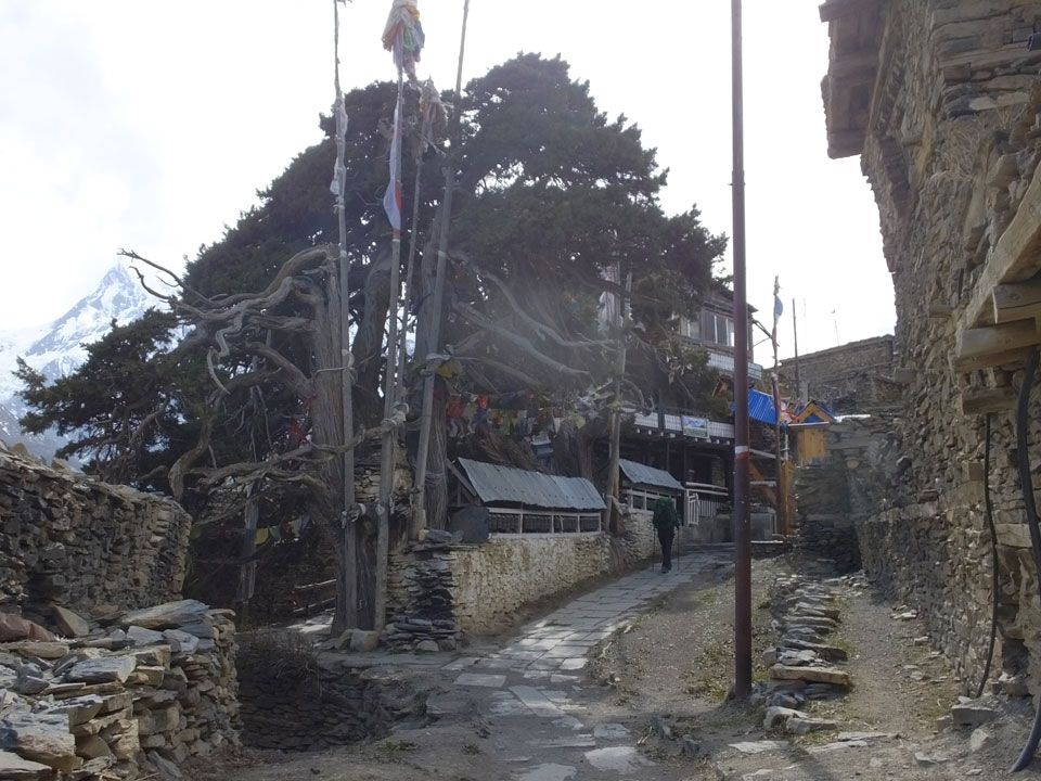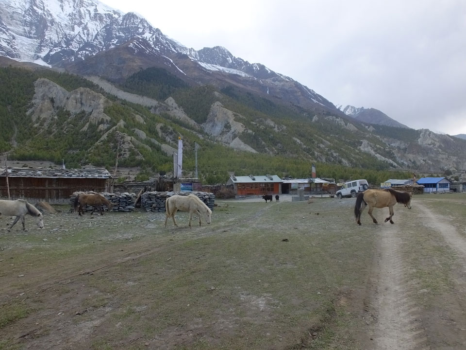 Es kamen noch weitere kleine Dörfer auf dem Weg nach Manang. Eine Pause in Ngang(?) brachte einen Milchkaffee und ich wurde mal ein paar Müsliriegel los. Das Verfallsdatum war 25.3., wobei ich mich da etwas unwohl fühlte, hatte ich die Sachen schon den Leuten angeboten. Ein Philippino und der Thai wollten woanders übernachten und nicht ganz bis nach Manang durchlaufen. Der Deutsche, der heute vor uns aufbracht kam zufällig auch vorbei. Hatten wir ihn doch nochmal wiedergesehen.