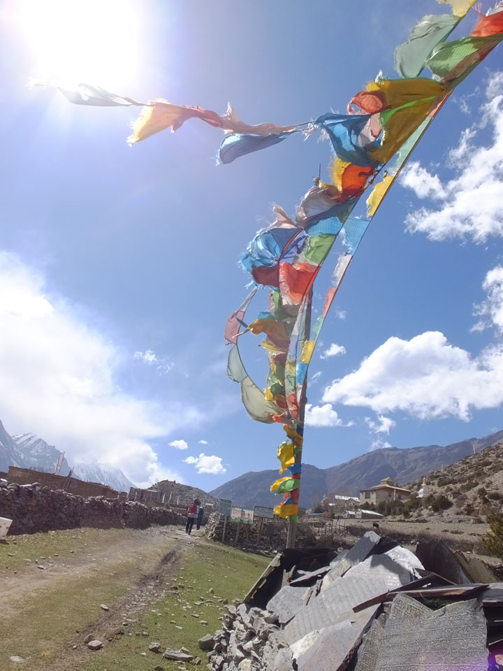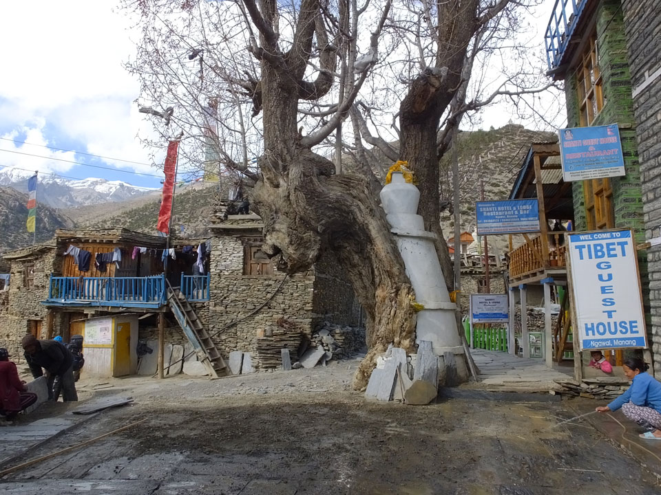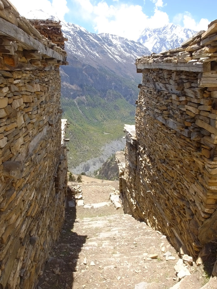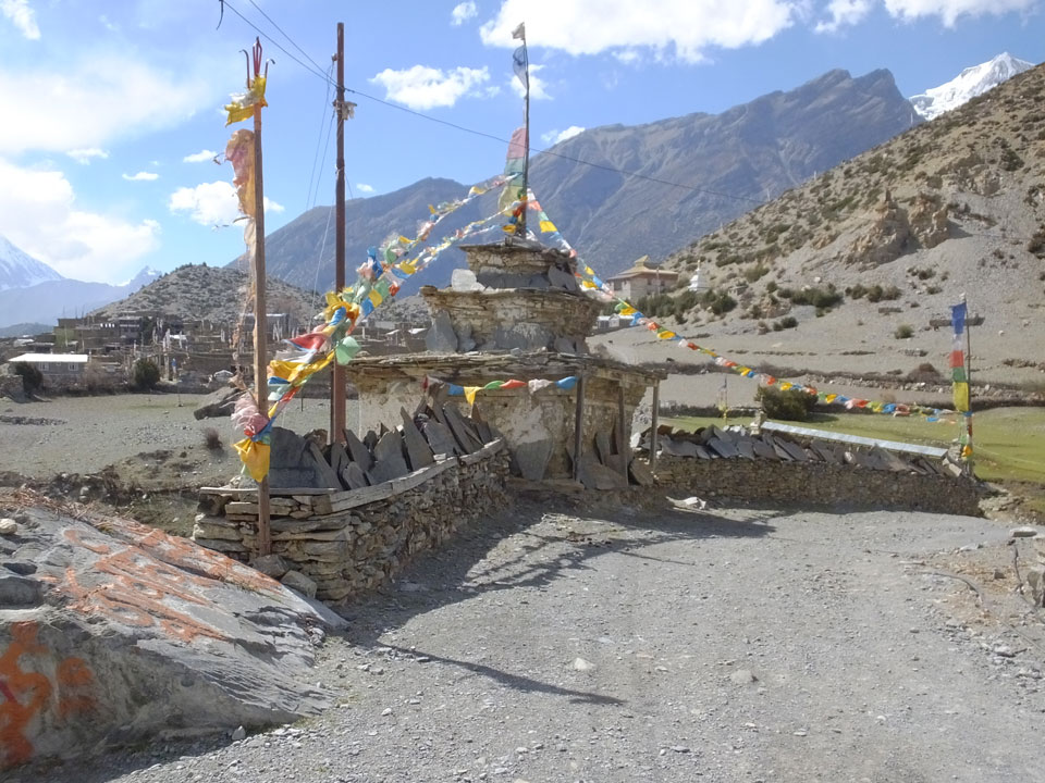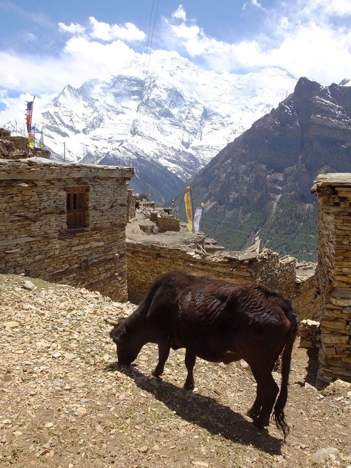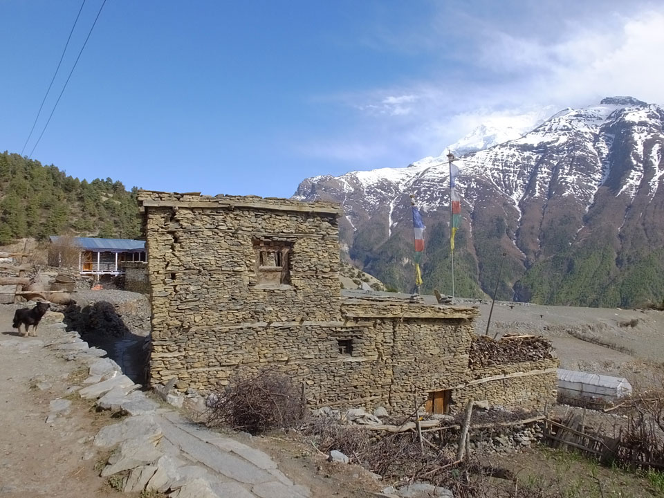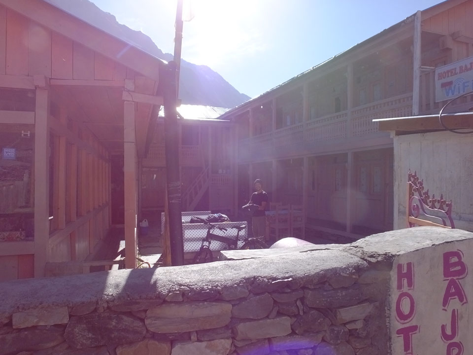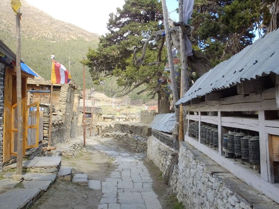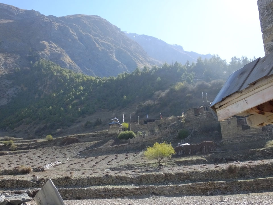 Es kamen noch weitere kleine Dörfer auf dem Weg nach Manang. Eine Pause in Ngang(?) brachte einen Milchkaffee und ich wurde mal ein paar Müsliriegel los. Das Verfallsdatum war 25.3., wobei ich mich da etwas unwohl fühlte, hatte ich die Sachen schon den Leuten angeboten. Ein Philippino und der Thai wollten woanders übernachten und nicht ganz bis nach Manang durchlaufen. Der Deutsche, der heute vor uns aufbracht kam zufällig auch vorbei. Hatten wir ihn doch nochmal wiedergesehen.
