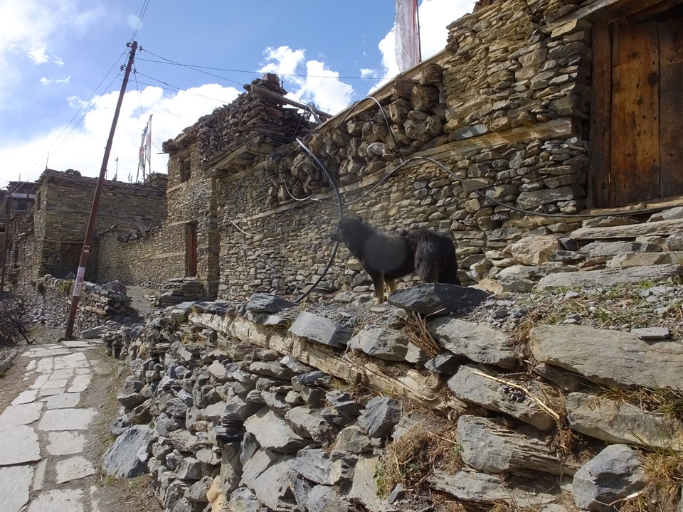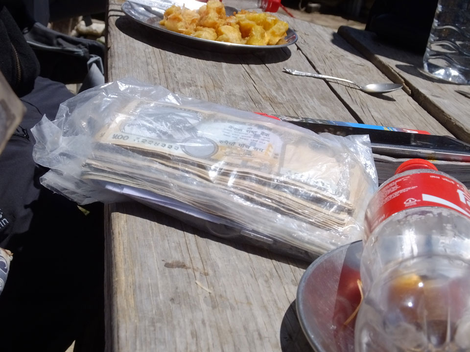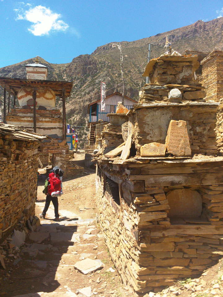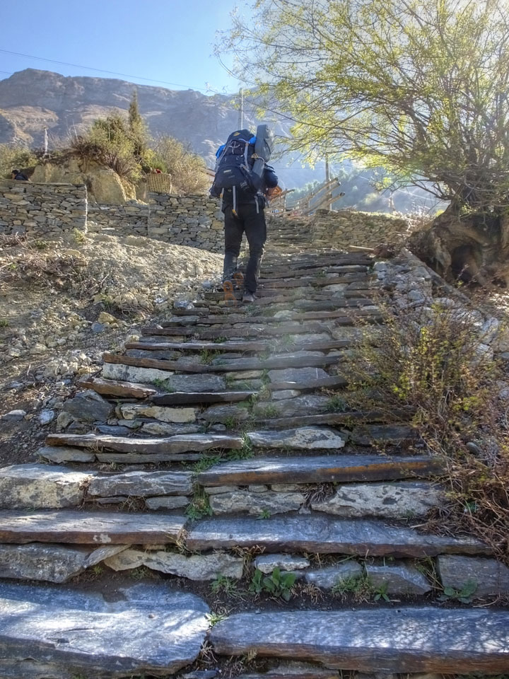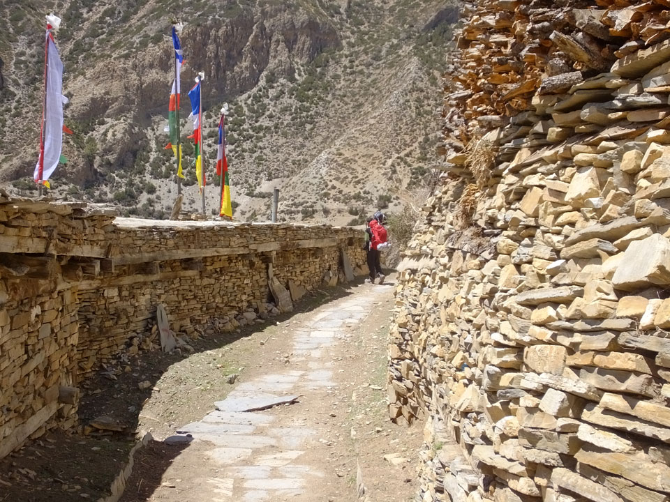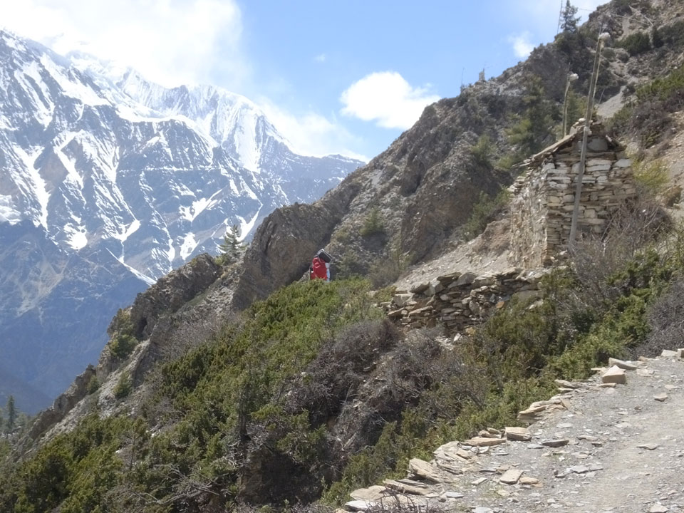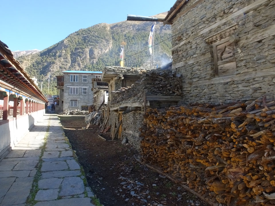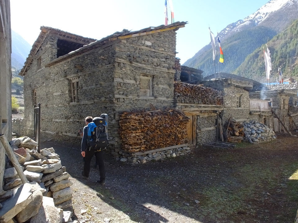 Die Rechnung für mein Essen belief sich auf 1300 NRP. Irgendwie war ich wieder ganz schon langsam, vergas fast meine nassen T-Shirts. Die feuchten Sachen trocknete ich am Rucksack. So ging es raus aus Lower Pisang und hoch in’s Higher Pisang, wo wir auf einen Thailänder stoßen sollte, dem der Guide abhanden gekommen war.
