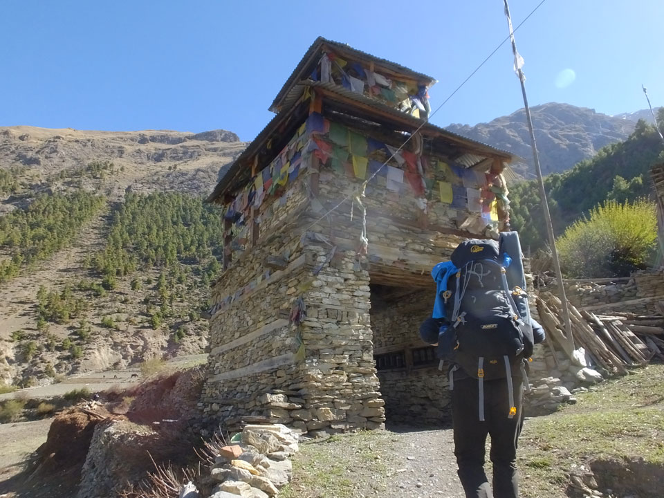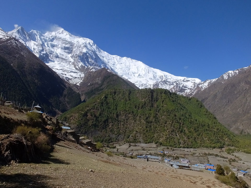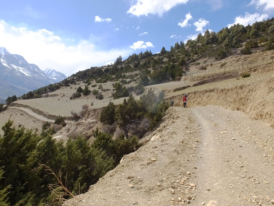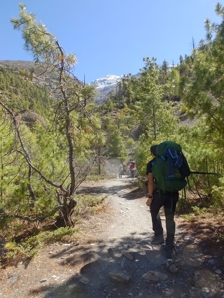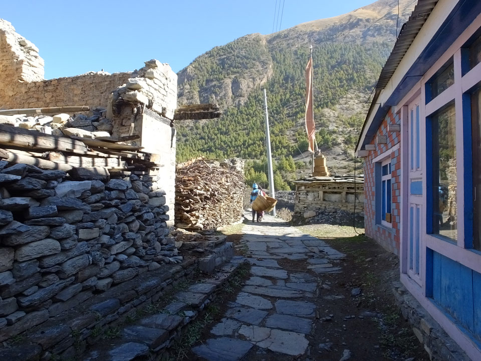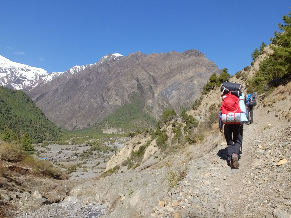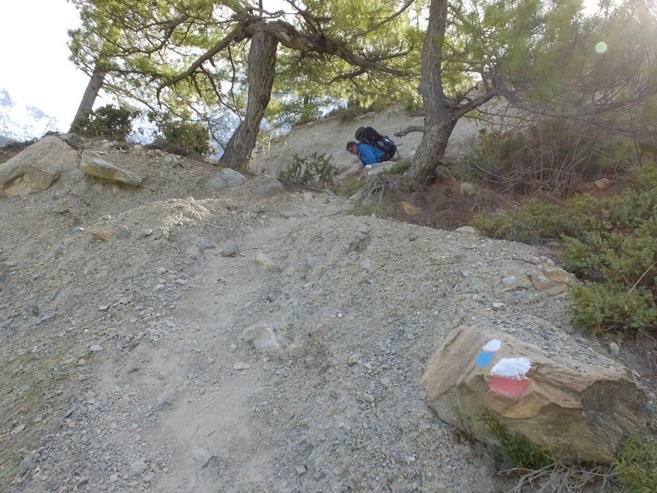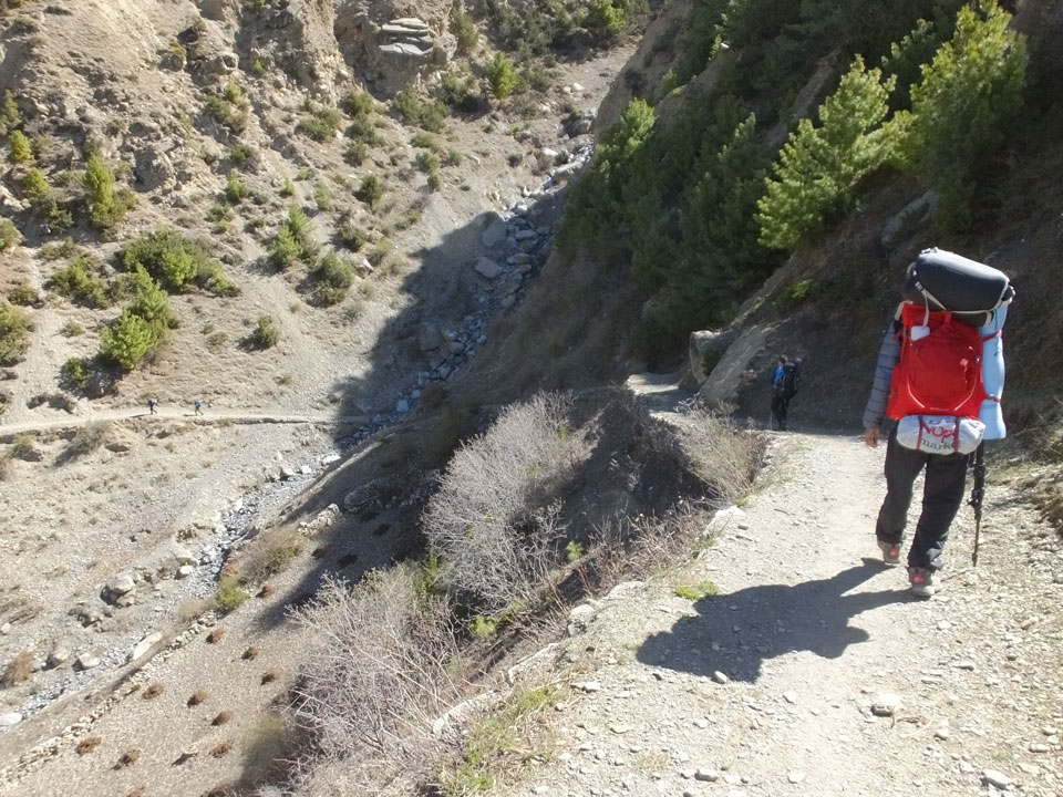 Die Rechnung für mein Essen belief sich auf 1300 NRP. Irgendwie war ich wieder ganz schon langsam, vergas fast meine nassen T-Shirts. Die feuchten Sachen trocknete ich am Rucksack. So ging es raus aus Lower Pisang und hoch in’s Higher Pisang, wo wir auf einen Thailänder stoßen sollte, dem der Guide abhanden gekommen war.