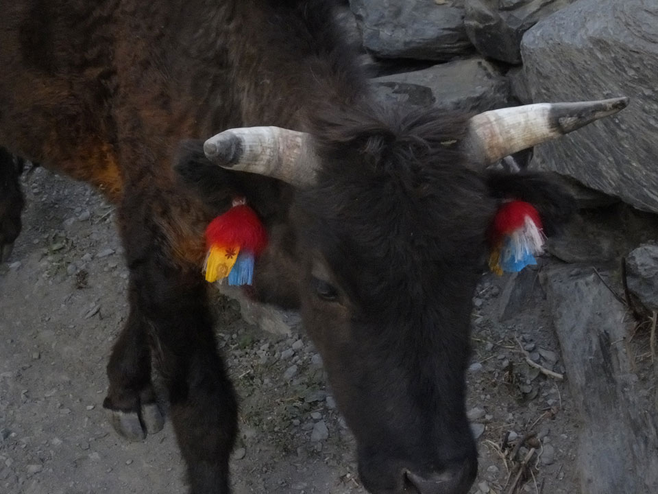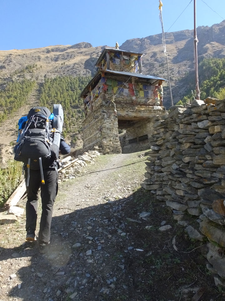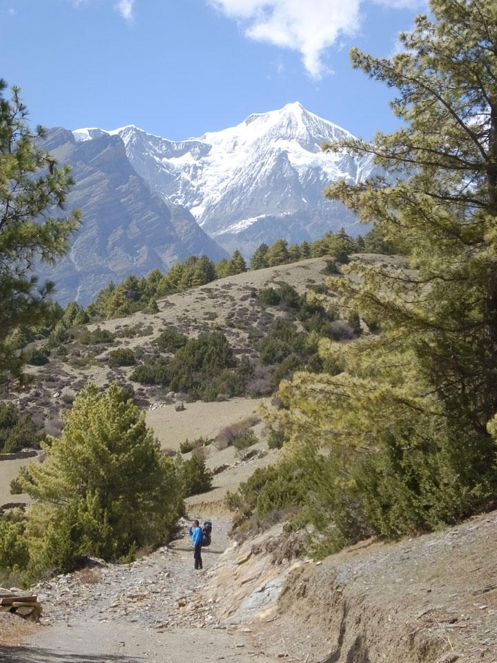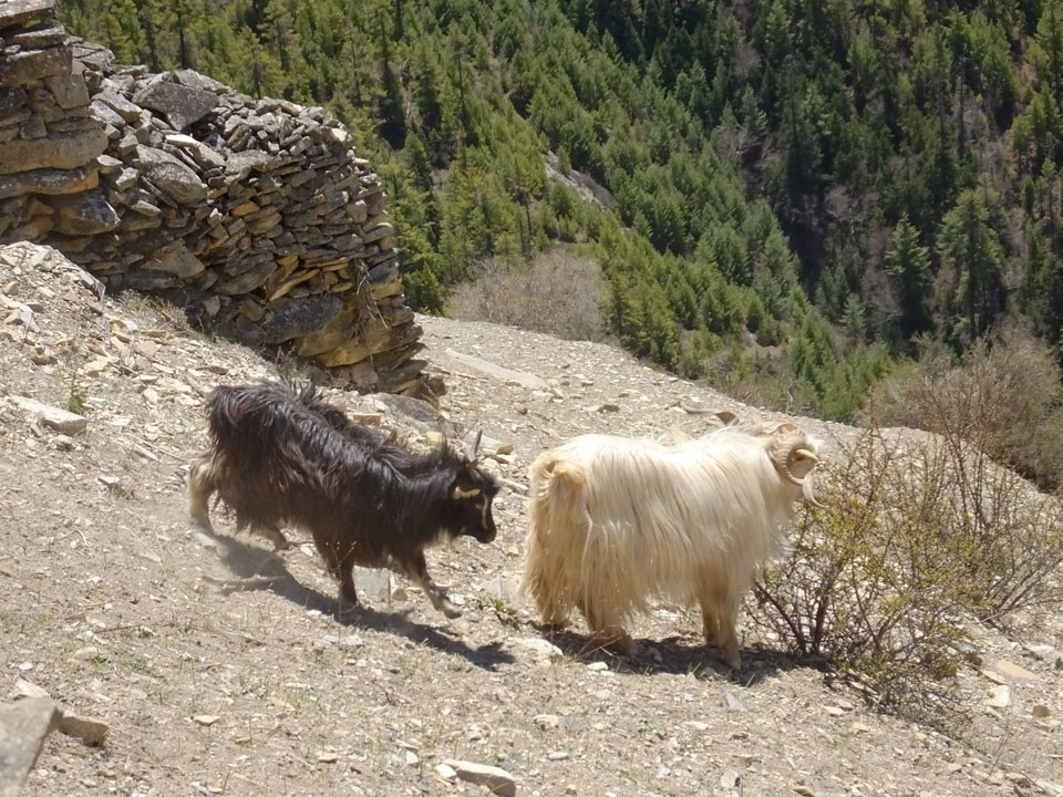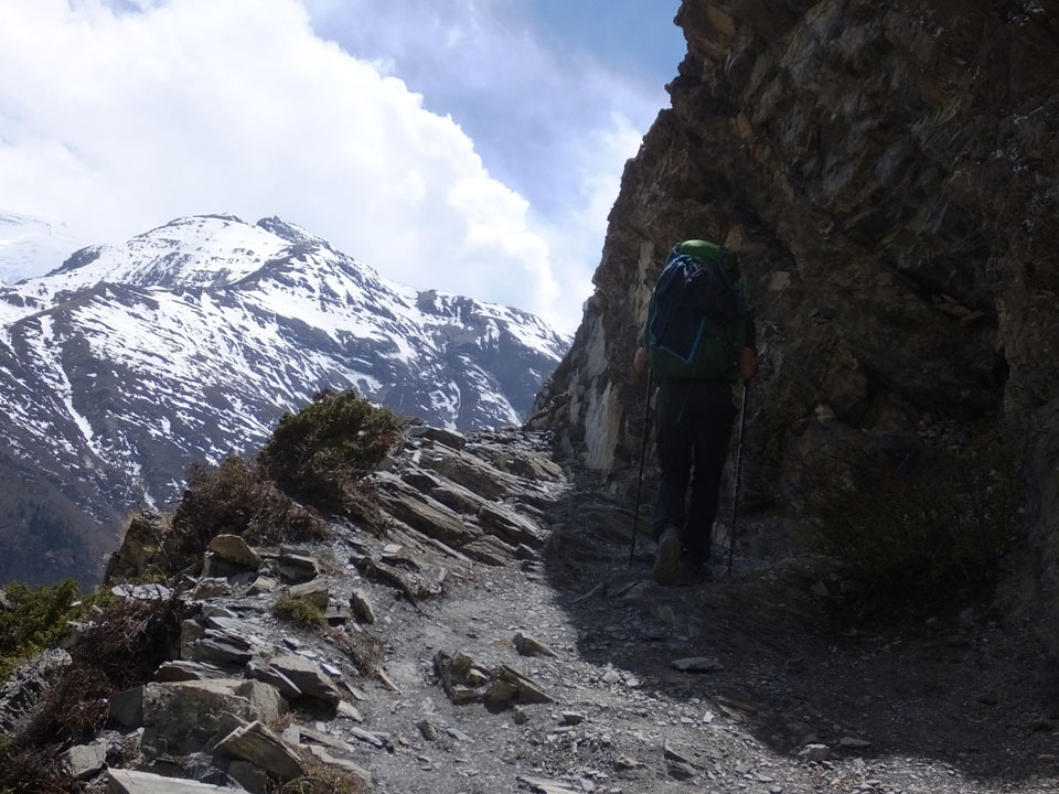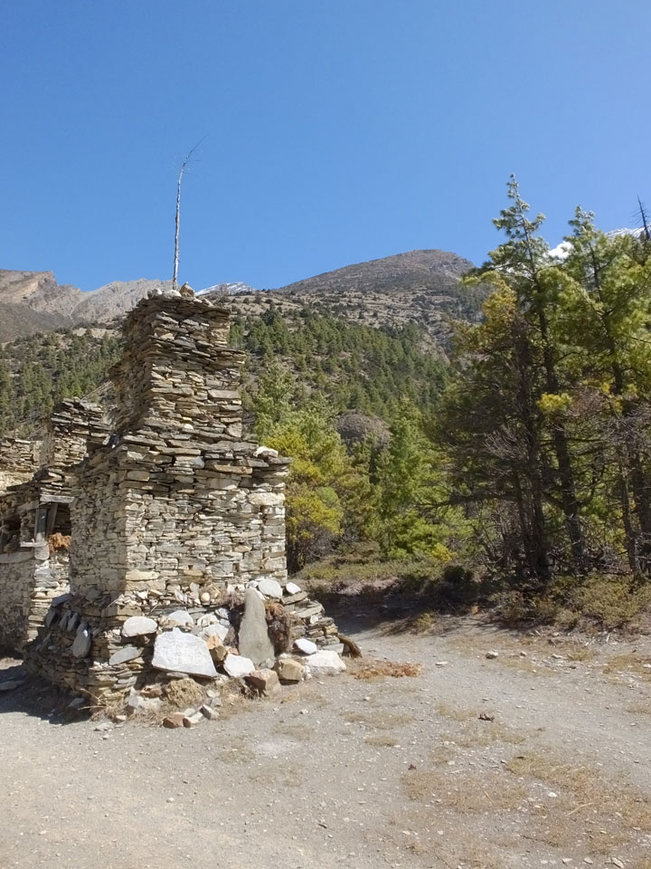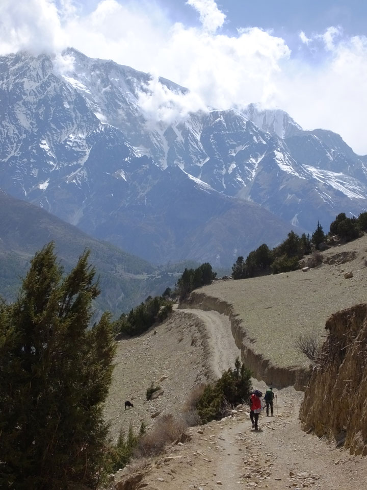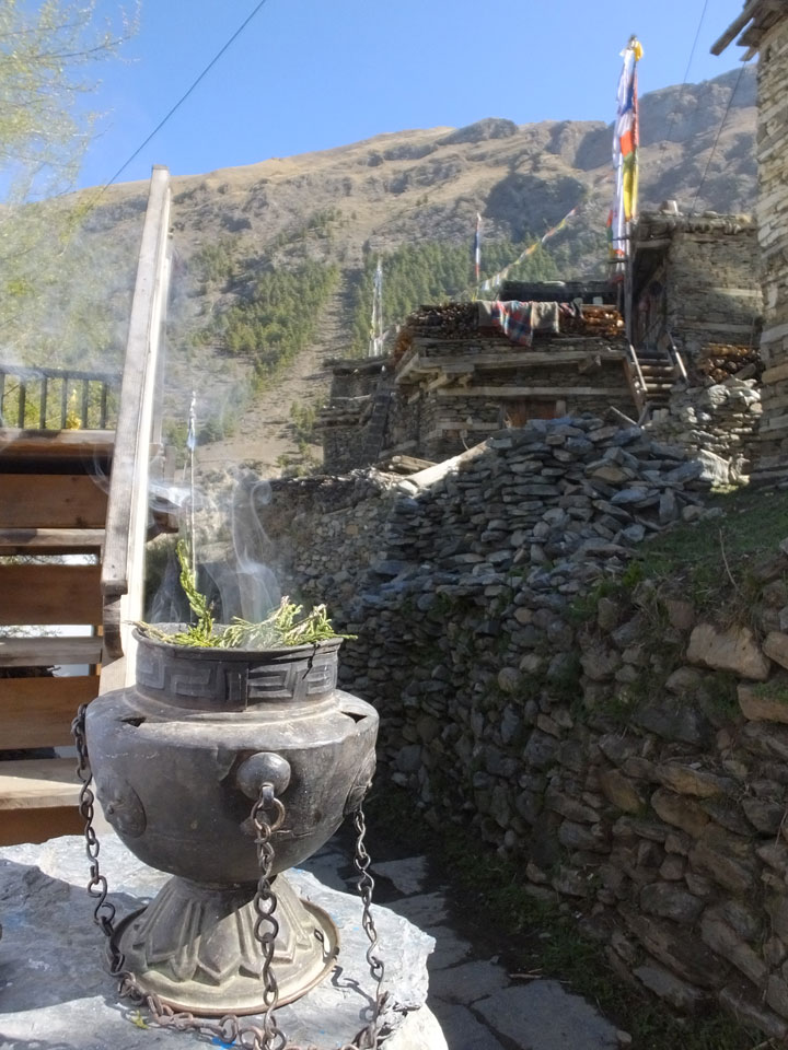 Die Rechnung für mein Essen belief sich auf 1300 NRP. Irgendwie war ich wieder ganz schon langsam, vergas fast meine nassen T-Shirts. Die feuchten Sachen trocknete ich am Rucksack. So ging es raus aus Lower Pisang und hoch in’s Higher Pisang, wo wir auf einen Thailänder stoßen sollte, dem der Guide abhanden gekommen war.