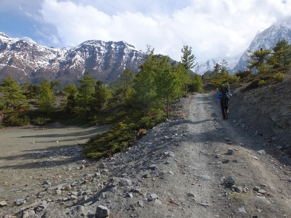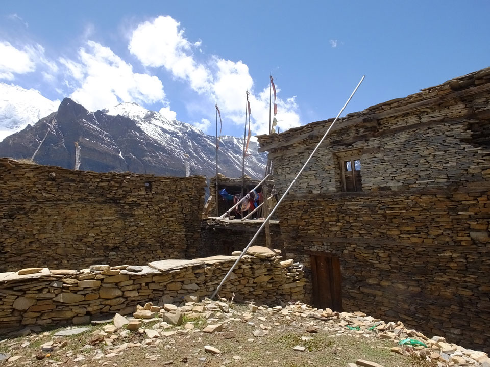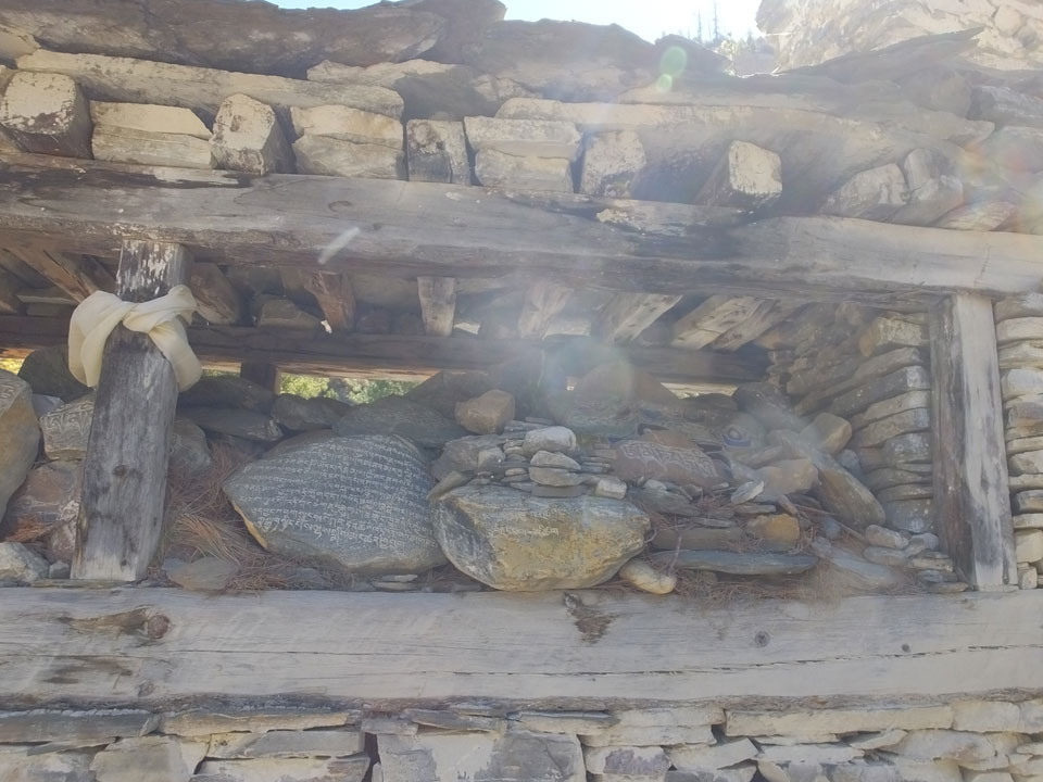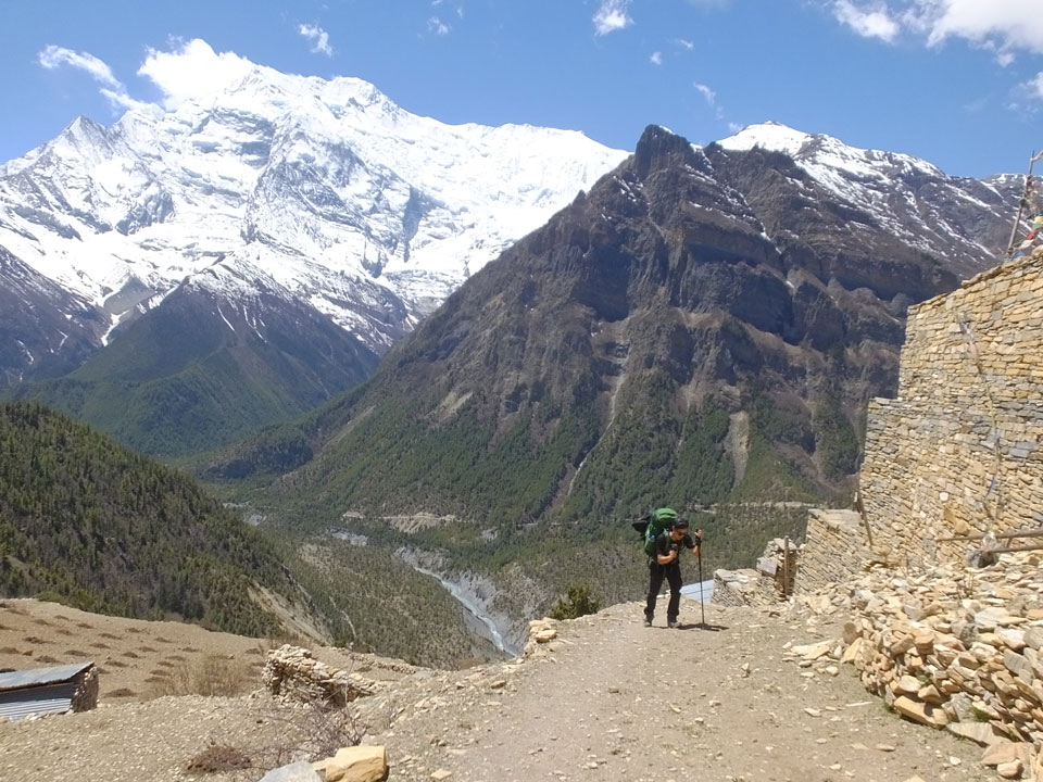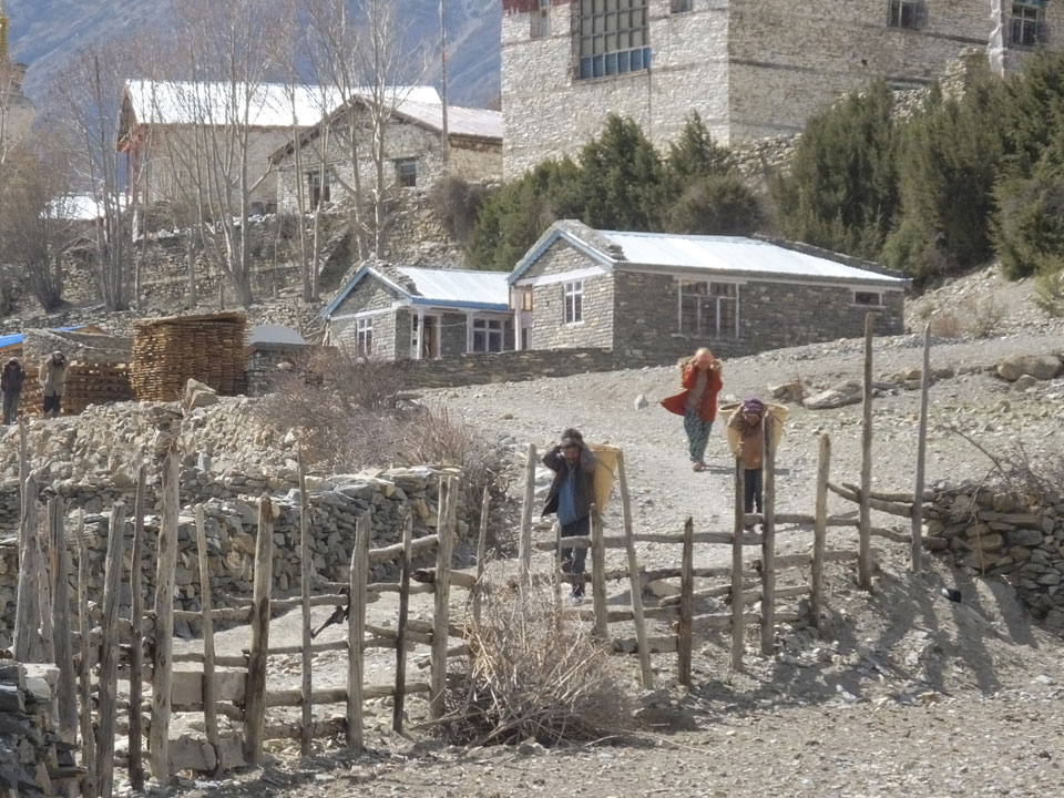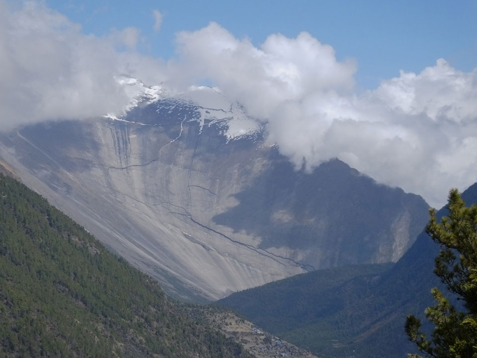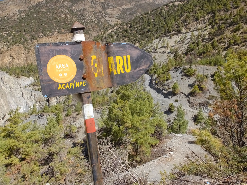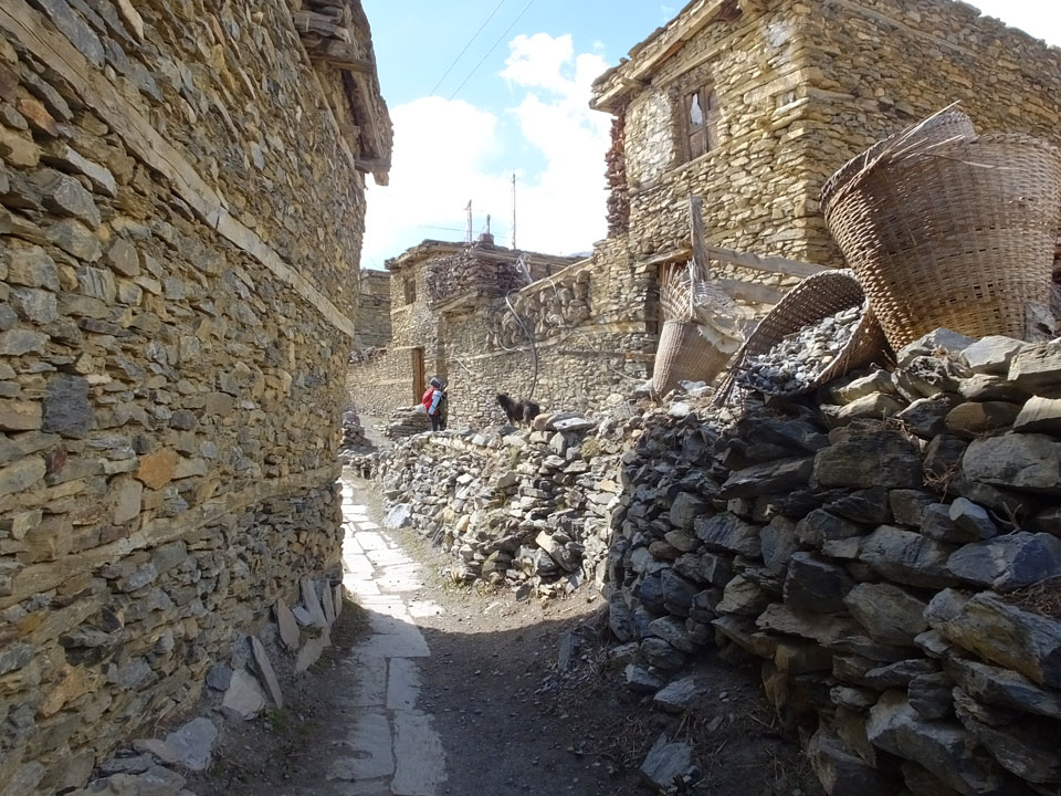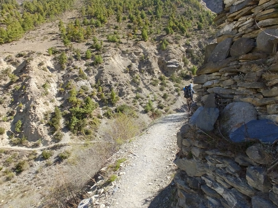 Die Rechnung für mein Essen belief sich auf 1300 NRP. Irgendwie war ich wieder ganz schon langsam, vergas fast meine nassen T-Shirts. Die feuchten Sachen trocknete ich am Rucksack. So ging es raus aus Lower Pisang und hoch in’s Higher Pisang, wo wir auf einen Thailänder stoßen sollte, dem der Guide abhanden gekommen war.