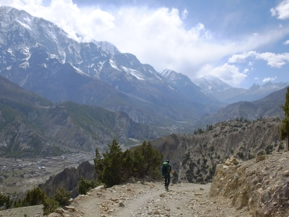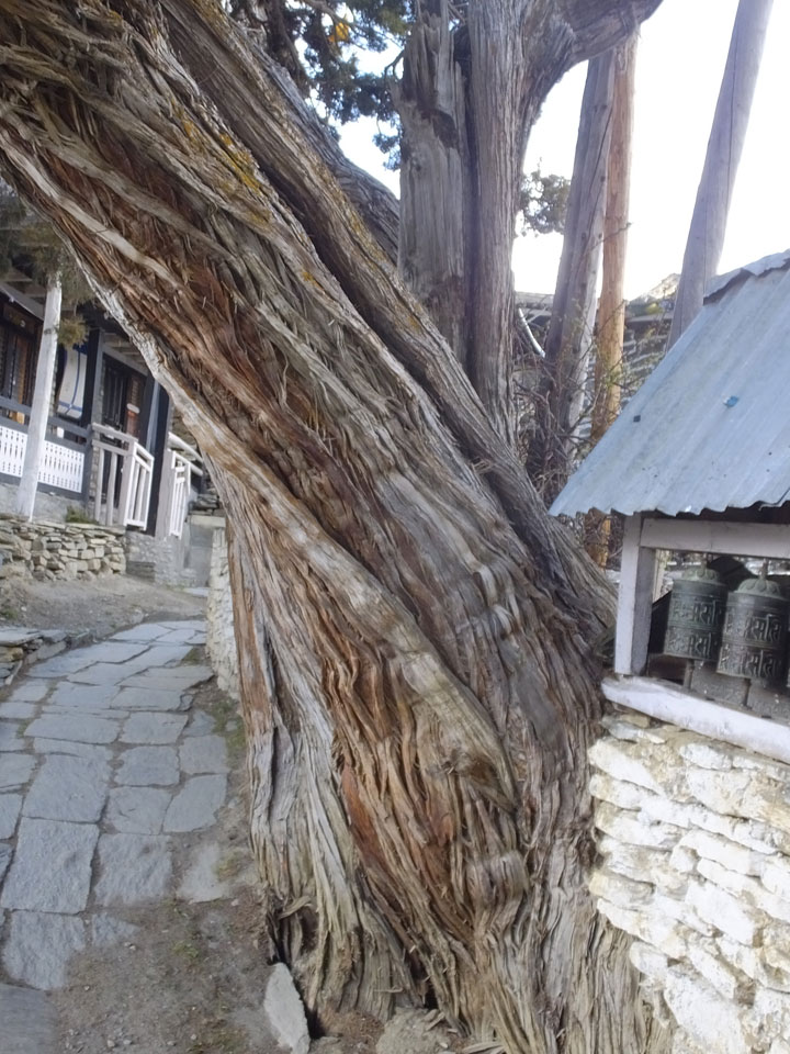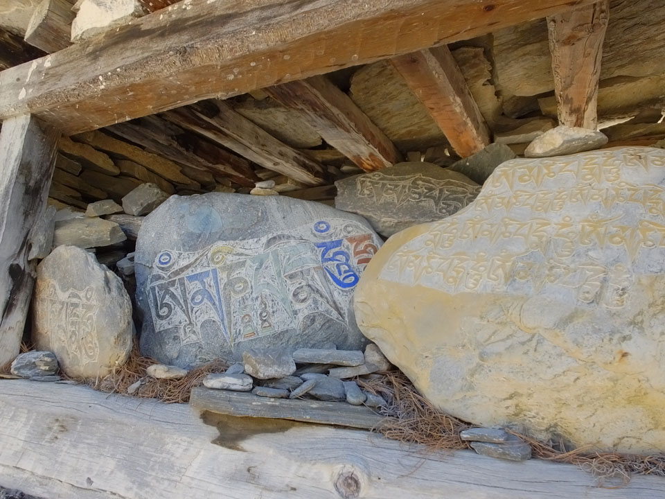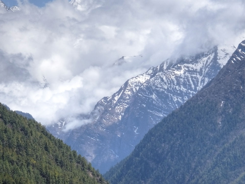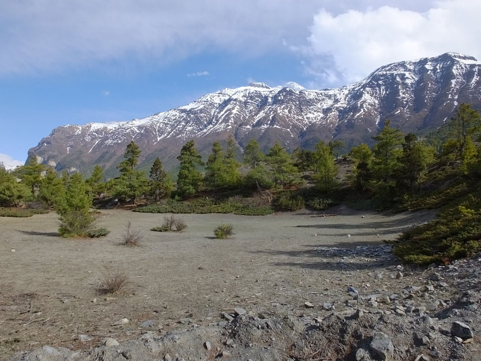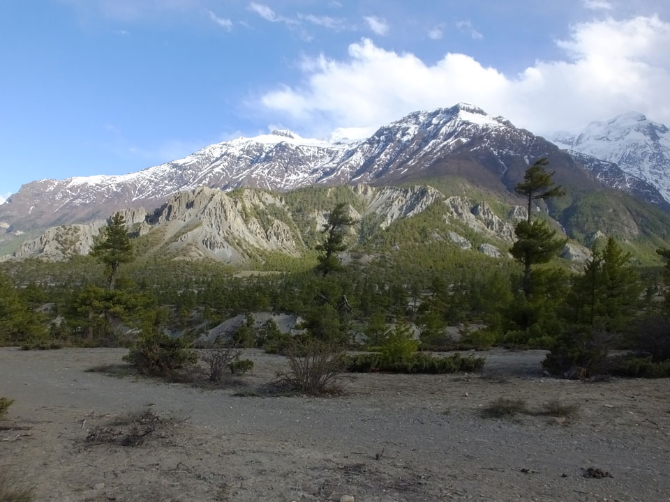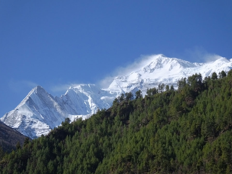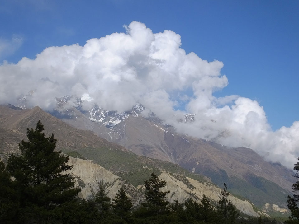 Die Rechnung für mein Essen belief sich auf 1300 NRP. Irgendwie war ich wieder ganz schon langsam, vergas fast meine nassen T-Shirts. Die feuchten Sachen trocknete ich am Rucksack. So ging es raus aus Lower Pisang und hoch in’s Higher Pisang, wo wir auf einen Thailänder stoßen sollte, dem der Guide abhanden gekommen war.
