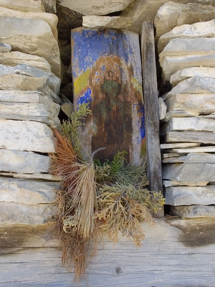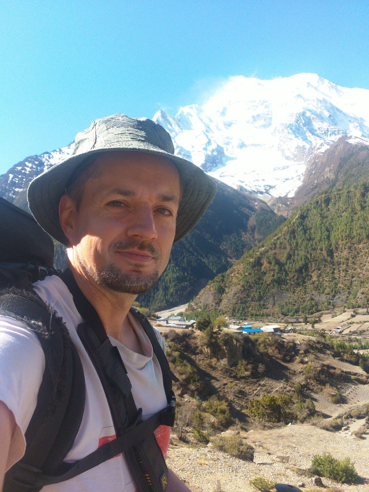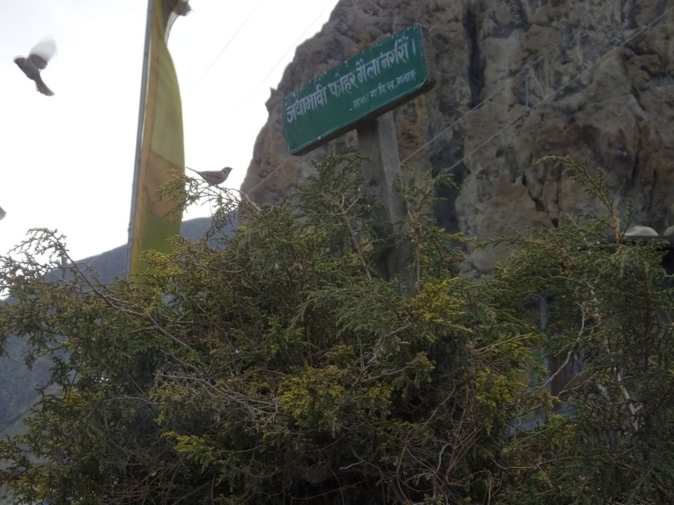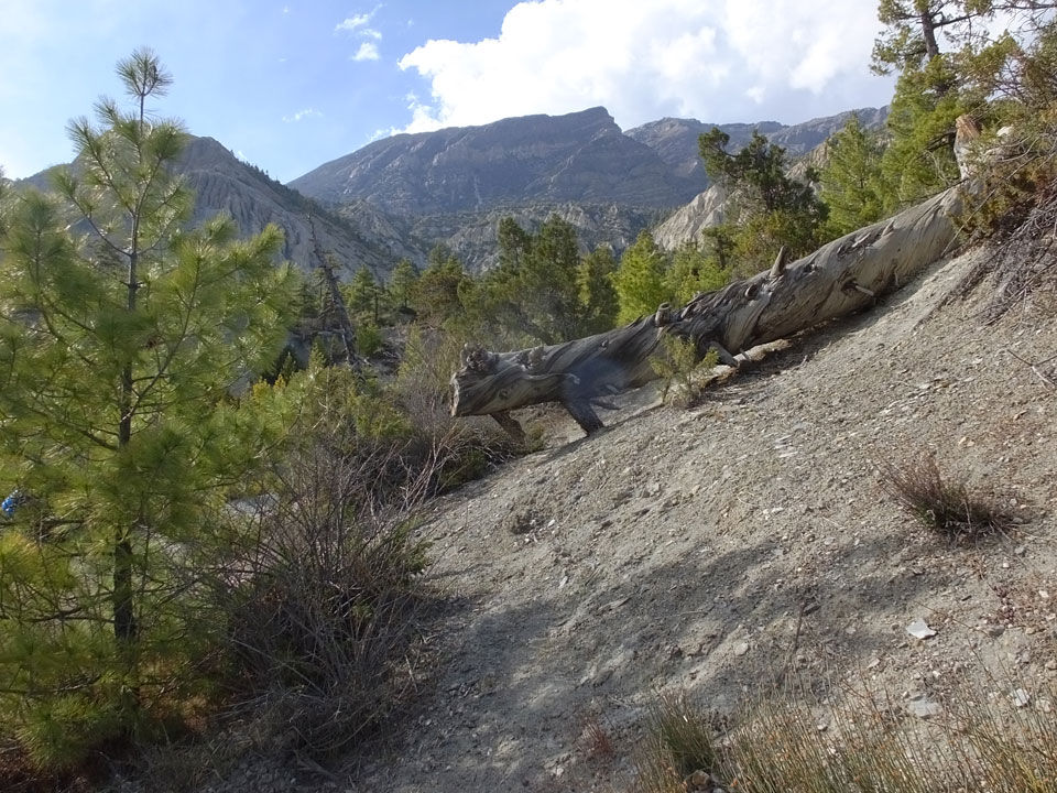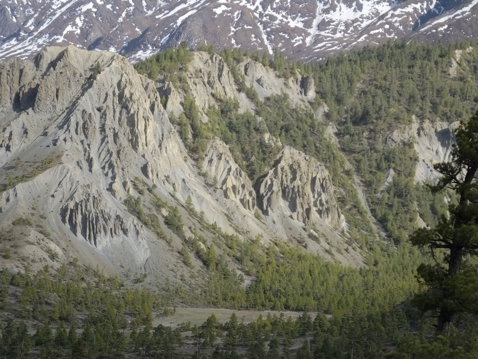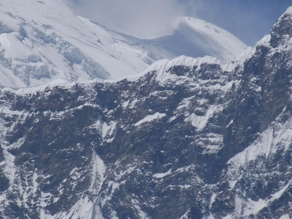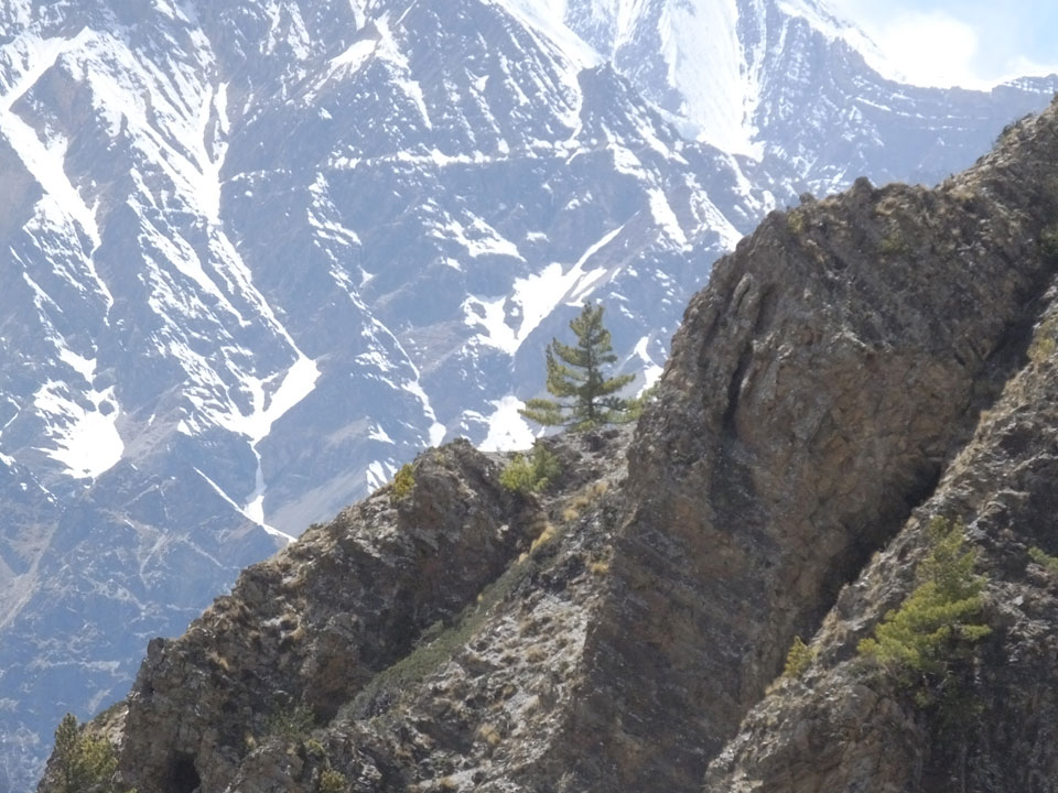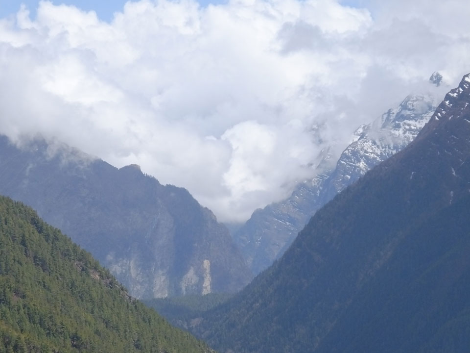 Die Rechnung für mein Essen belief sich auf 1300 NRP. Irgendwie war ich wieder ganz schon langsam, vergas fast meine nassen T-Shirts. Die feuchten Sachen trocknete ich am Rucksack. So ging es raus aus Lower Pisang und hoch in’s Higher Pisang, wo wir auf einen Thailänder stoßen sollte, dem der Guide abhanden gekommen war.