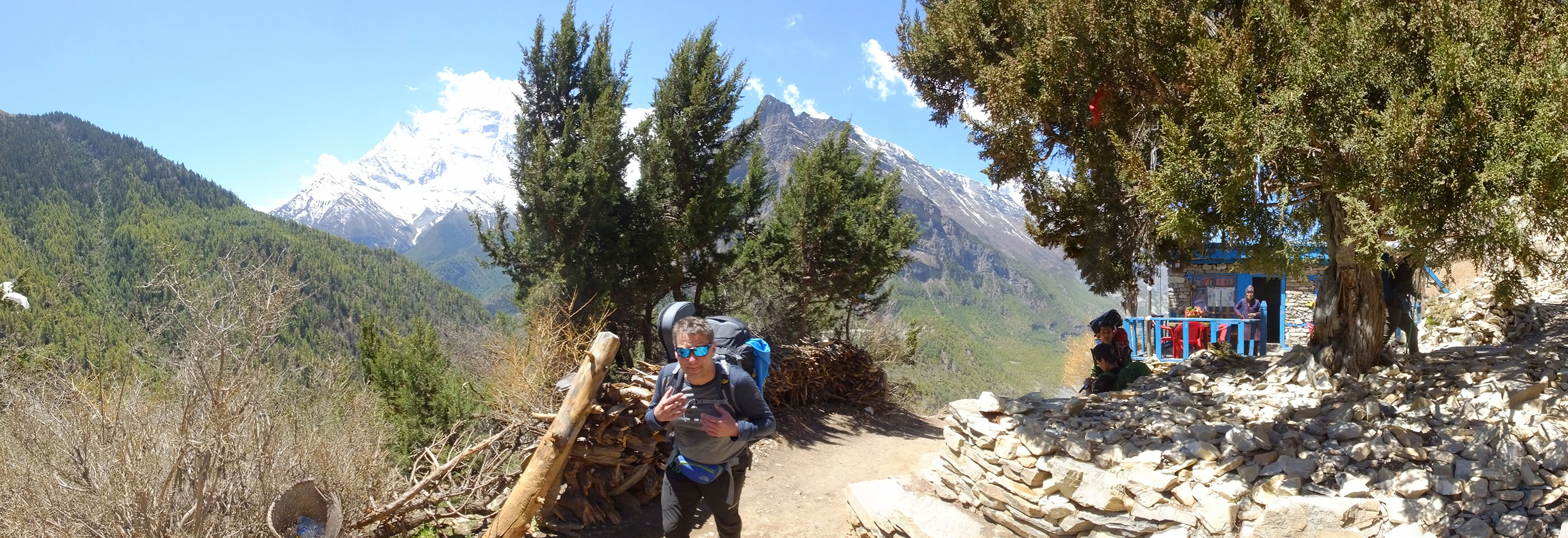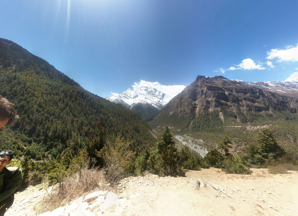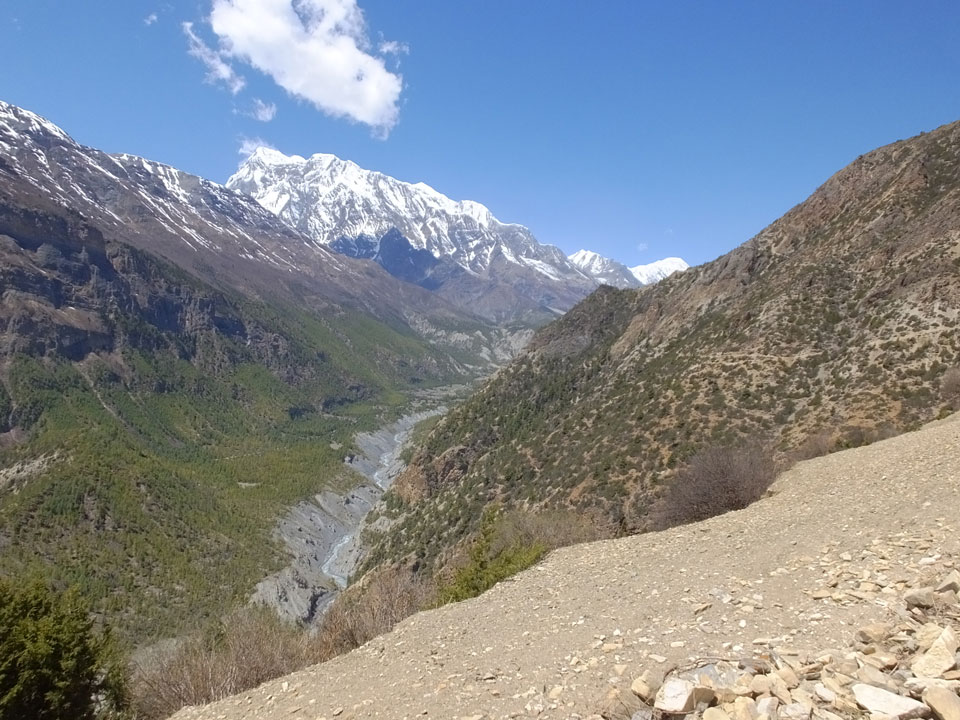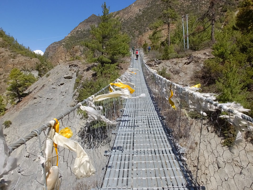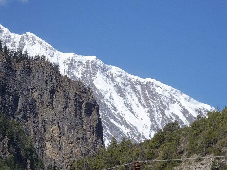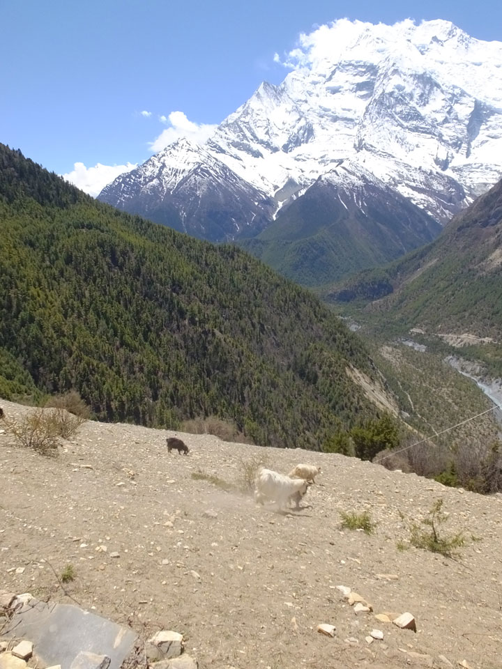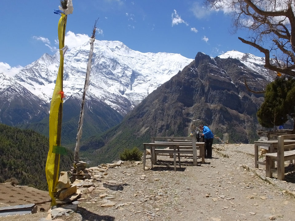 Die Aussicht und das Wetter heute morgen war wieder fantastisch. Der Klare blaue Himmel bot eine super Aussicht auf Annapurna 2. Wir liefen weiter auf der Route nach Manang und bekamen dann auch gleich den schwersten Teil der Strecke zu spüren. Gleich an einer Brücke passierte mir ein Missgeschick. Ich filmte und mein Wanderstock verhakte sich im Maschendraht. Das untere Stück flog von der Brücke. Ich rief kurz nach den 3 vorausgelaufenen Leuten. Sie kamen zurück und ich fand das Stück, baute den Wanderstock wieder zusammen. Wieder mal gut gegangen, da der Stock eine kleine Erleichterung ist. Es ging dann im Zick-zack-Kurs den Berg hoch. Viele Höhenmeter bekamen wir so unter die Füße. Oben dann eine Verschnaufpause und trotz nicht mal 12, entschieden wir uns für Mittagessen.